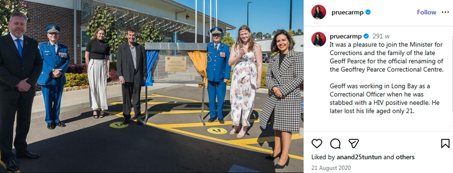 There was no clear motive for the attack: colleagues and inmates alike described Pearce as a ‘gentle giant’ who came to the job “with no ego” and was genuinely committed to assisting inmate rehabilitation. Diagnosed HIV positive following the incident, he nonetheless returned to duty and turned his diagnosis and the publicity surrounding the assault into a platform for education, confronting the fear and stigma of the early 1990s by demonstrating that people living with HIV were not contagious in everyday settings and could lead relatively normal lives. His consequential advocacy left such a profound mark in a short time that he was awarded the Medal of the Order of Australia in 1998 and, in 2020, had a correctional facility named in his honour: the Geoffrey Pearce Correctional Centre.