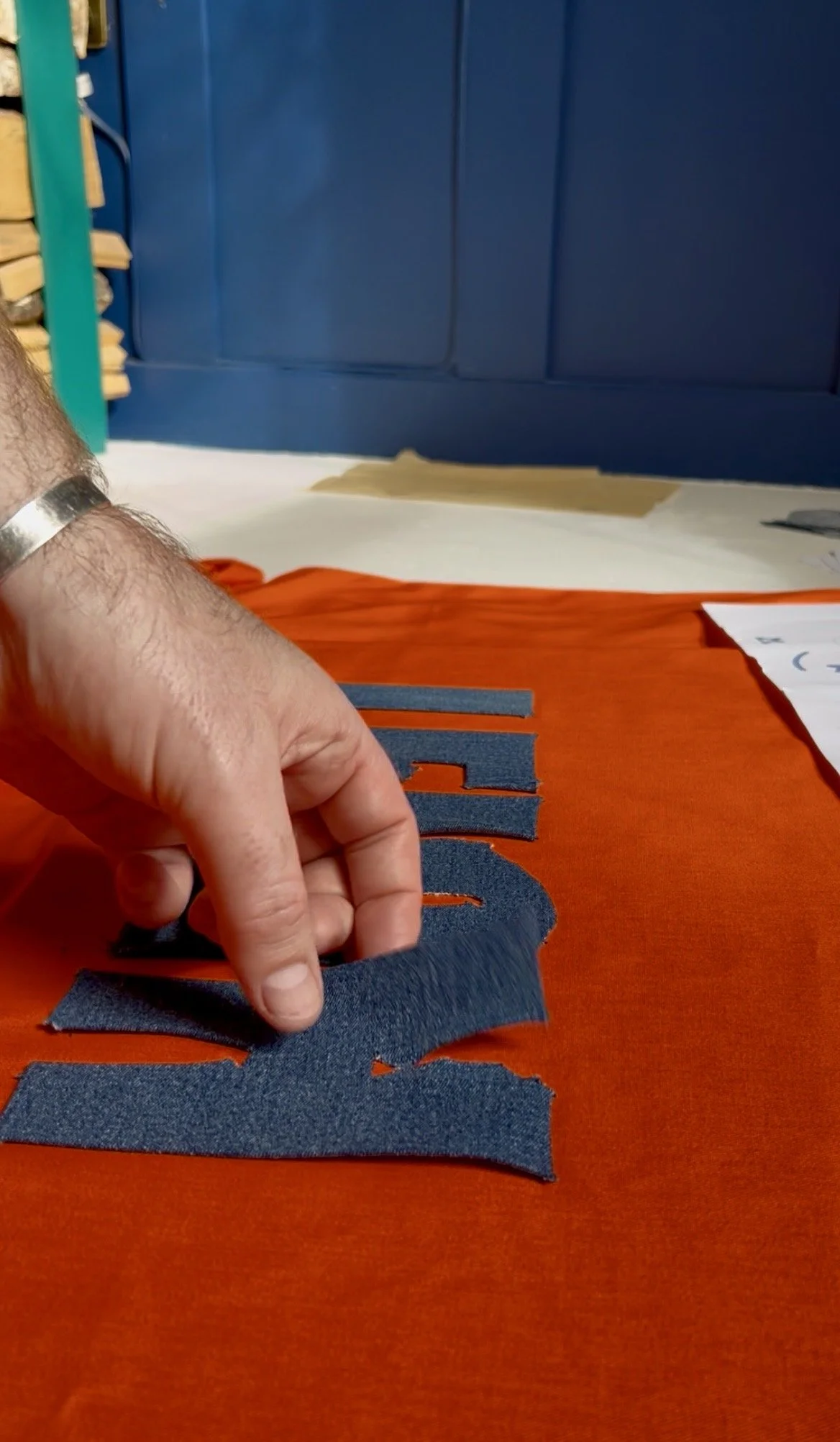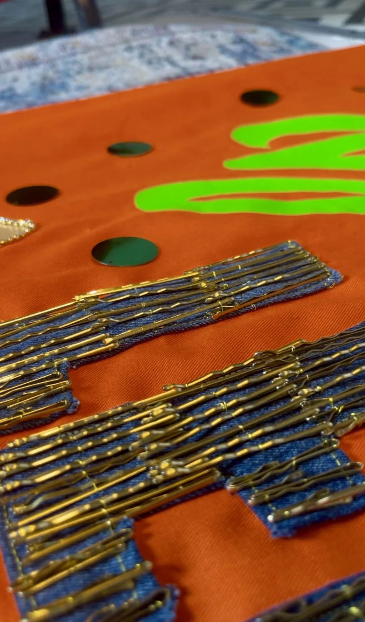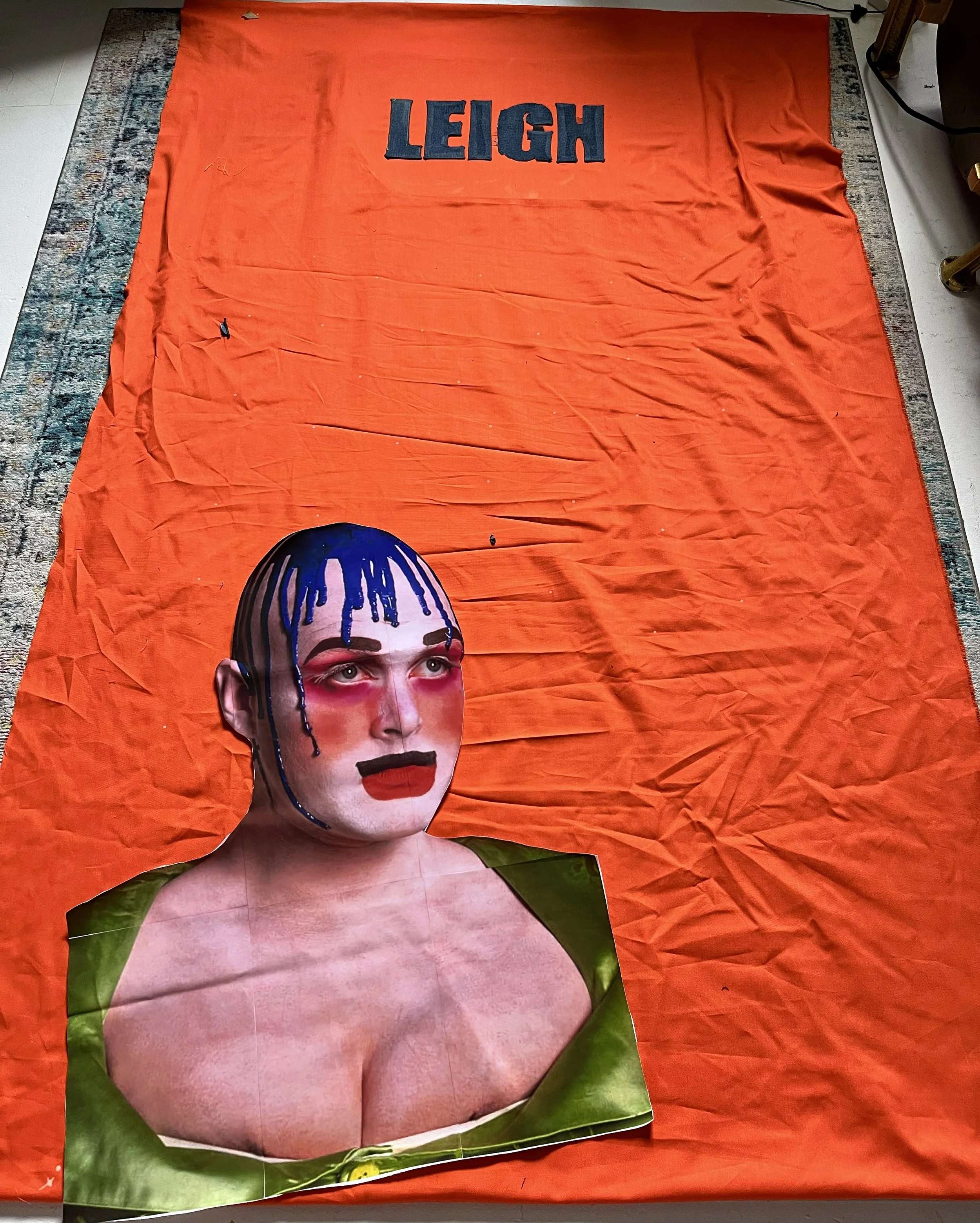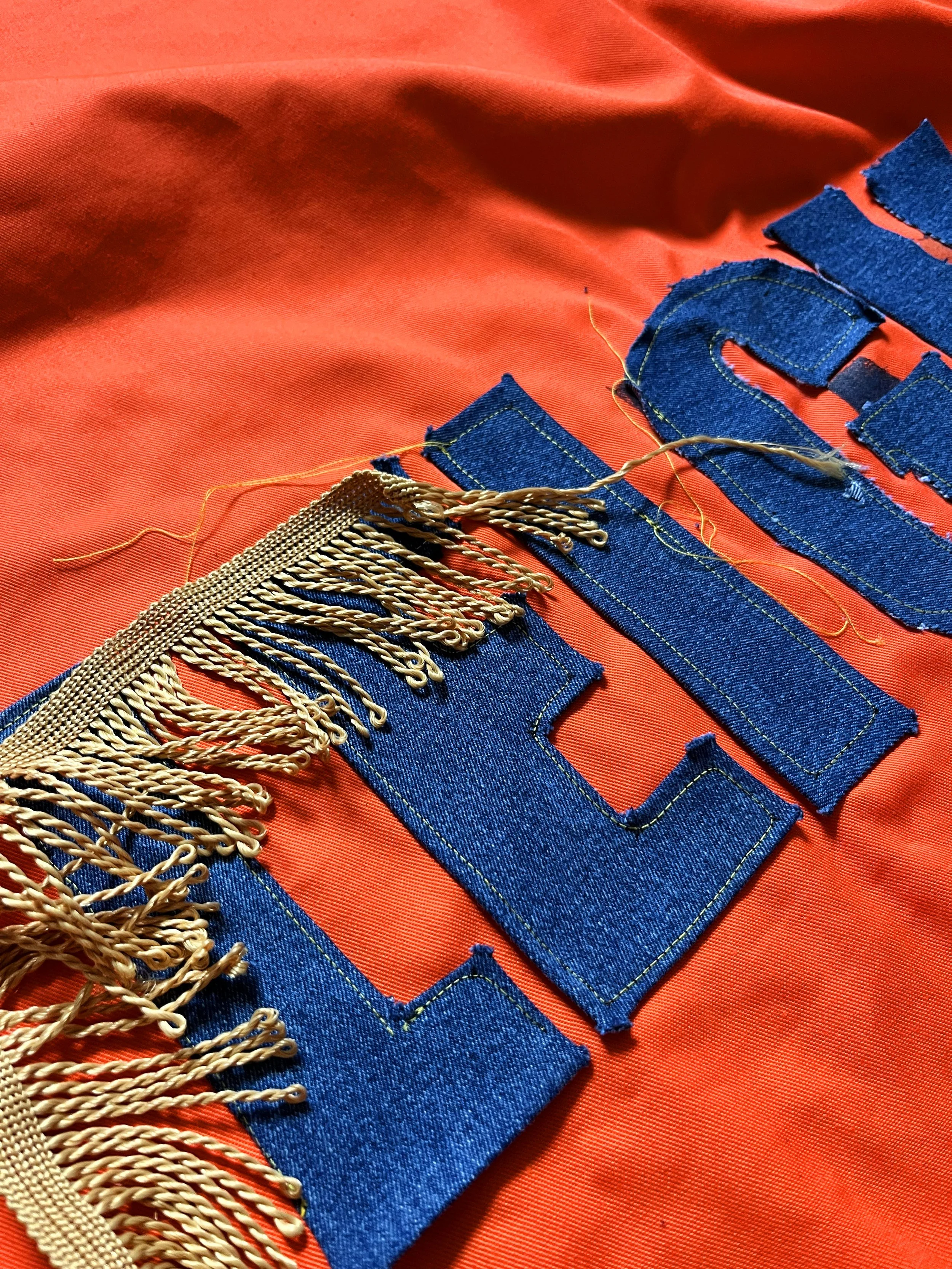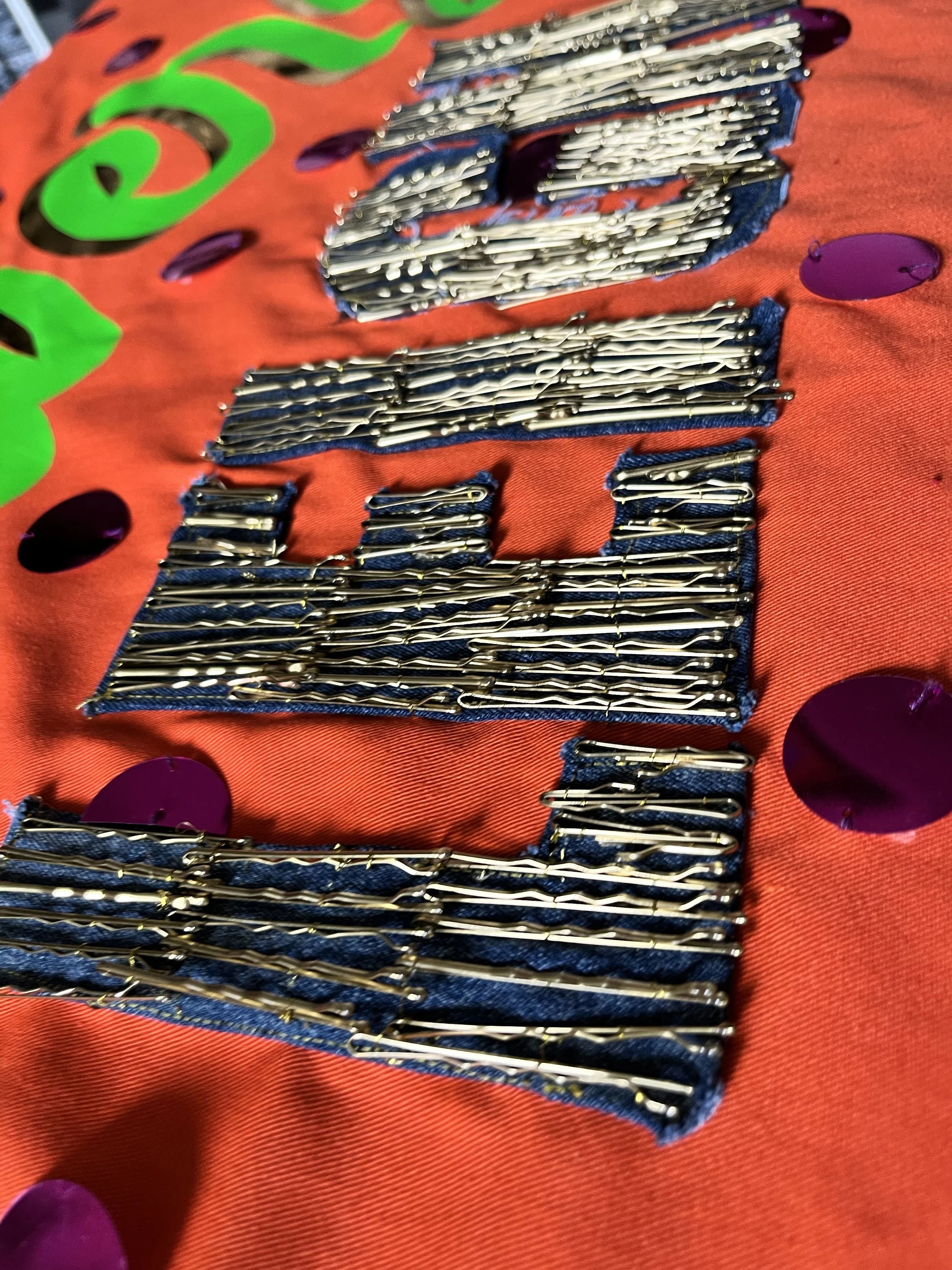 I cut ‘LEIGH’ from denim jeans and embellished the letters with gold hair grips, a small reference to the denim jacket he once customised for Holly Johnson, so the piece carries quiet, personal gestures that nod to one of his fashion creations.