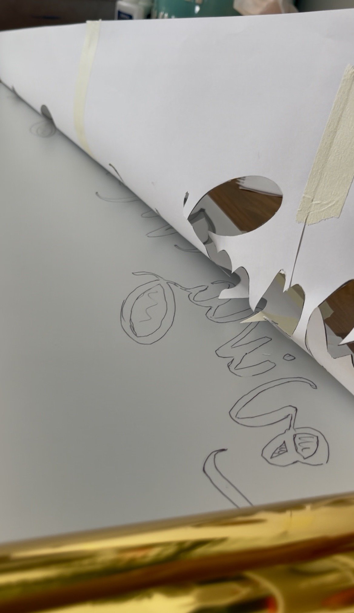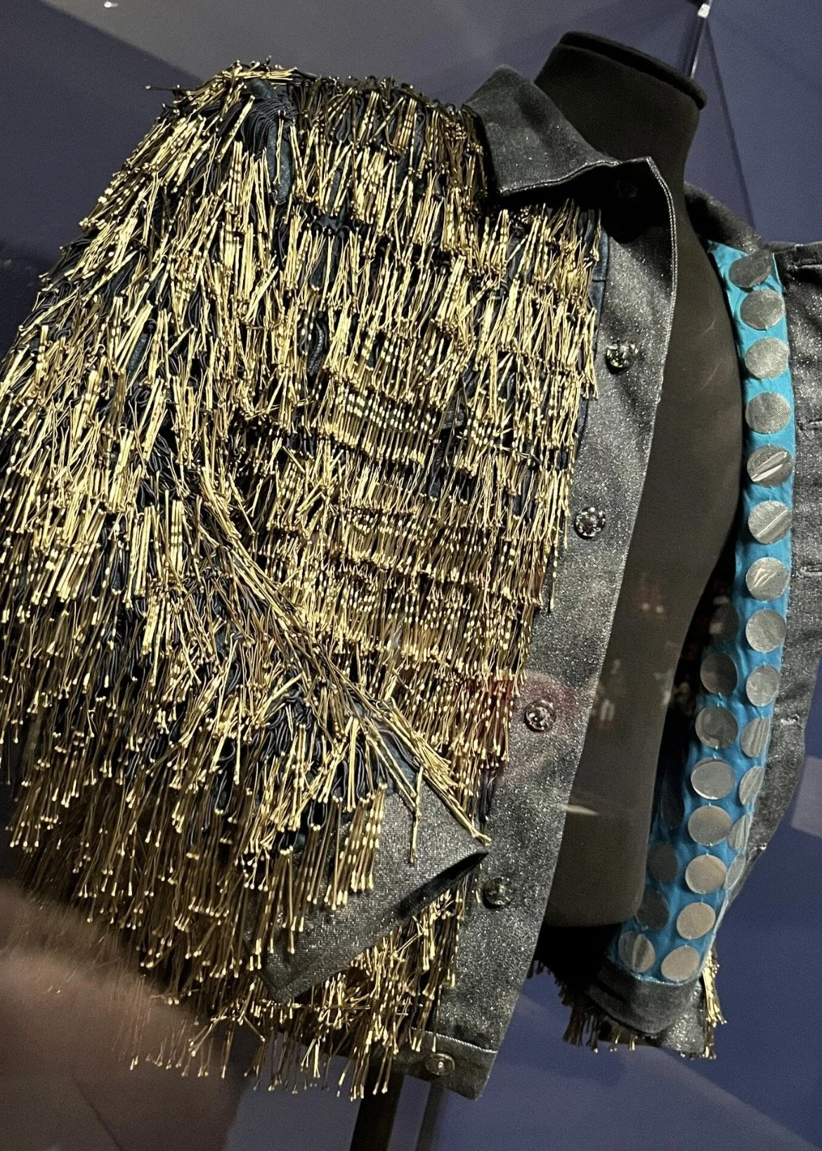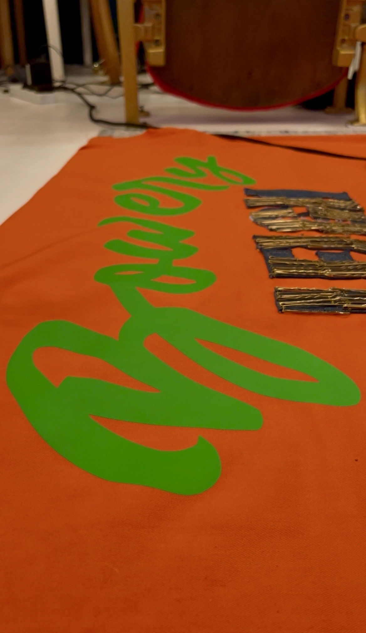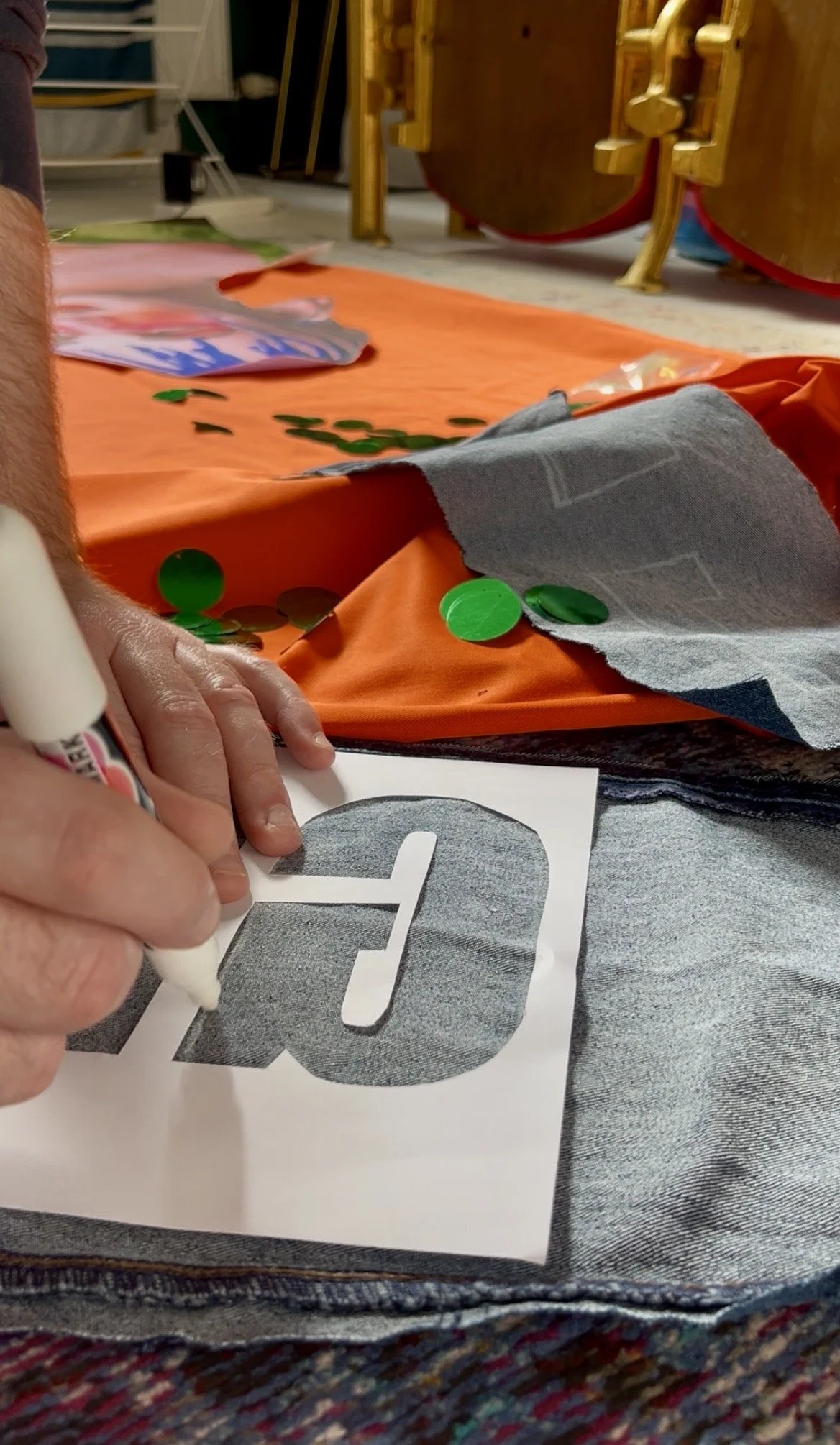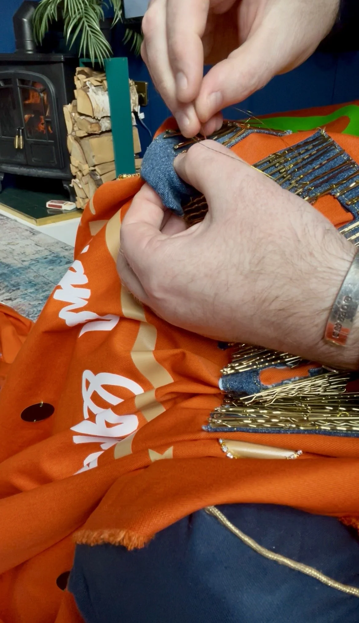 I cut ‘LEIGH’ from denim jeans and embellished the letters with gold hair grips, a small reference to the denim jacket he once customised for Holly Johnson, so the piece carries quiet, personal gestures that nod to one of his fashion creations.