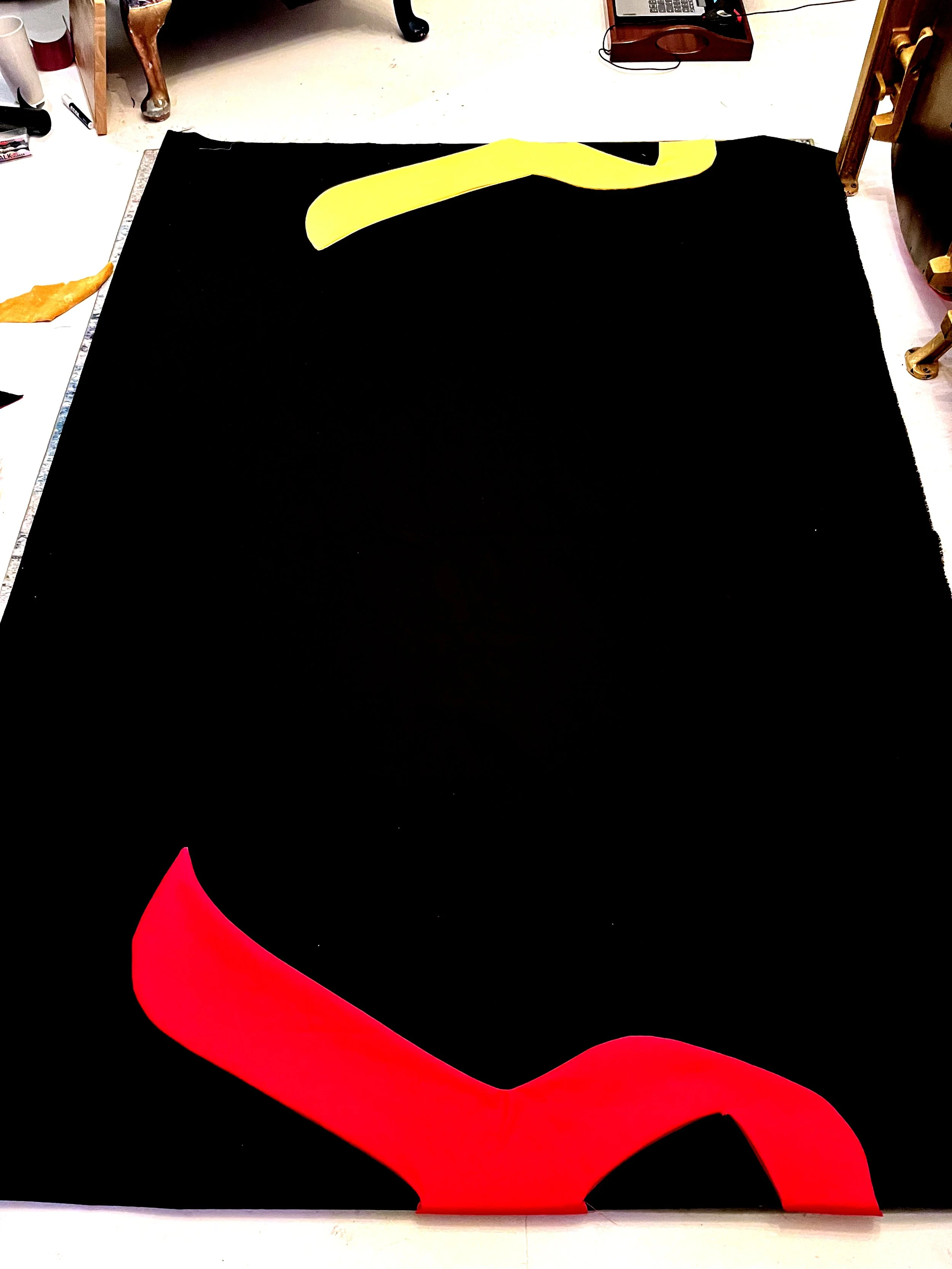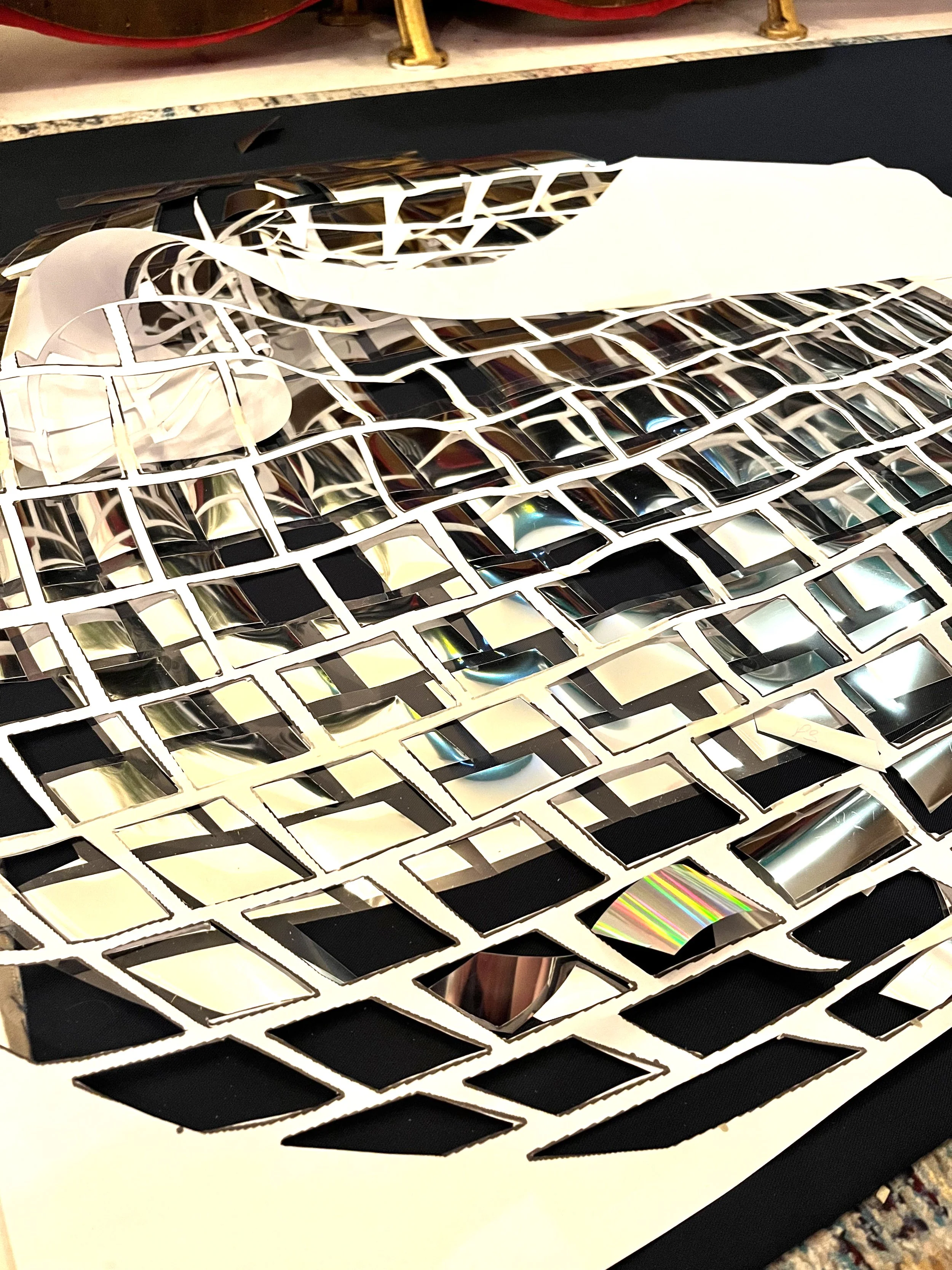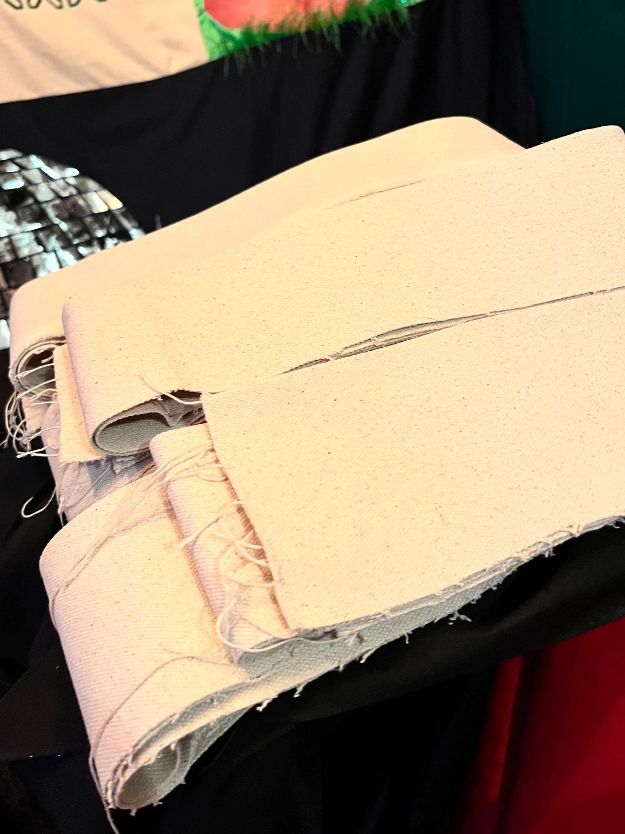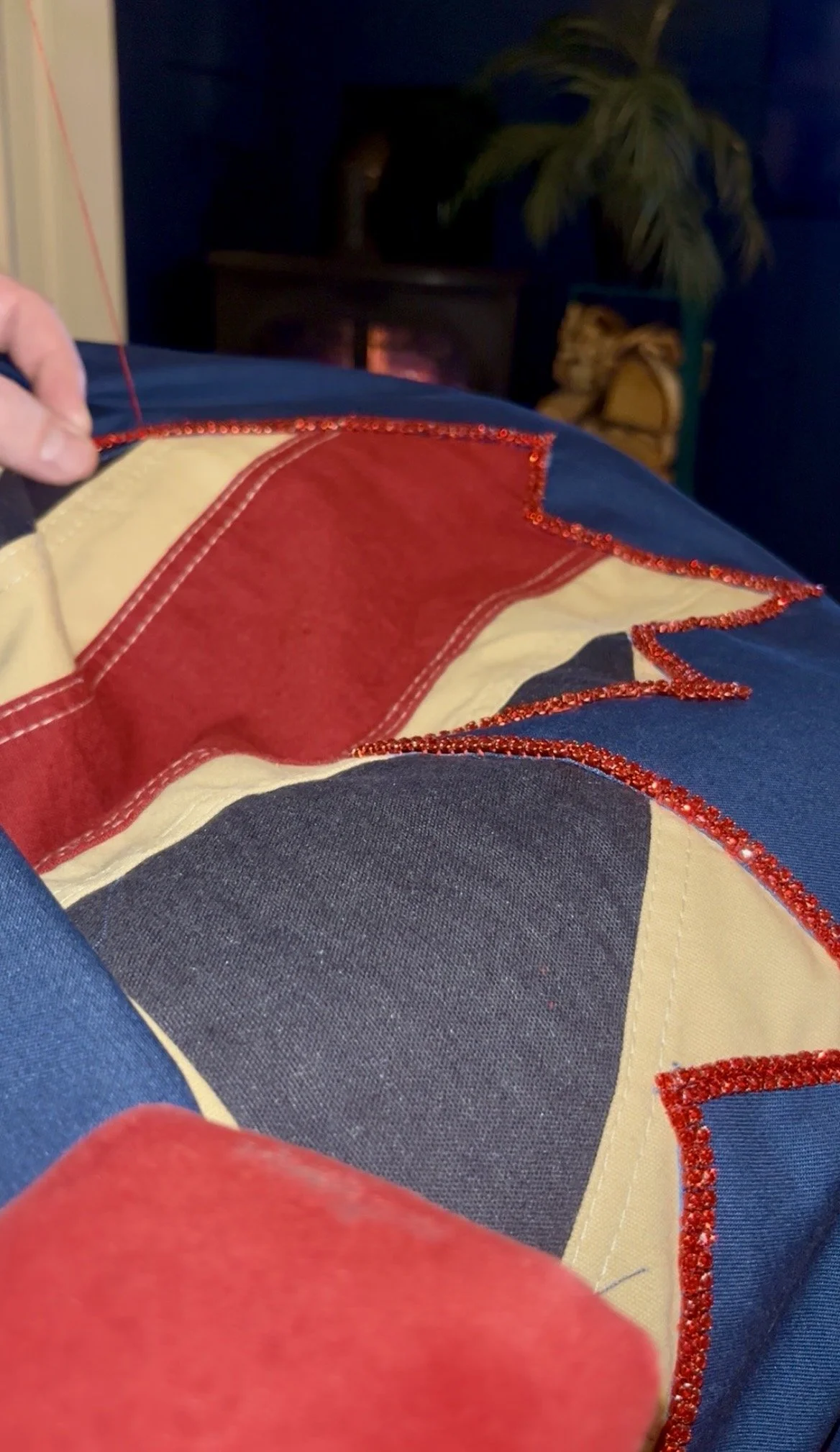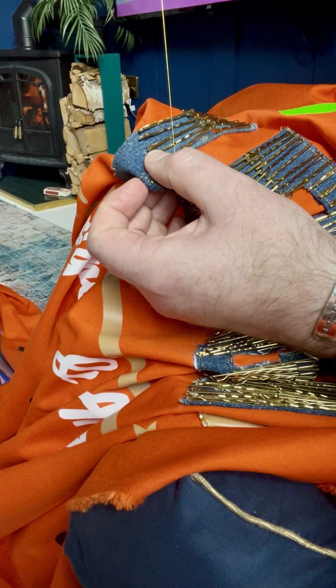 The only problem I had was that the quilt’s three-inch canvas border on every side made the 12 ft piece too large for my 12 ft wall, so I couldn’t photograph it without it looking crinkled and wrinkled; to make matters trickier, I’d only lightly ironed it vertically until the day I came to deliver, and the final prep involved four lint rollers to remove every last fluff and stray thread — a repetitive, almost meditative task that, once finished, felt incredibly satisfying. Further, the quilt was blocking the only 6 ft by 10 ft window in my lounge, so I had no natural light; still, I took several snaps of the quilt, intending to retake better pictures when it goes on display and, hopefully, in natural light.