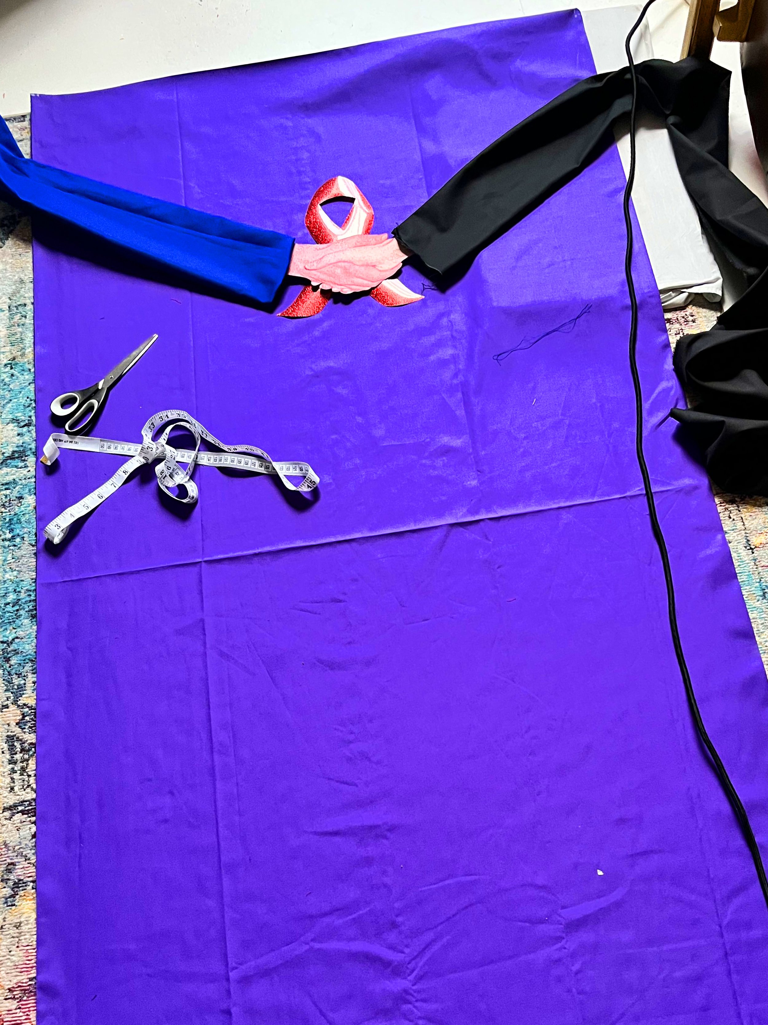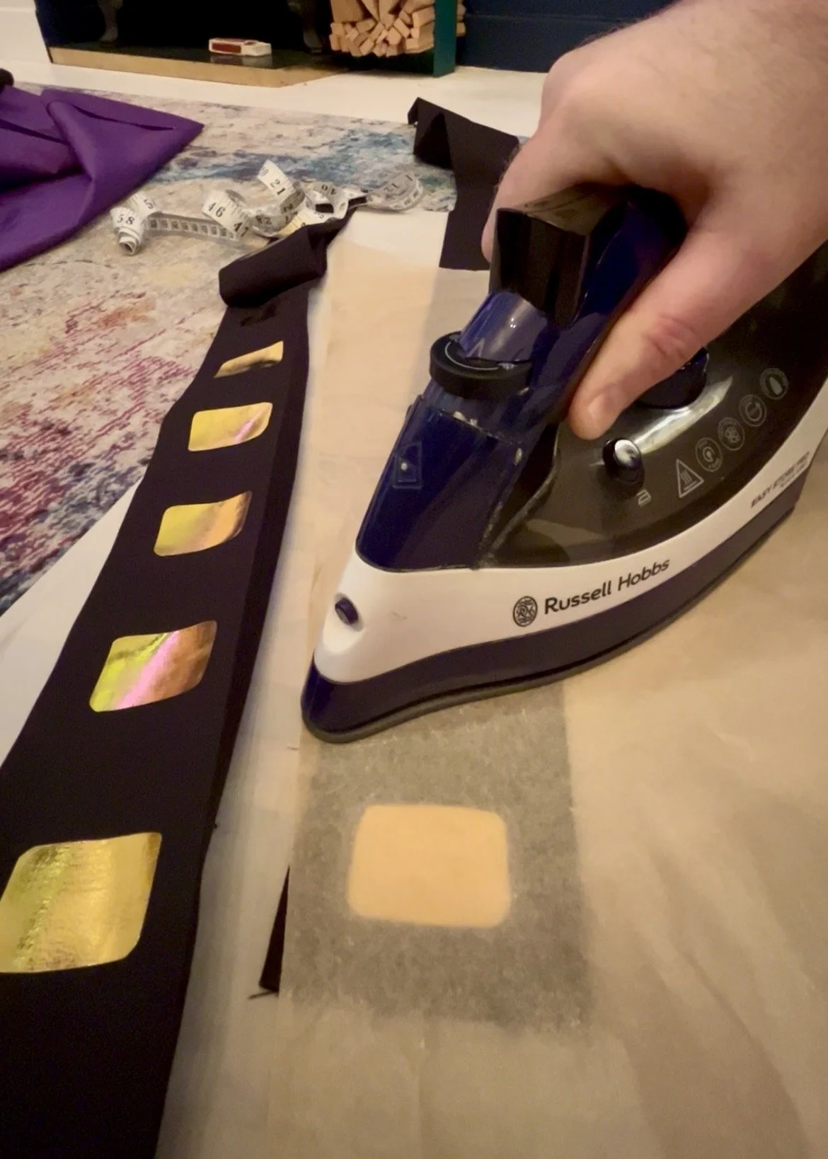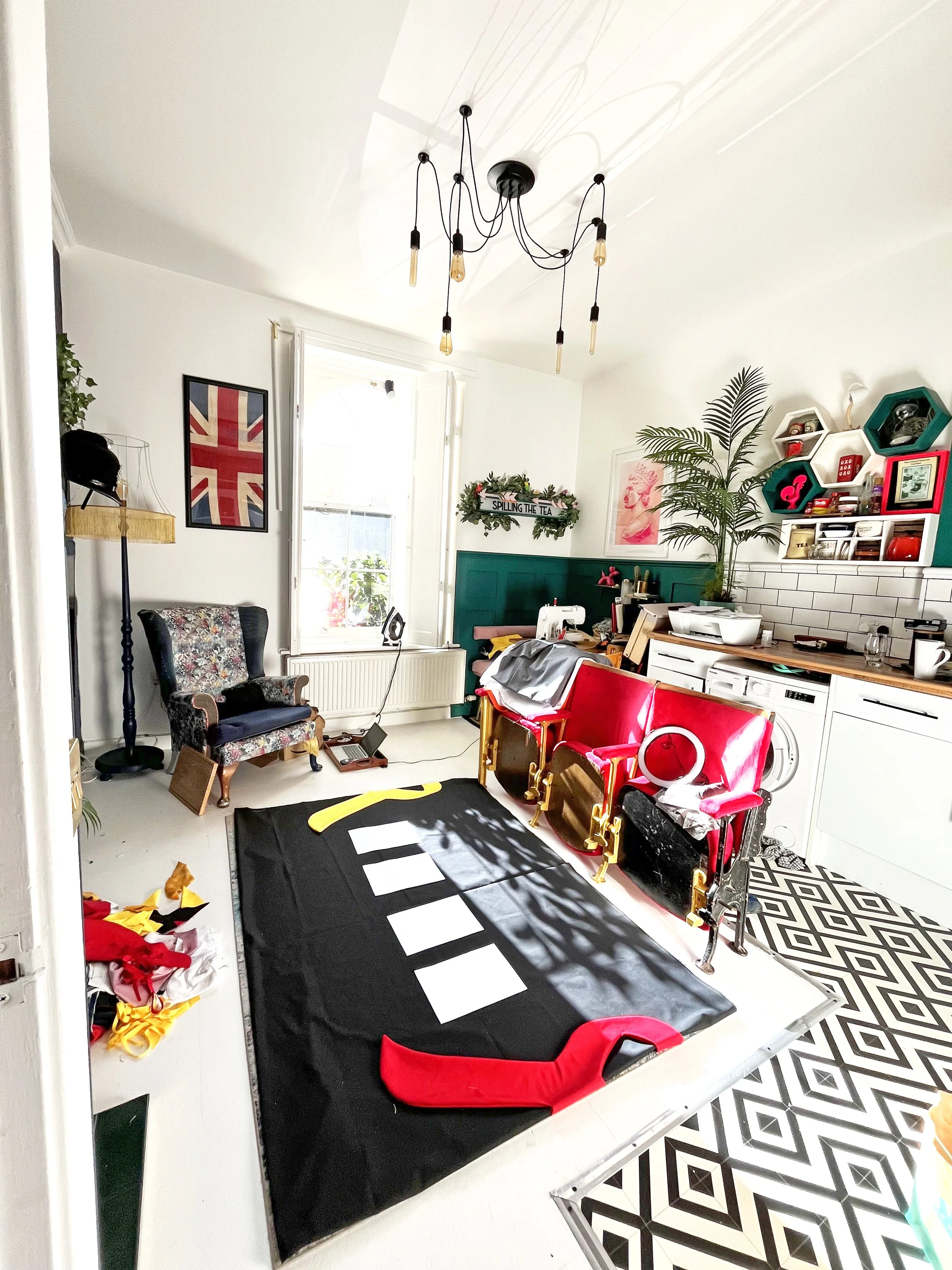 But before that, I had to attach a back to protect the quilt and stop stitches snagging when it was handled or put on display, as well as to give it longevity. I used black cotton for the backing, but my 12 ft by 14 ft lounge comes with fixed units and cinema seats bolted to the floor, so I couldn’t lay the whole quilt out flat to sew on the backing. With almost no sewing experience I had to improvise: the simplest solution was to suspend the entire quilt from the lounge wall, working on it vertical rather than horizontal. This allowed me to align the edges and tack the backing in place before placing my sewing machine table to the quilts edge.