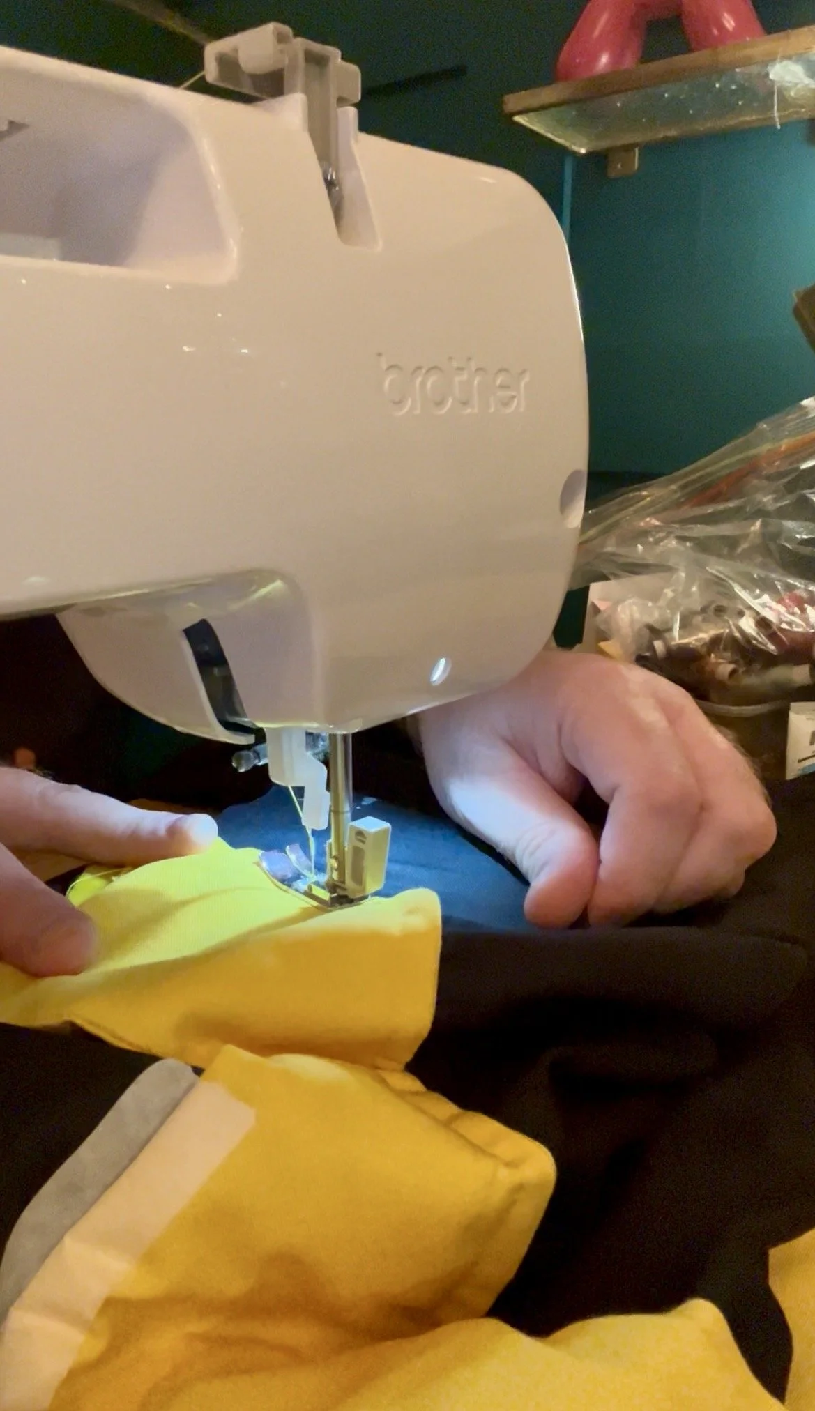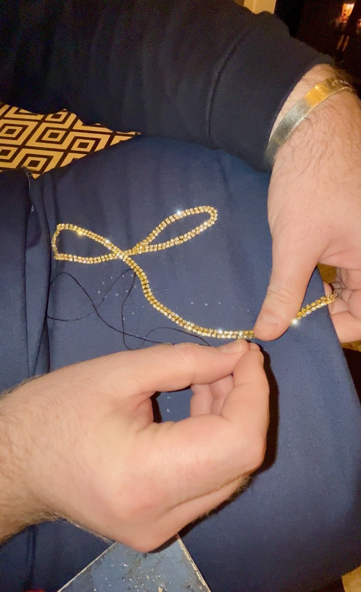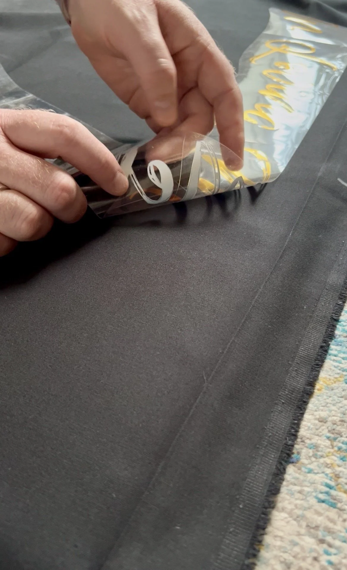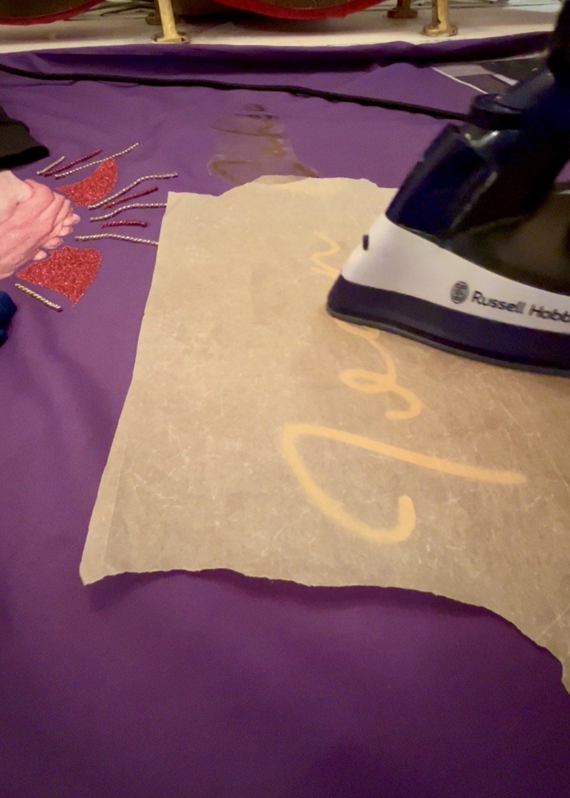 But before that, I had to attach a back to protect the quilt and stop stitches snagging when it was handled or put on display, as well as to give it longevity. I used black cotton for the backing, but my 12 ft by 14 ft lounge comes with fixed units and cinema seats bolted to the floor, so I couldn’t lay the whole quilt out flat to sew on the backing. With almost no sewing experience I had to improvise: the simplest solution was to suspend the entire quilt from the lounge wall, working on it vertical rather than horizontal. This allowed me to align the edges and tack the backing in place before placing my sewing machine table to the quilts edge.