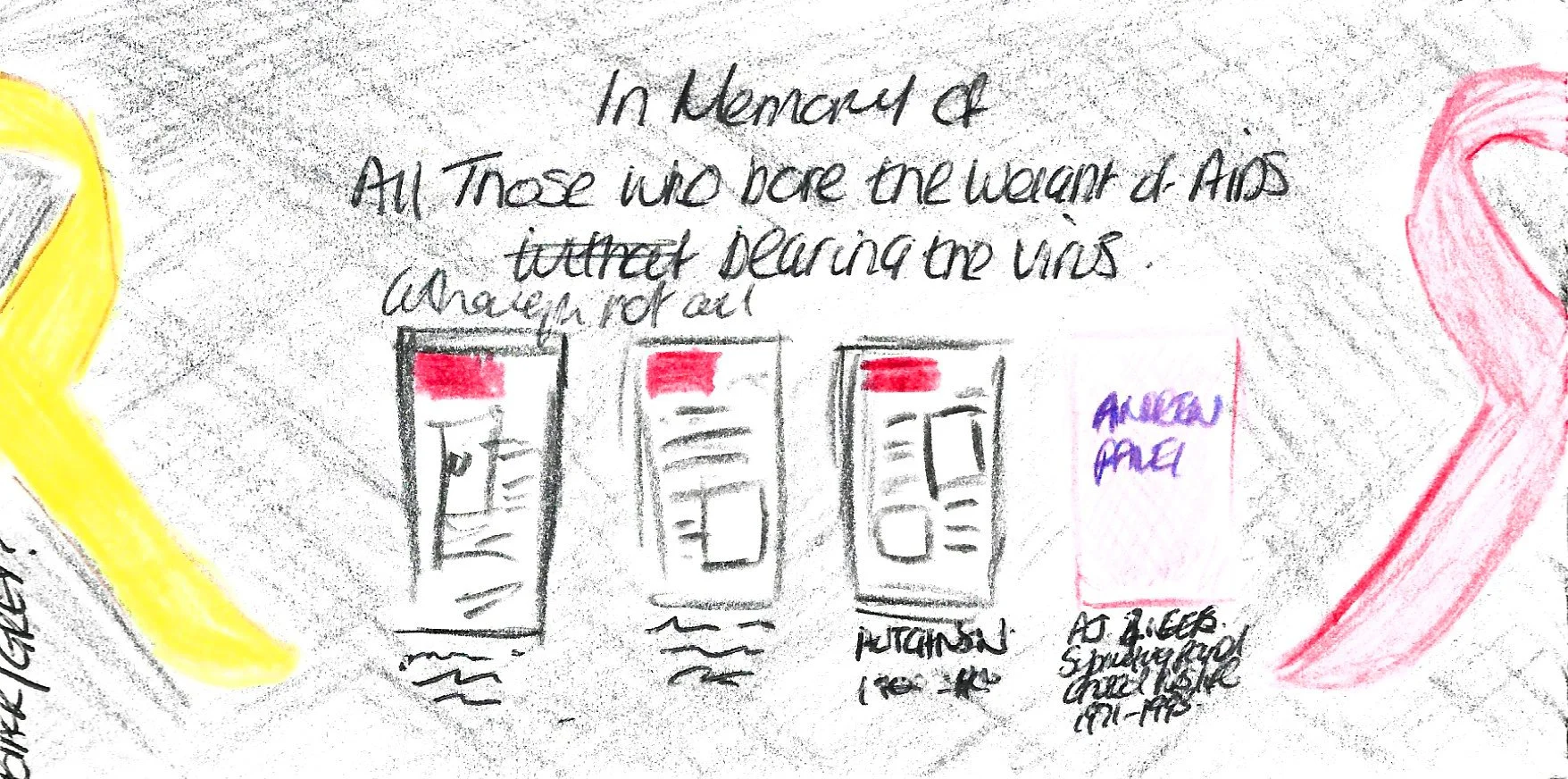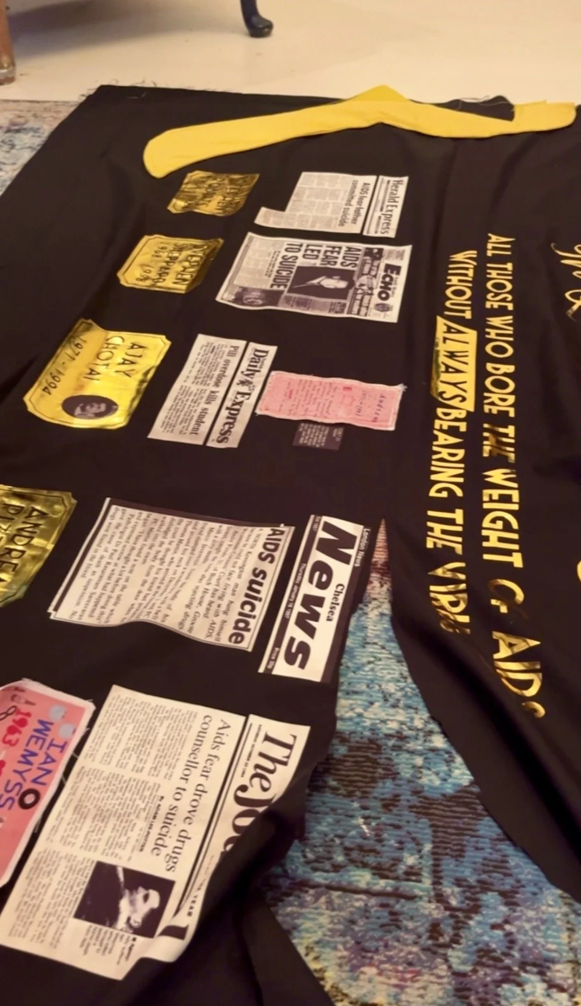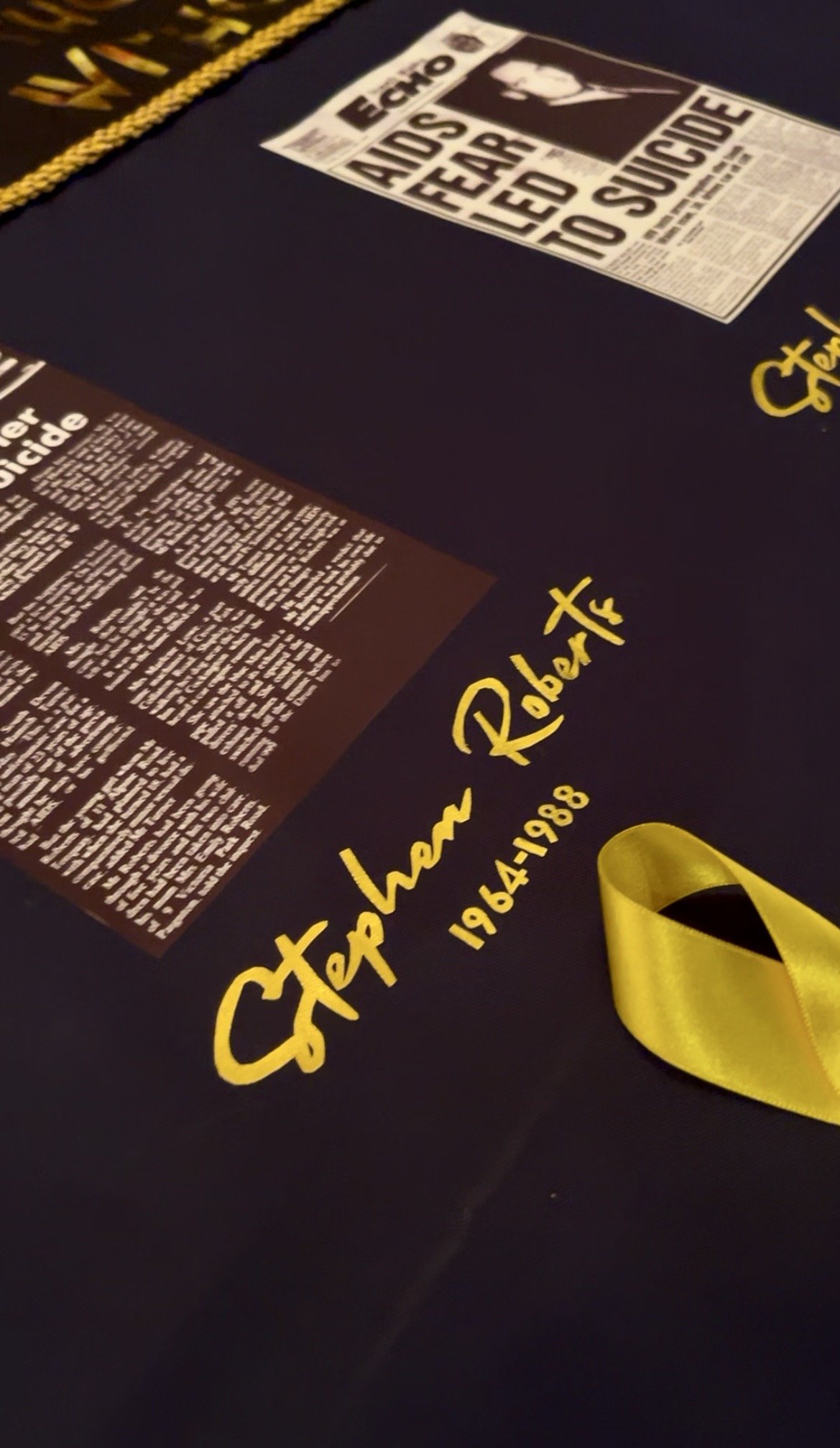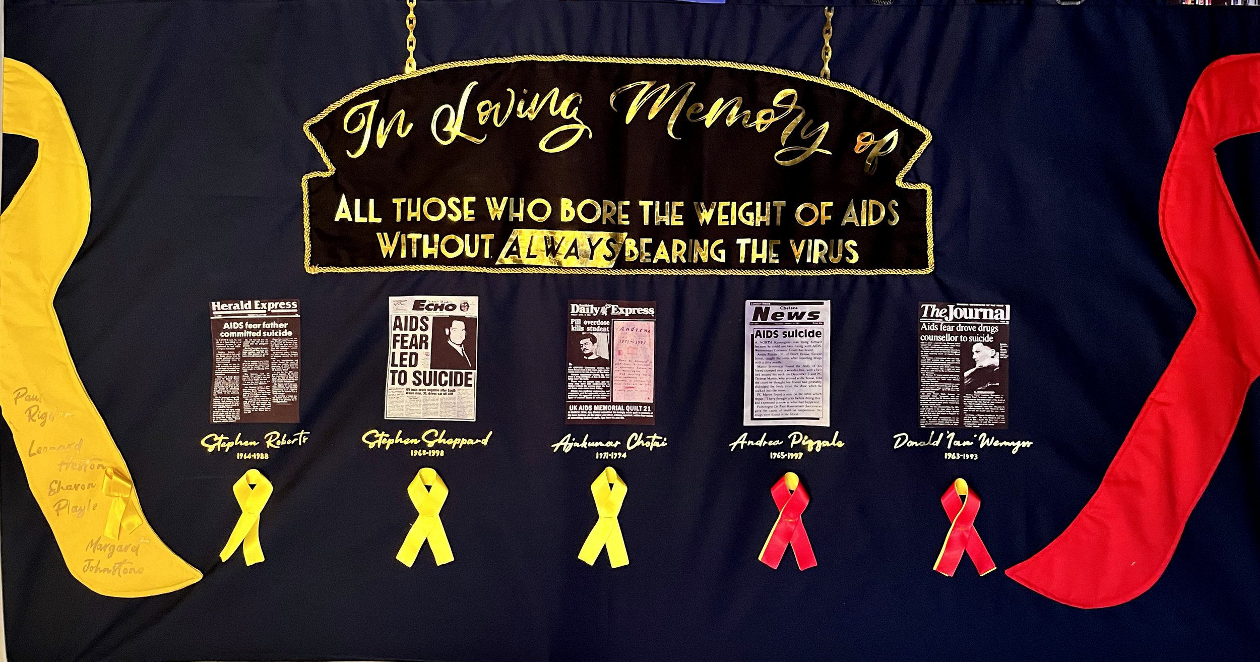 It was for this reason I felt these individuals should form part of the UK AIDS Quilt as a national memorial: the fact some may find the individual stories uncomfortable only strengthens the case for their inclusion. The panel balances symbols of remembrance and prevention — the red ribbon of HIV/AIDS and the yellow ribbon of suicide prevention mirrored on either side — reflecting the dual nature of loss and the urgent need for awareness. To ensure the quilt both educates and shares intimate stories, I included press cuttings for each individual and placed a yellow ribbon beneath every name; where someone had a confirmed HIV/AIDS diagnosis and took their own life, a red and yellow ribbon is intertwined beneath their name, acknowledging both the illness and the circumstances of their death with care and clarity.