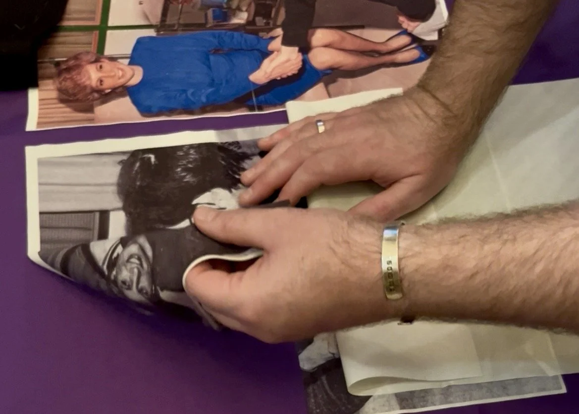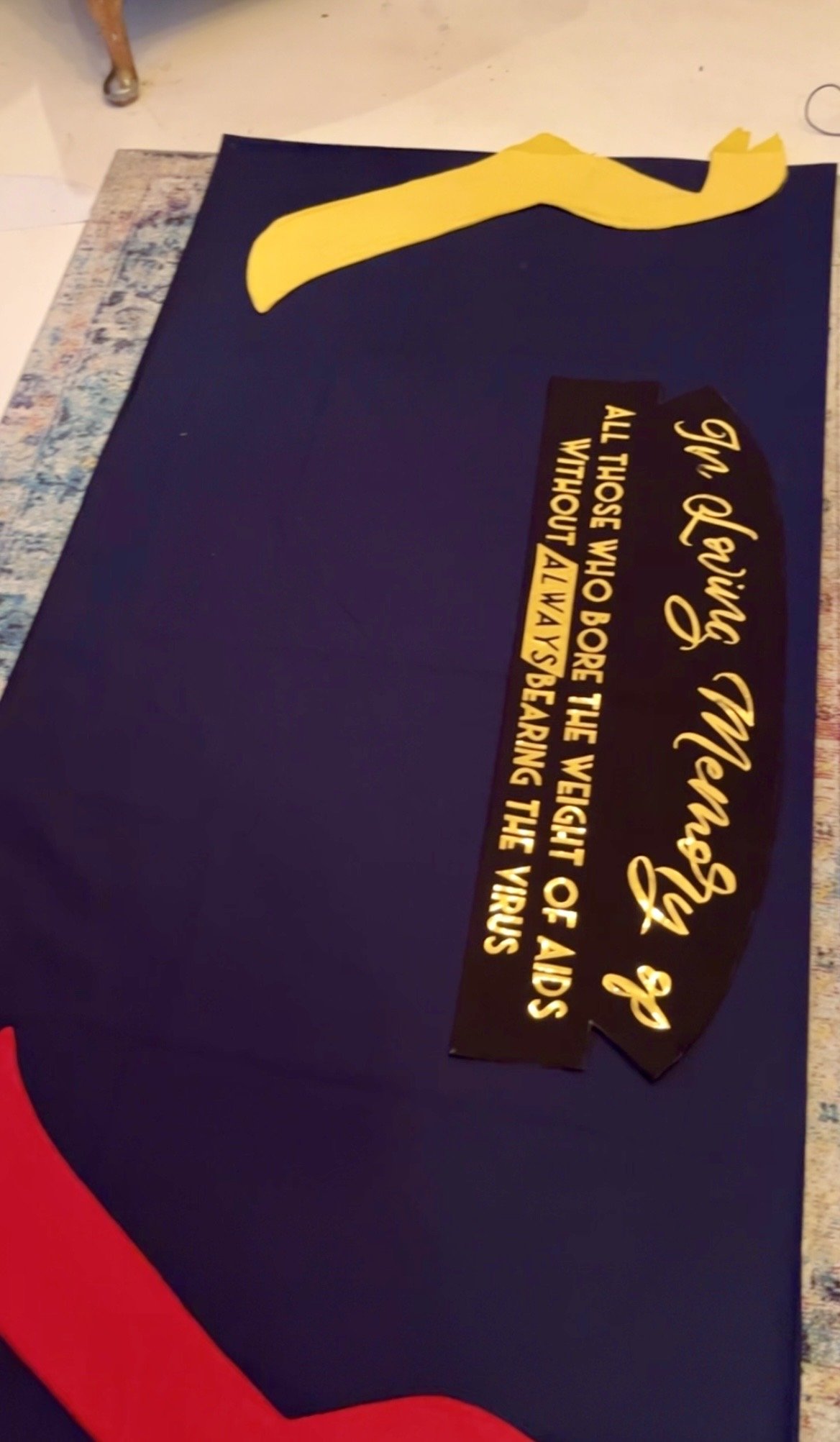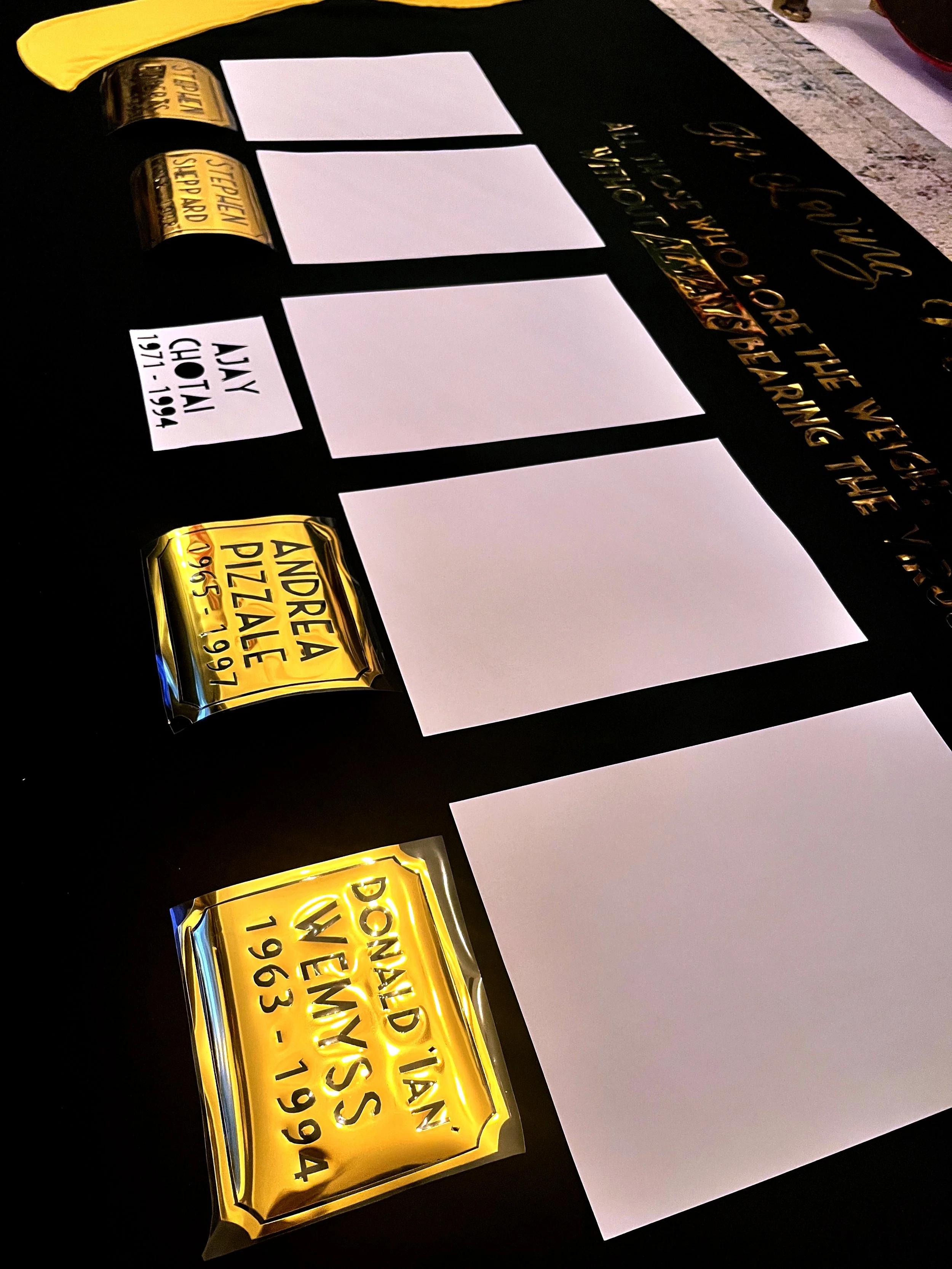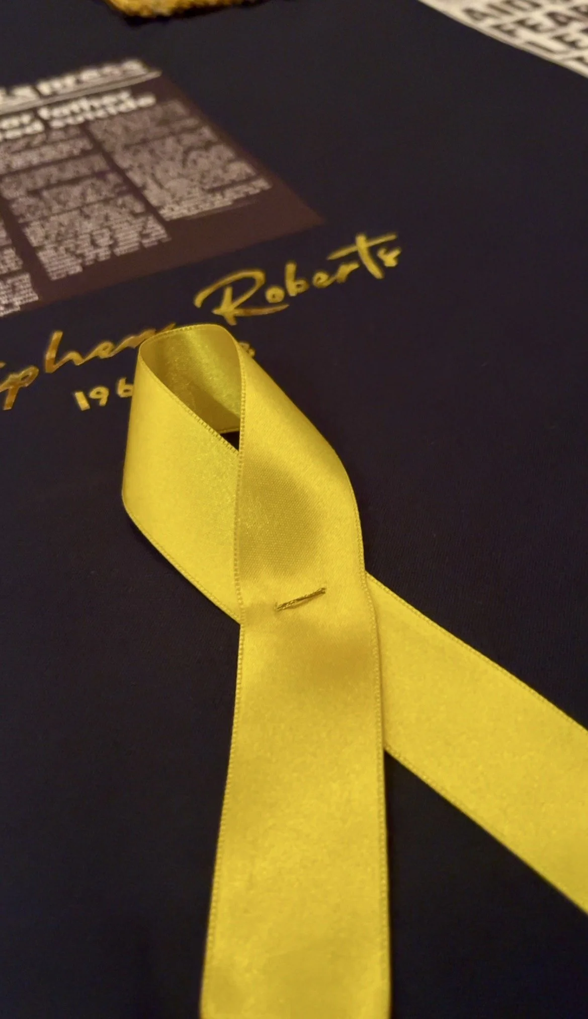 It was for this reason I felt these individuals should form part of the UK AIDS Quilt as a national memorial: the fact some may find the individual stories uncomfortable only strengthens the case for their inclusion. The panel balances symbols of remembrance and prevention — the red ribbon of HIV/AIDS and the yellow ribbon of suicide prevention mirrored on either side — reflecting the dual nature of loss and the urgent need for awareness. To ensure the quilt both educates and shares intimate stories, I included press cuttings for each individual and placed a yellow ribbon beneath every name; where someone had a confirmed HIV/AIDS diagnosis and took their own life, a red and yellow ribbon is intertwined beneath their name, acknowledging both the illness and the circumstances of their death with care and clarity.