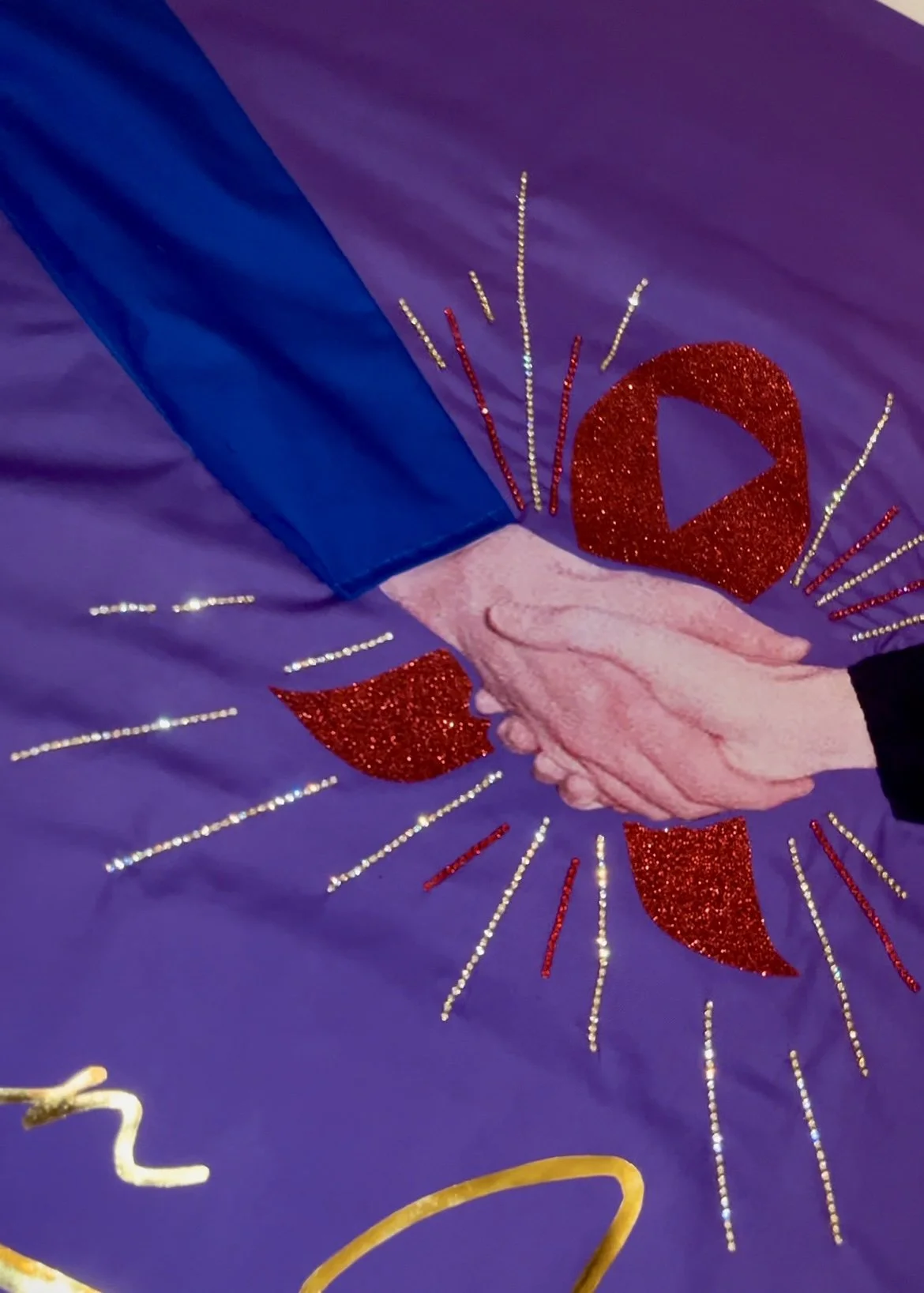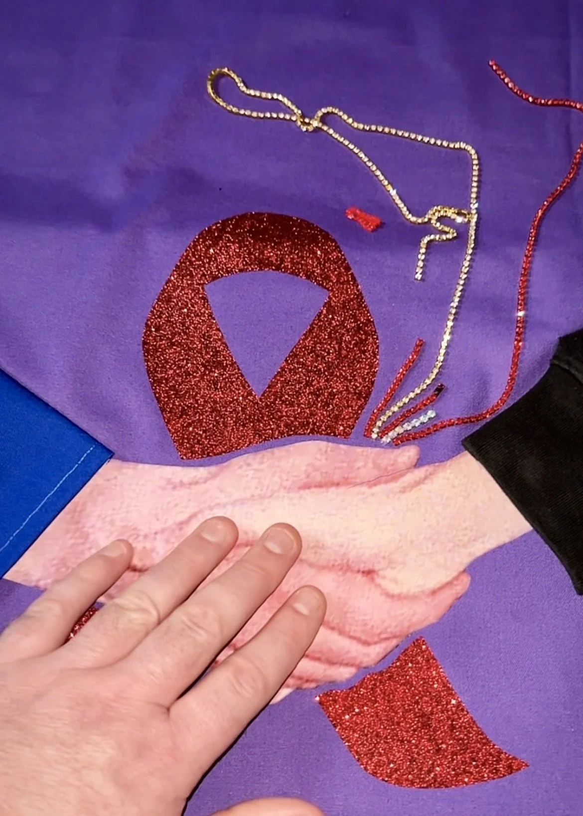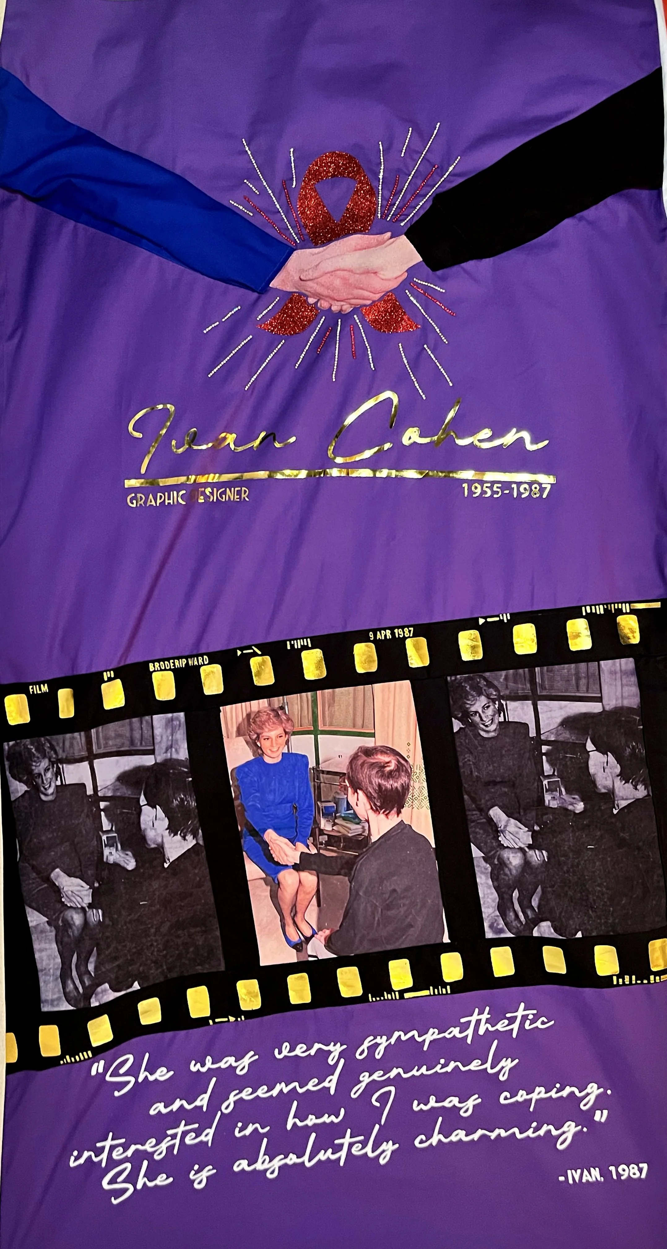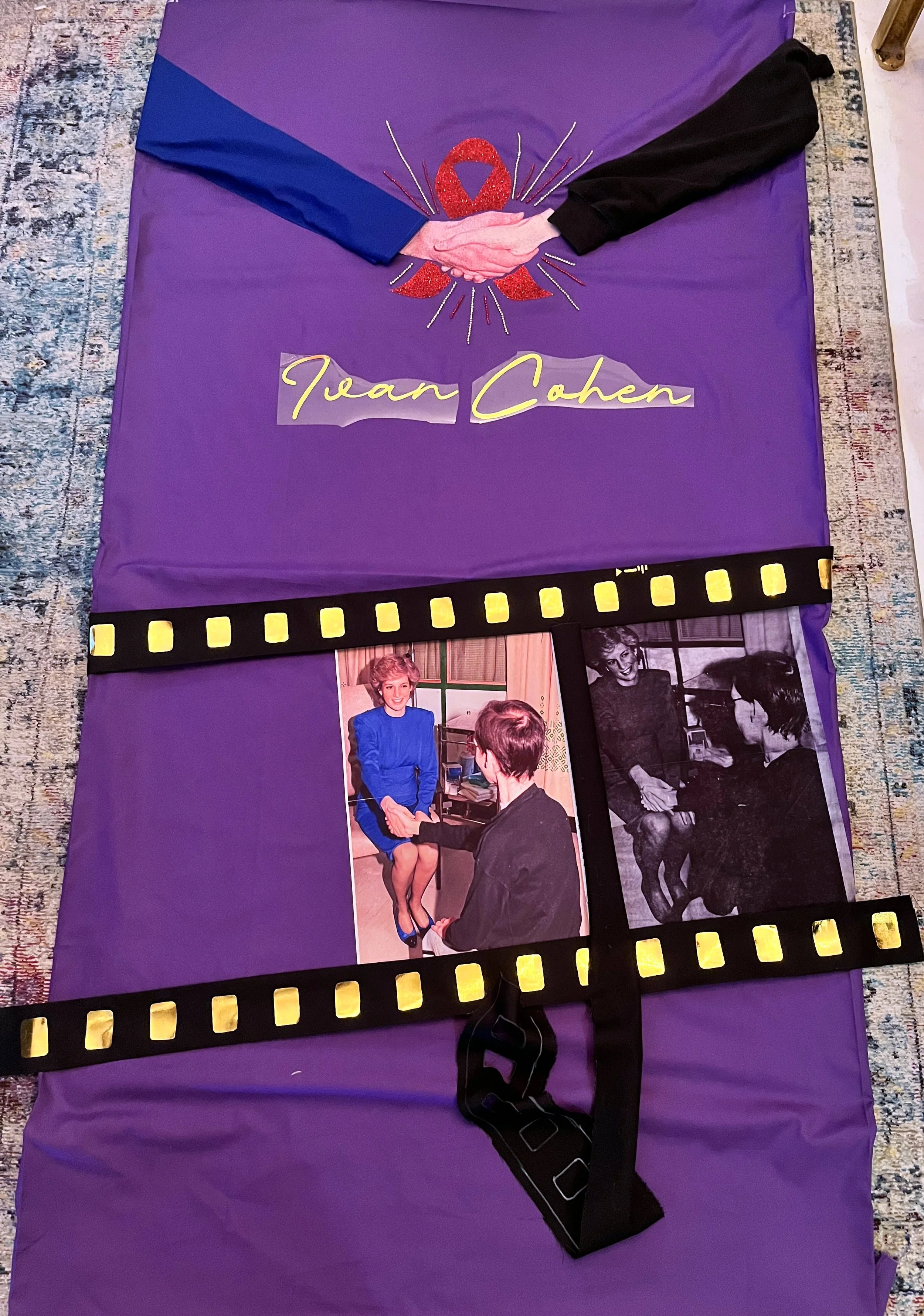 As a stranger who only came to know Ivan through research, I chose instead a purple background, a colour historically associated with royalty and one that offered a striking contrast to the arm of Princess Diana in the image of their handshake. The black sleeve representing Ivan’s arm came from a sweater I had occasionally worn; the hands are taken from the original photograph, slightly re‑angled to emphasise the connection. Behind their hands sits a red AIDS ribbon cut from red glitter vinyl, studded with red and gold diamantes to create a burst of energy and catch the light, adding movement and a touch of sparkle—an attempt to give the viewer, perhaps, a small, bittersweet smile.