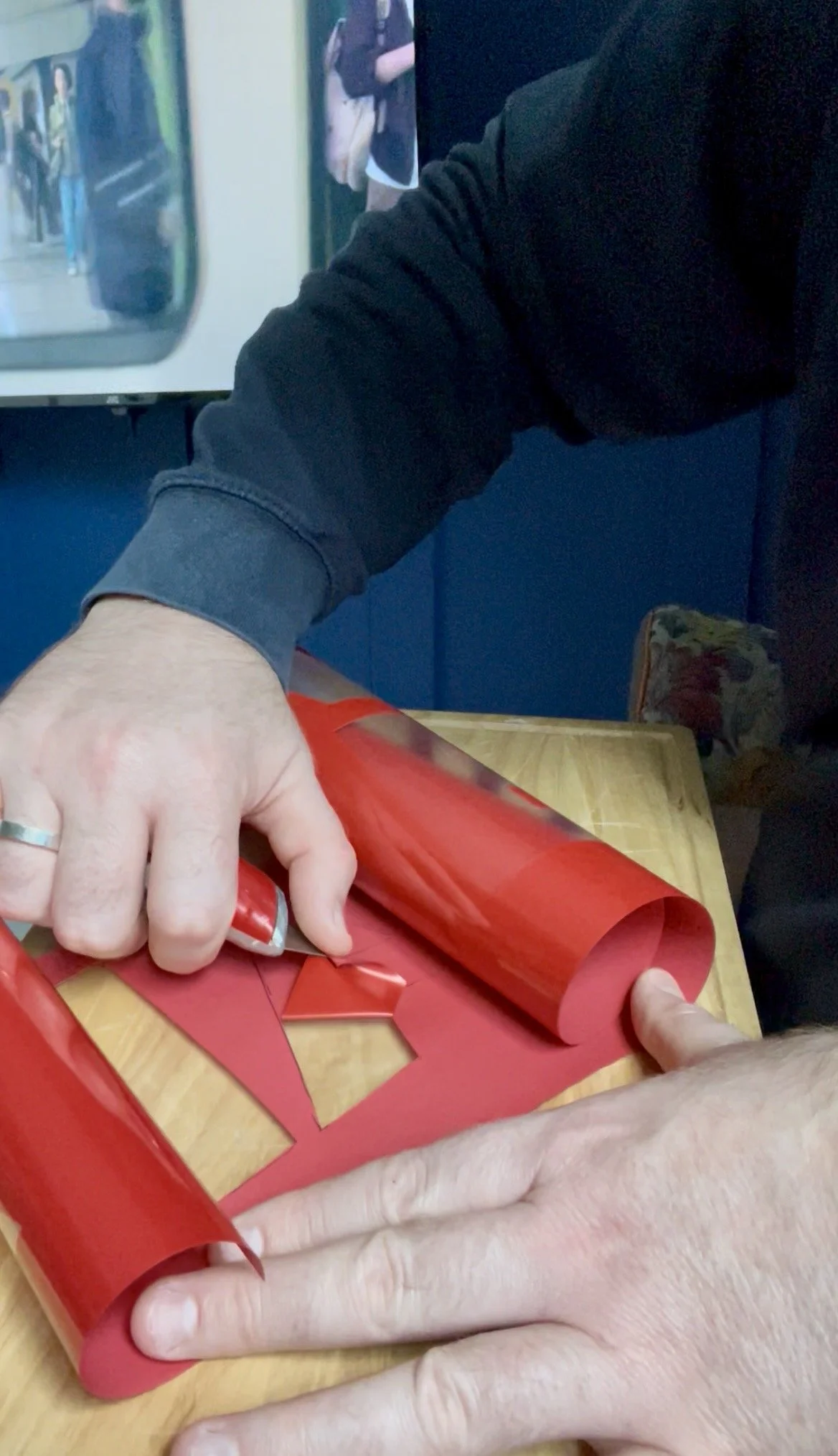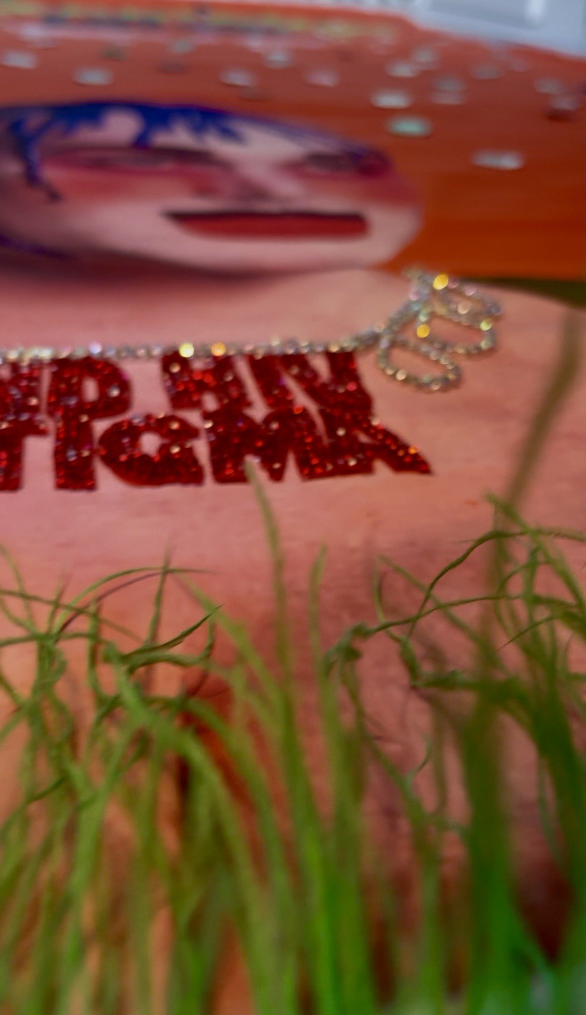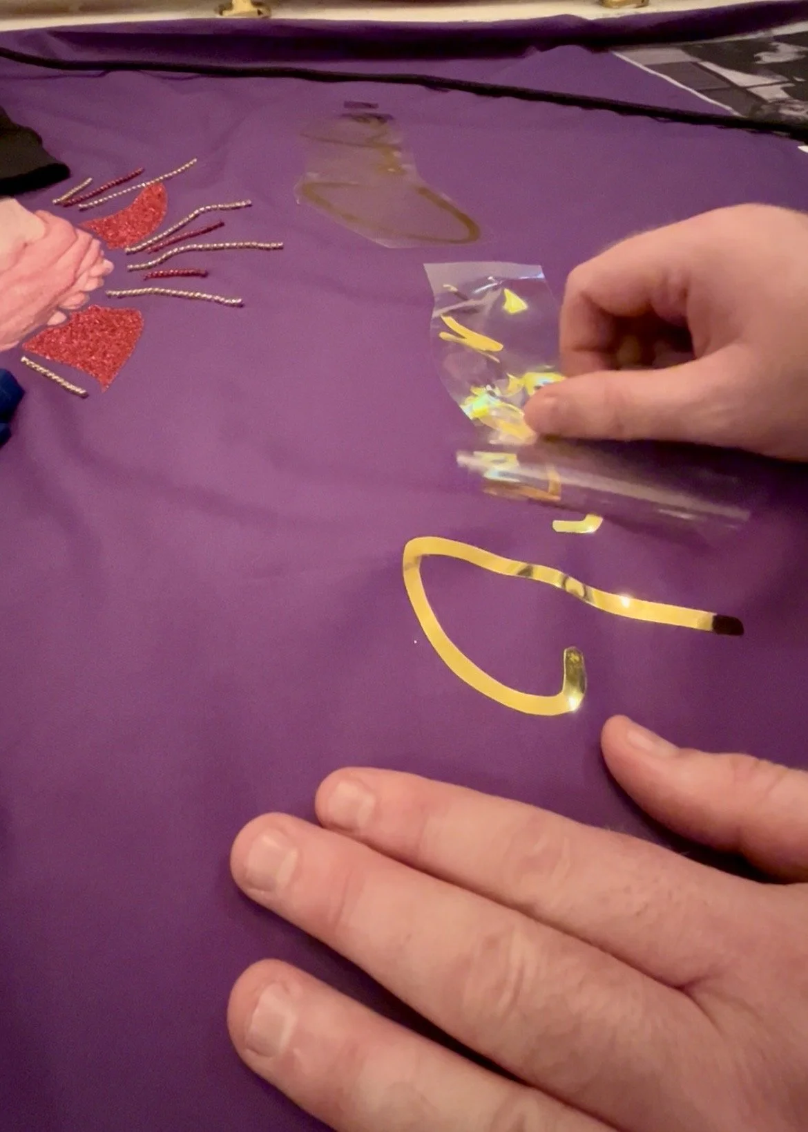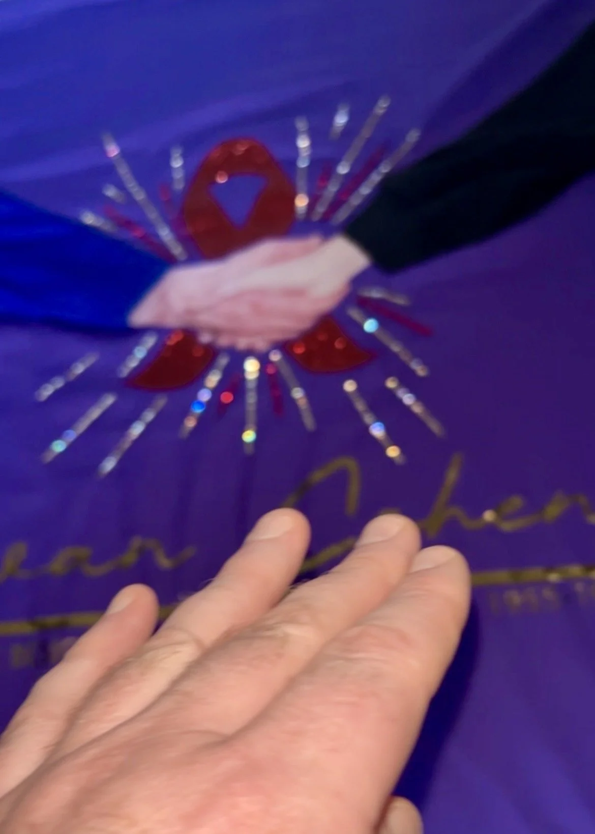 As a stranger who only came to know Ivan through research, I chose instead a purple background, a colour historically associated with royalty and one that offered a striking contrast to the arm of Princess Diana in the image of their handshake. The black sleeve representing Ivan’s arm came from a sweater I had occasionally worn; the hands are taken from the original photograph, slightly re‑angled to emphasise the connection. Behind their hands sits a red AIDS ribbon cut from red glitter vinyl, studded with red and gold diamantes to create a burst of energy and catch the light, adding movement and a touch of sparkle—an attempt to give the viewer, perhaps, a small, bittersweet smile.