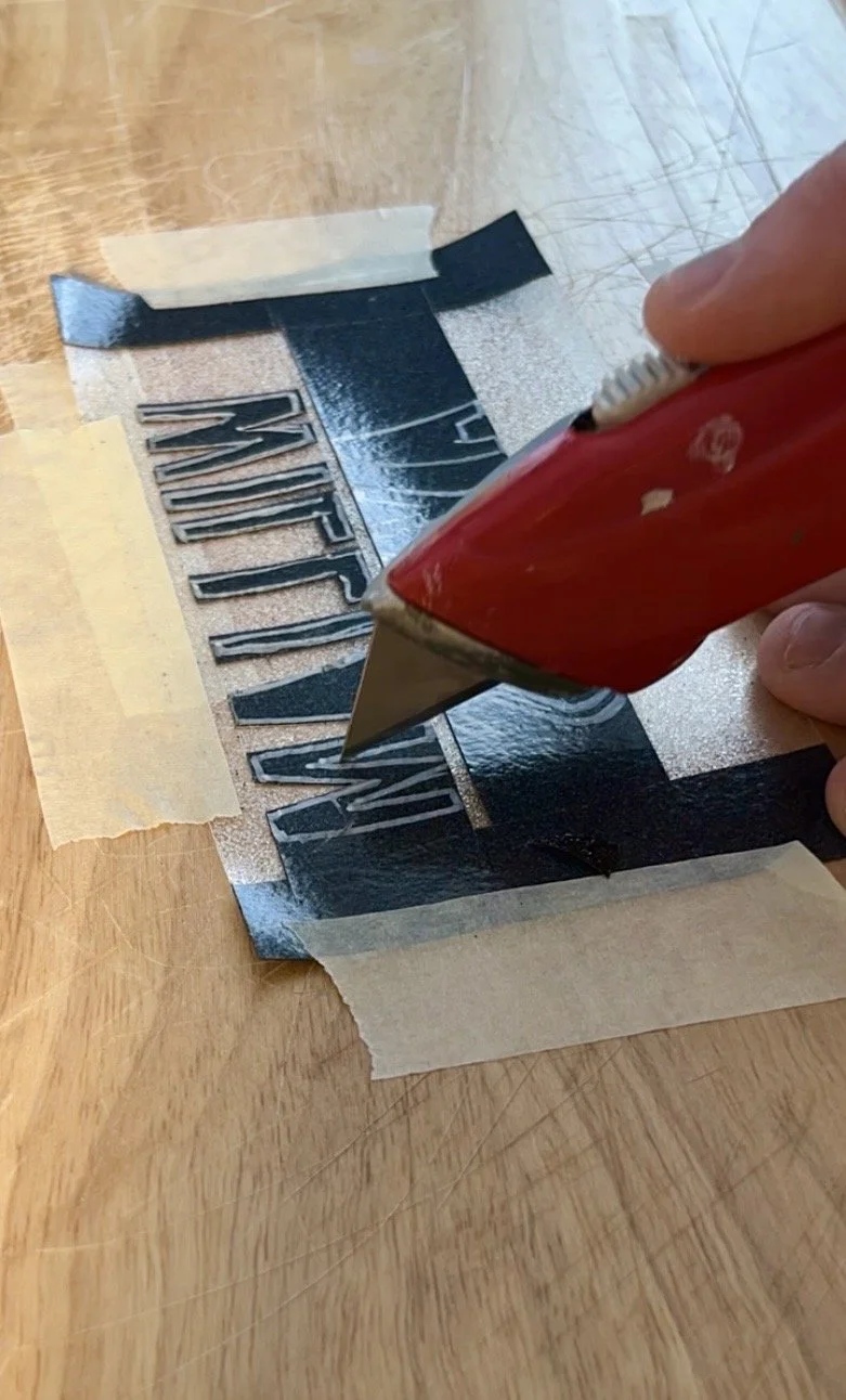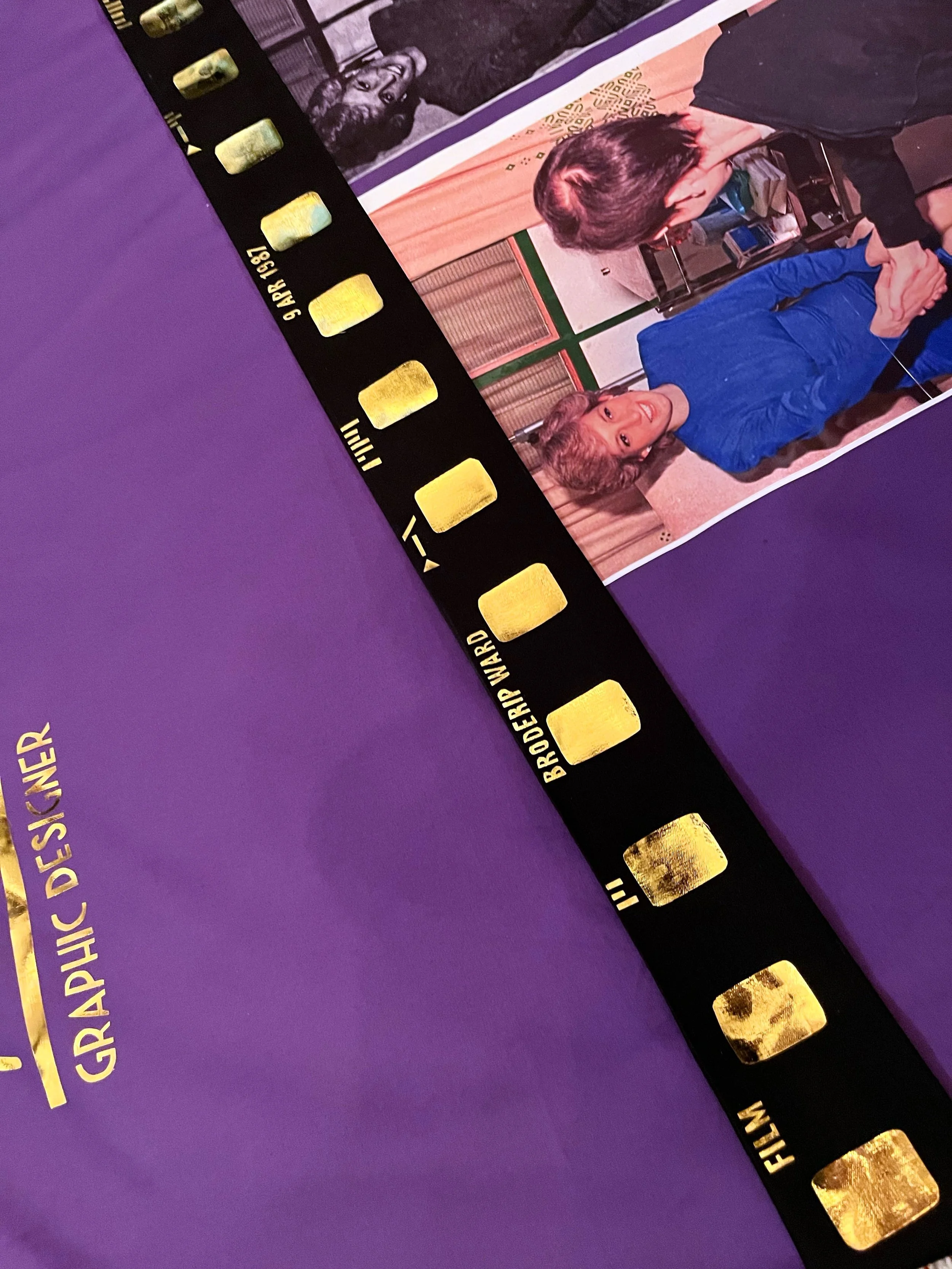 A last-minute change to my sketch placed the famous photograph of Ivan and the princess inside a photographer’s negative — a subtle wordplay on “negative” versus image, intended to confront stigma in a ‘positive’ way. The composition includes two versions of the photograph identified by the princess’s head slightly tilted: a colour photograph at the centre flanked by two black-and-white prints deliberately developed on the wrong paper to achieve a semi-translucent, negative-like effect. Ivan’s name and occupation, Graphic Designer, appear in gold vinyl along with his life dates, with a tabloid quote he gave at the time of the Princess’s visit runs along the bottom in white, anchoring the piece with a candid, humanising statement, in Ivan’s own words.