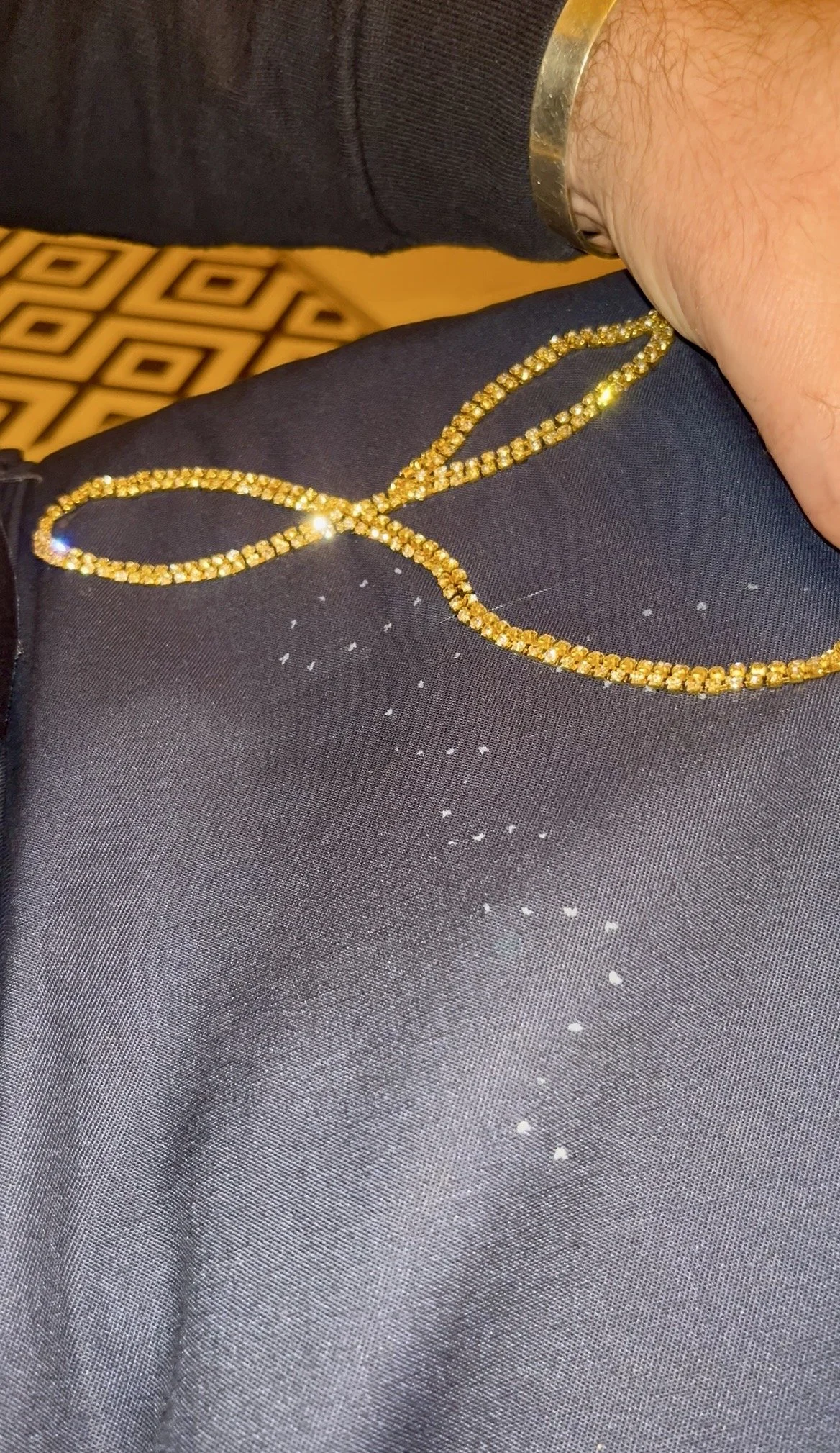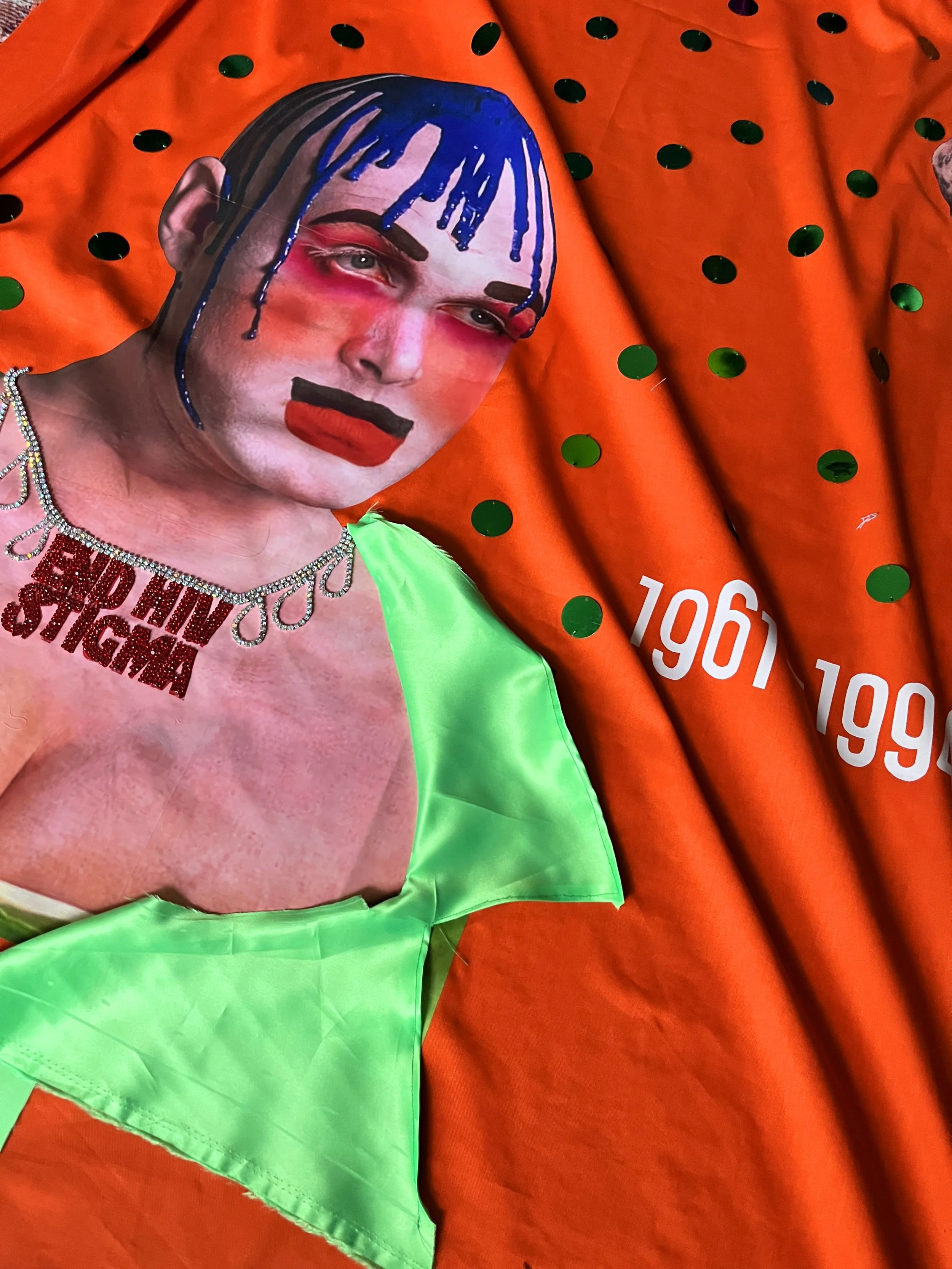 In the portrait he seemed sparse in terms of jewellery, and I caught myself wondering if he were still with us today whether he might speak up for people living with HIV — whether he might wear a bold, declarative piece. So I stitched a diamante necklace across his cleavage that reads ‘END HIV STIGMA’, a deliberate, slightly theatrical addition that imagines his image reclaimed as a platform for visibility and conversation. Champagne corks and the spray appears at each side of his name, a nod to that infamous performance.