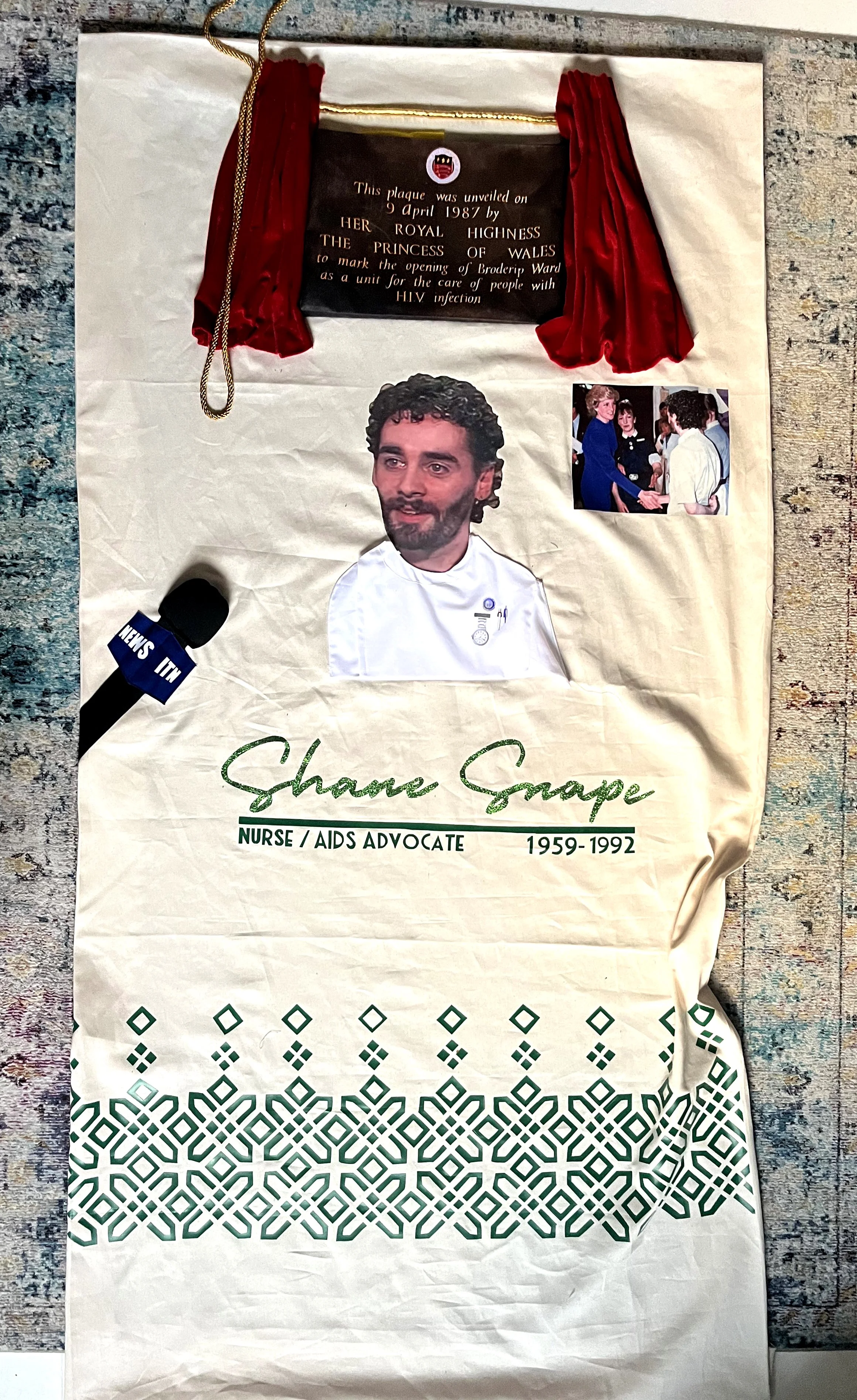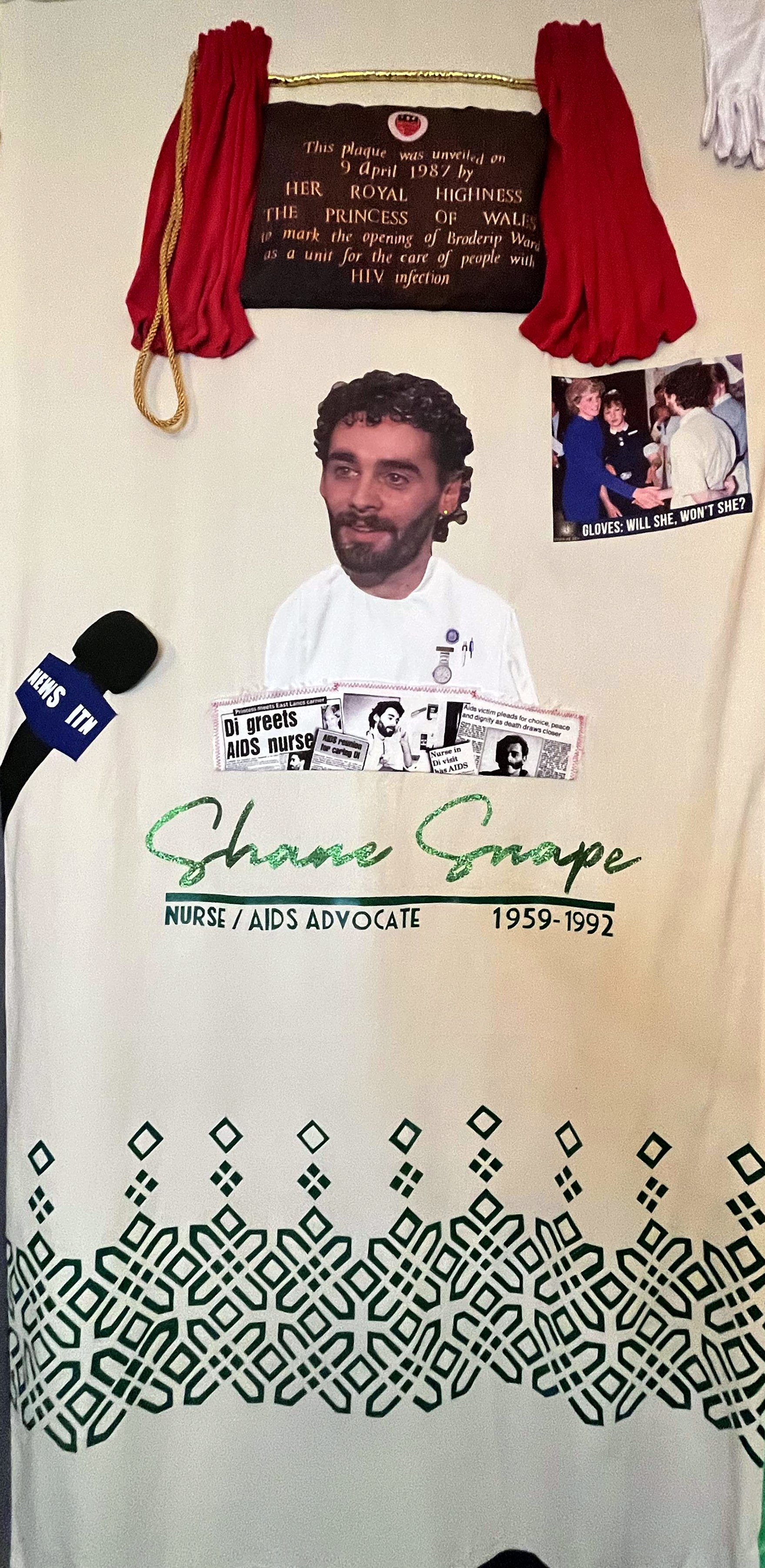 Above I applied a 3D fabric plaque that Princess Diana unveiled on the day, eded with a gold cord and red velvet swags; as Shane spoke to ITN and shared his diagnosis he also responded to the sensationalist speculation that had mounted since the Princess announced she was opening the AIDS ward — would she wear gloves? She didn’t, of course, so I sewed a pair of white, elbow‑length gloves, the sort royals might wear, to the top of the quilt, a quiet, literal gesture that she didnt wear gloves.
