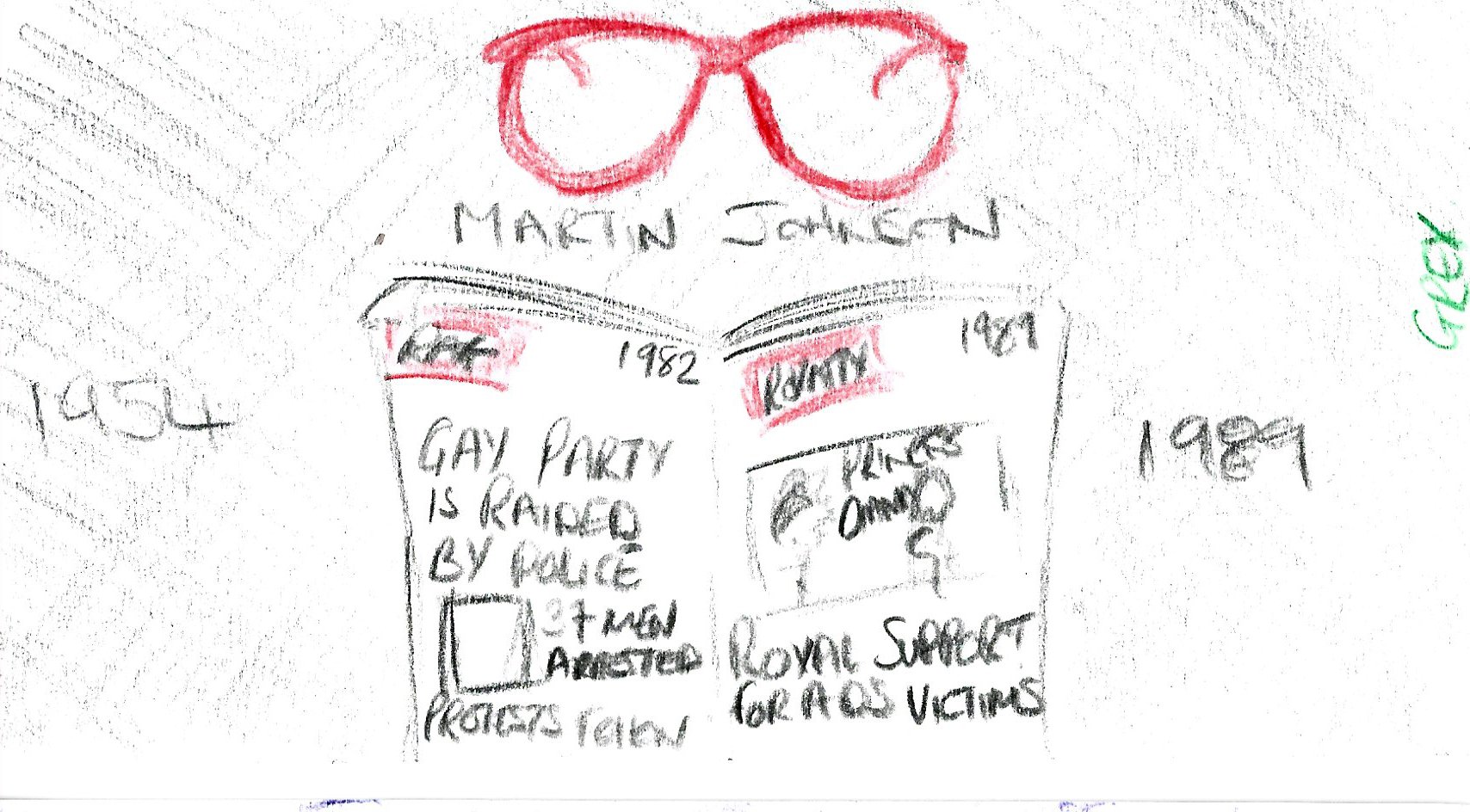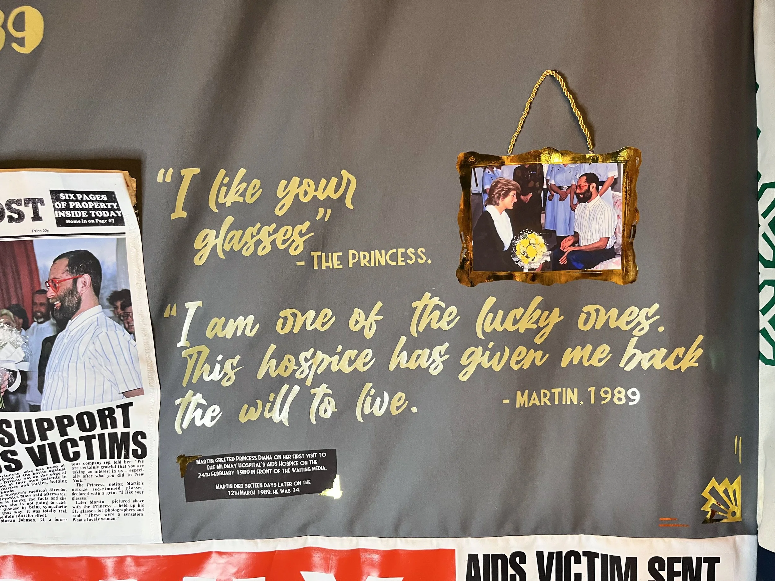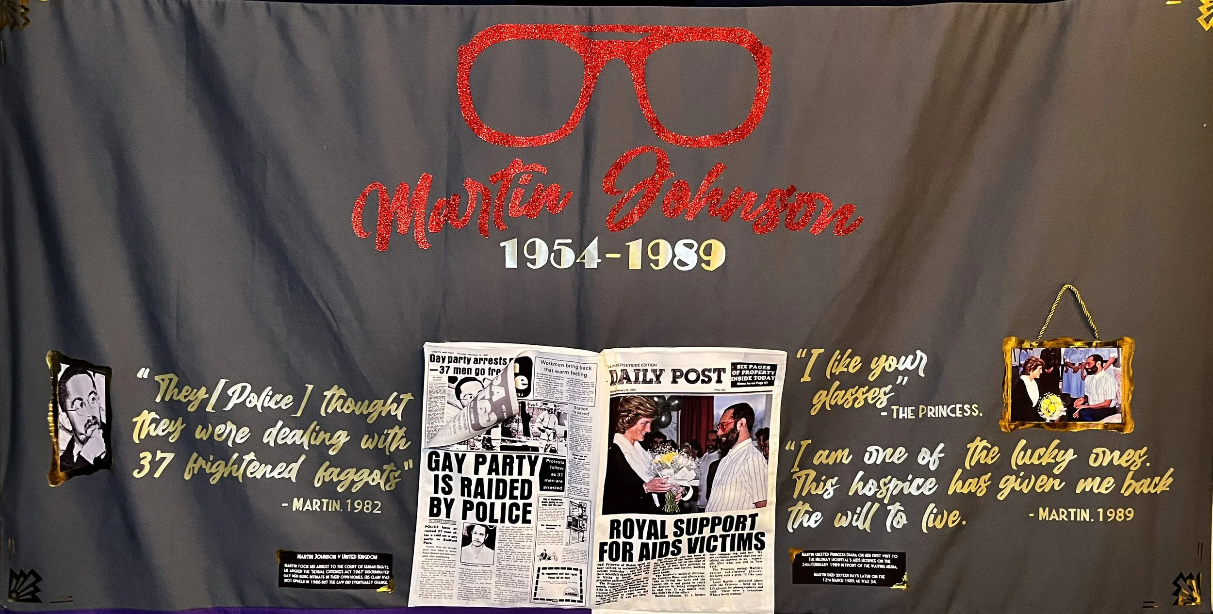 Martin’s panel centred on the oversized red glasses in red glitter vinyl that caught the late Princess’s eye—“I like your glasses,” she remarked—a playful nod to his quirky, openly gay personality and his happy‑go‑lucky demeanour. Martin told the waiting press afterwards, holding his glasses aloft, “these were a hit.” I placed, at the centre of the panel, a newspaper conceived as if read through his own lenses, the front pages carrying headlines of the 1982 police raid and the 1989 meeting with Diana. Flanking that central image are two gold‑framed photographs: a portrait of Martin and a picture of him with the Princess, each accompanied by quotes from Martin and Diana that frame these moments both as protest — his public fight for gay rights — and as a visible declaration by a young man living with an AIDS diagnosis in 1989. The panel offers viewers a concentrated glimpse of who Martin Johnson was, an invitation to be intrigued and to seek out his fuller story.