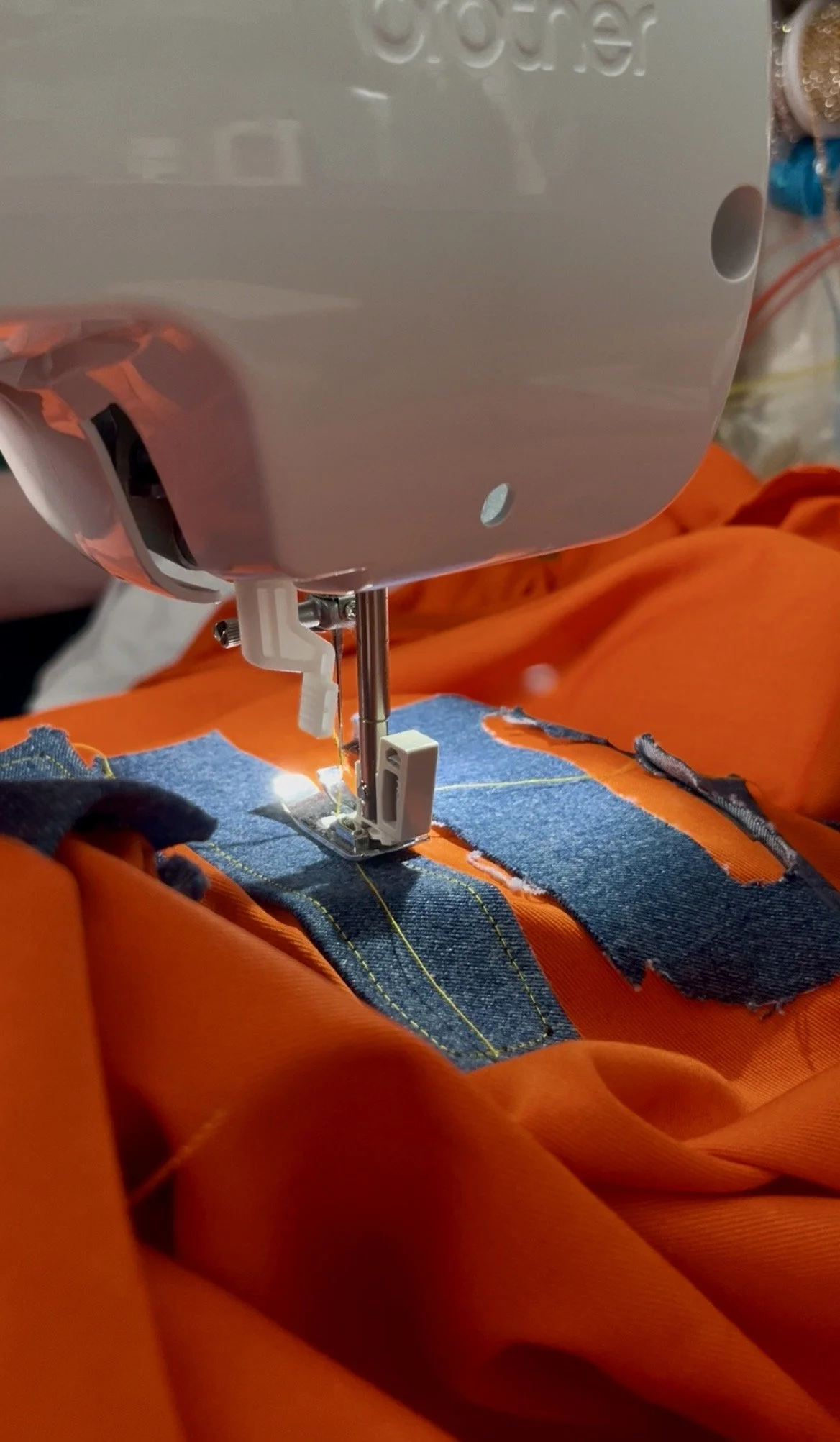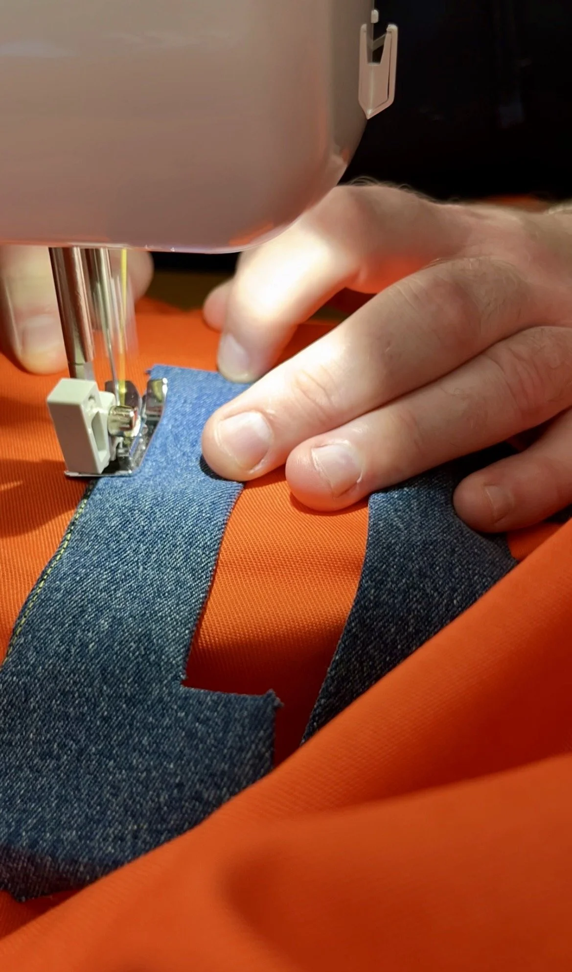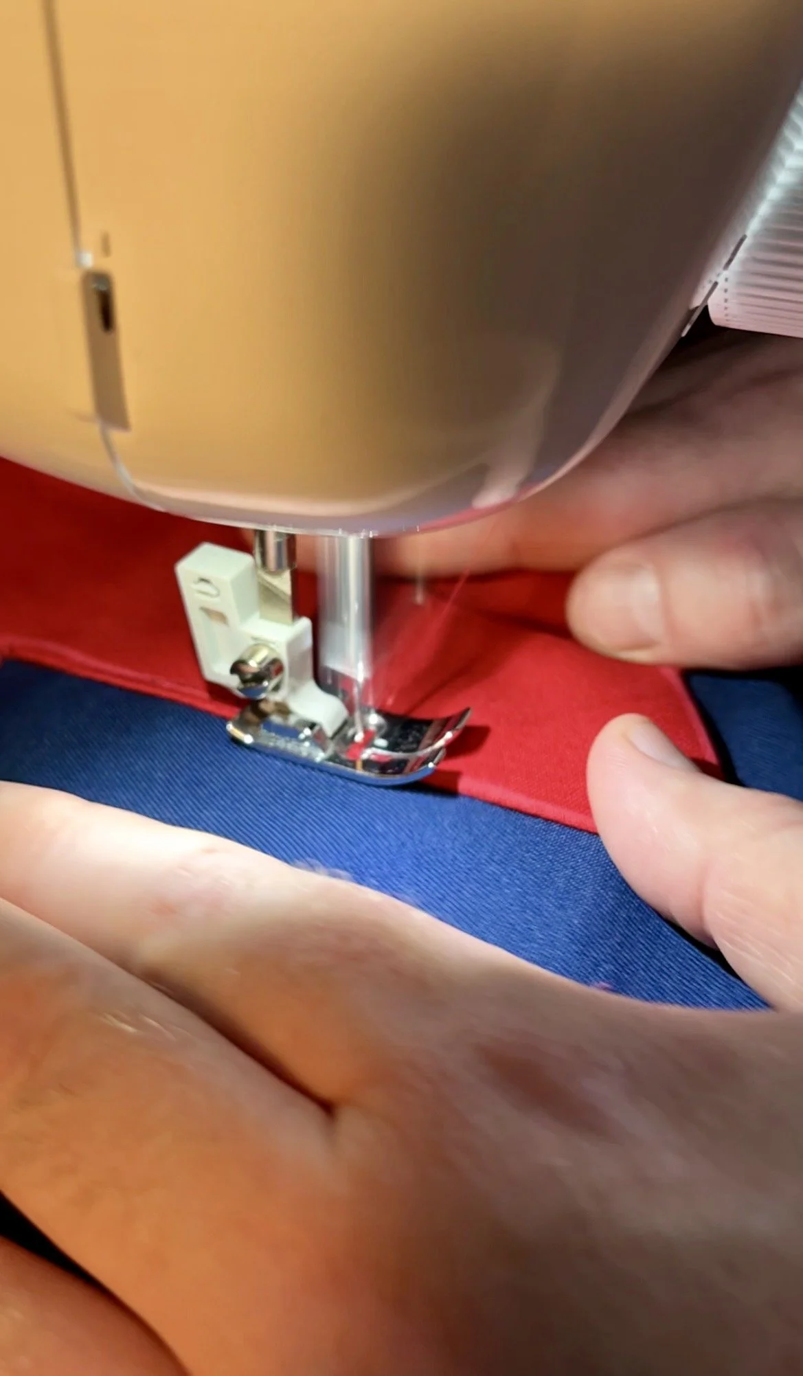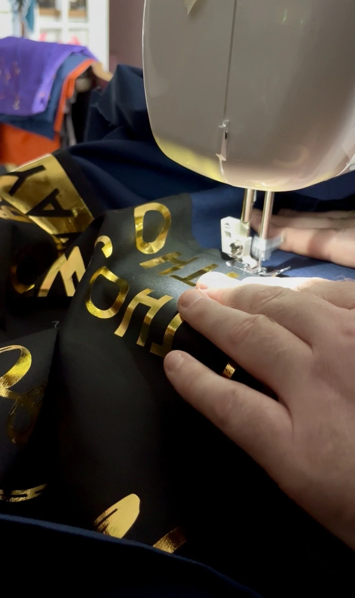 Once the backing was on and my messy handstitching was hidden from view, I turned my attention to the canvas edge. The fabric was pleasant to handle, but every strip needed to be ironed after cutting to create a crisp crease for easier attachment and stitching. The only drawback was the canvas’s thickness: even with a new sewing machine, overlapping sections were hard to feed through and I broke 6 denim grade needles, and the lighter modern machines—less robust than those of previous decades—allowed the thread to nest at the back. Fortunately the stitching held firm despite the untidy reverse. What set me back a couple of days, and delayed delivery to the UK AIDS Memorial Quilt, was having to hand-cut sixteen holes so the brass eyelets could be hammered in, but after being awake for 36 hours the job was finally completed.