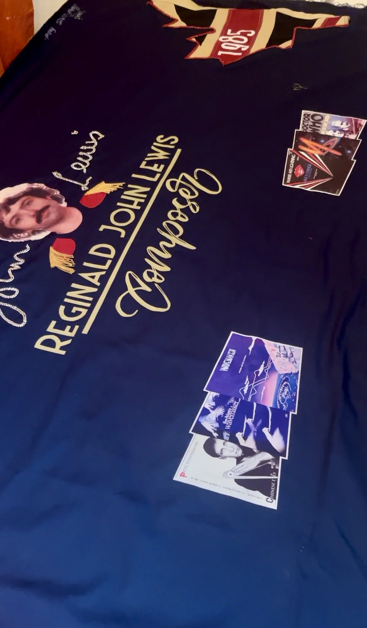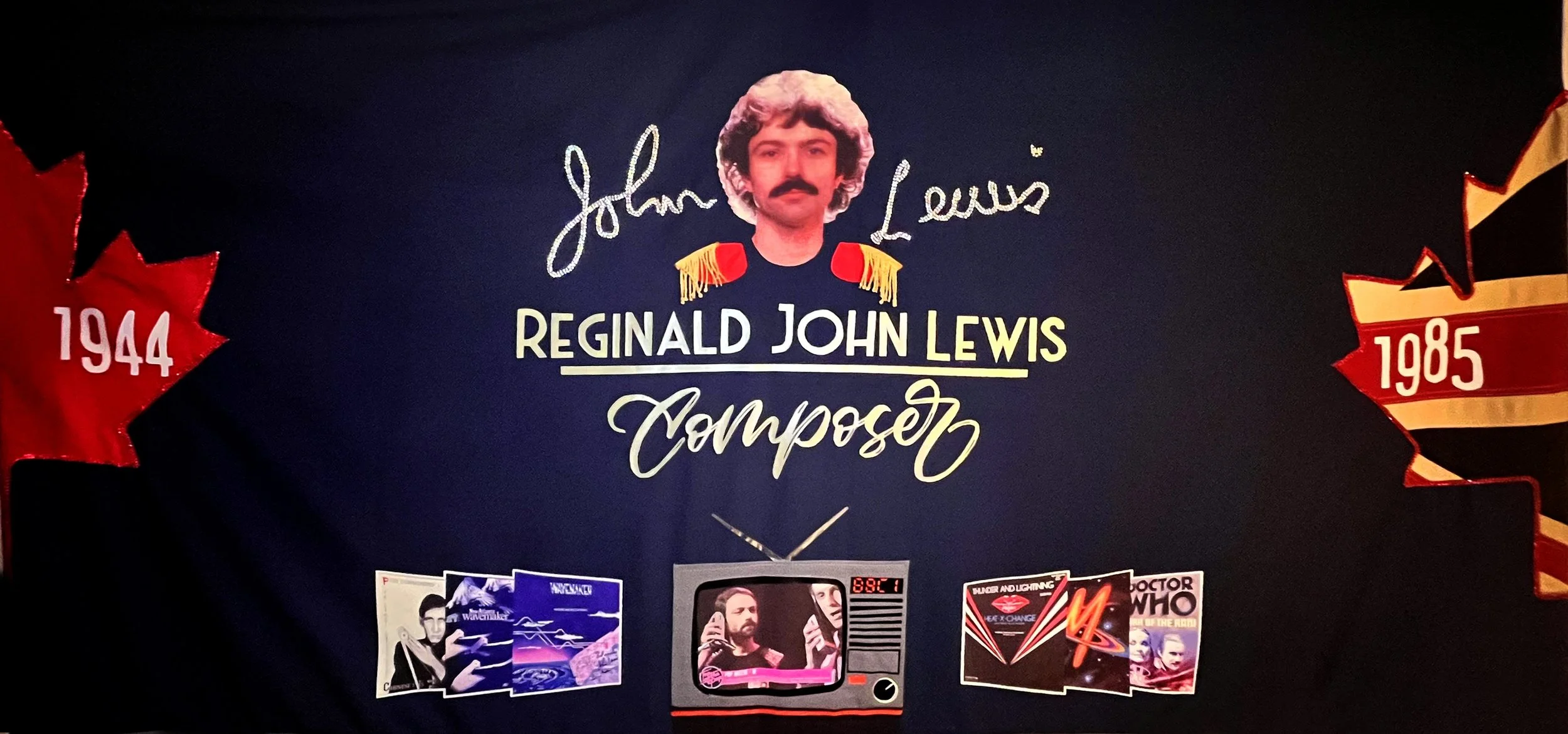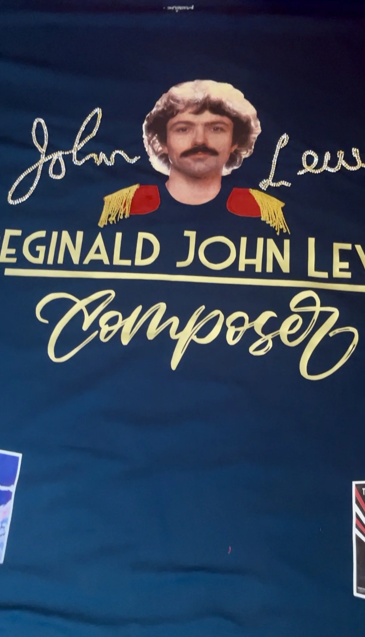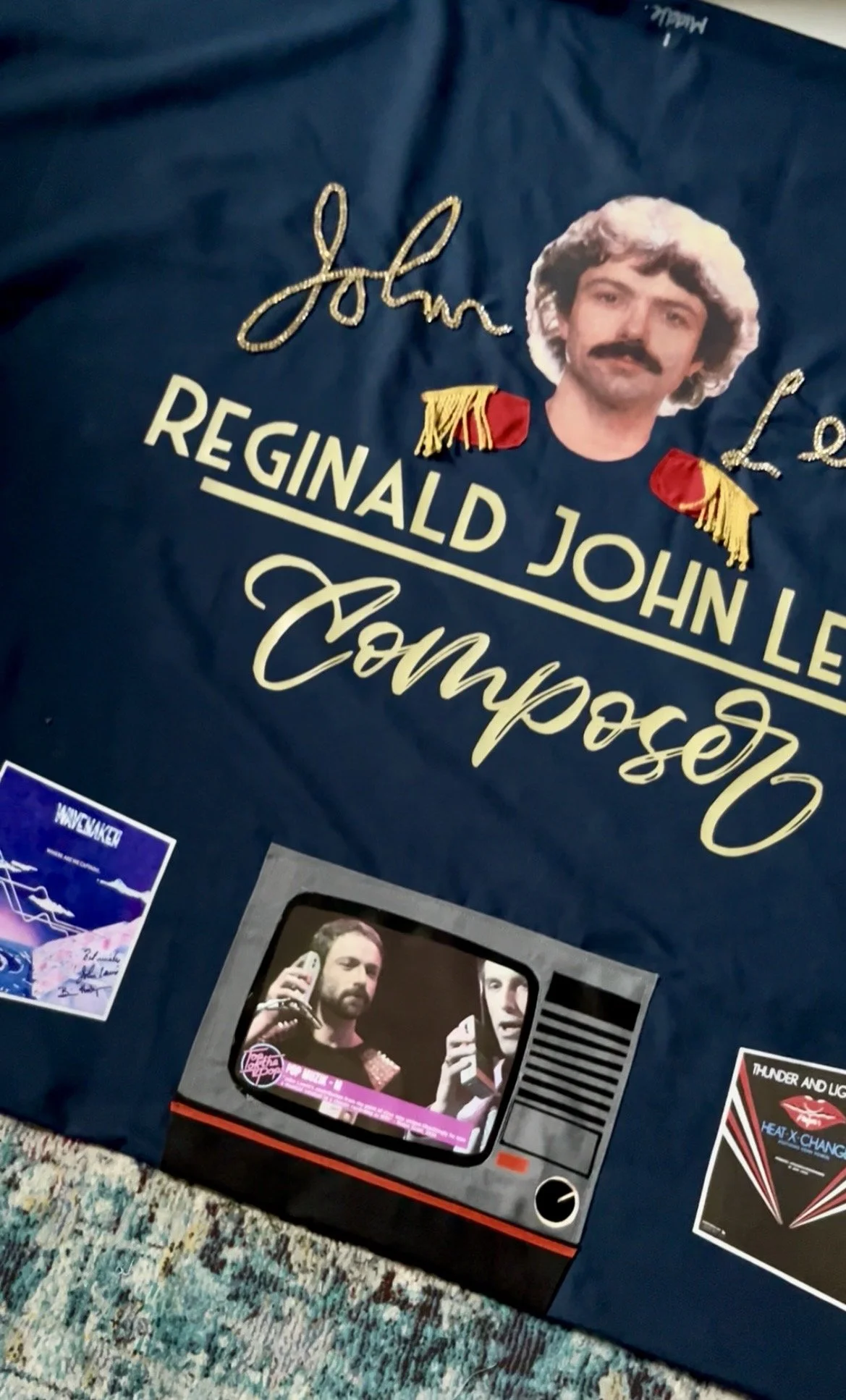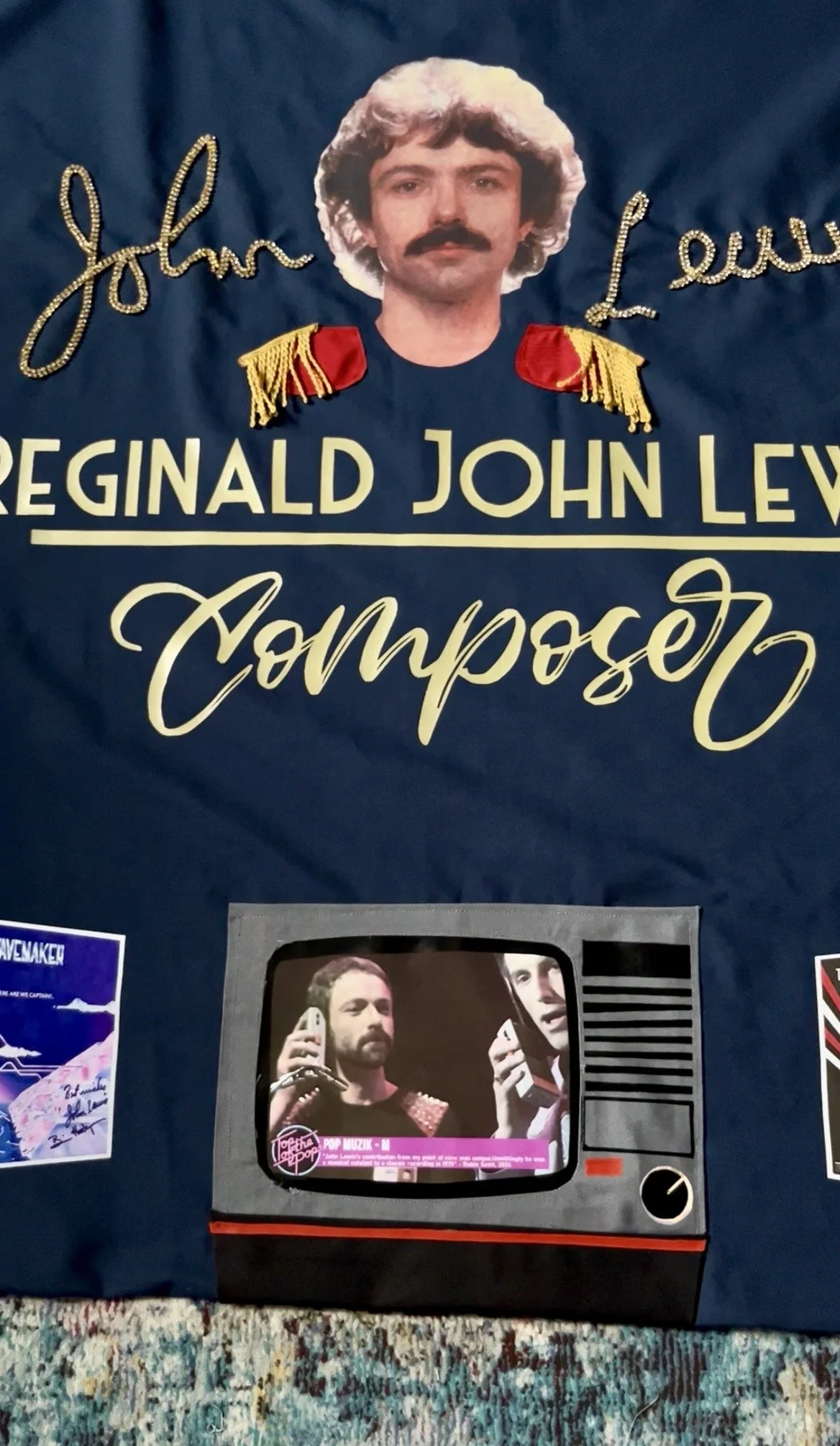 The maple leaf was edged with two rows of ruby-red diamantes, while John’s autograph echoed in two rows of gold diamantes, giving the quilt life, movement and sparkle; centred above a headshot photograph of John from the back of one of his albums with his friend and fellow composer Brian Hodgson and their duo Wavemaker. The photograph, originally topless and cut off at the shoulders, was subtly dressed with small red epaulettes to create the illusion of John wearing a navy T‑shirt—a touch borrowed from his appearance at the organ on Top of the Pops in Robin Scott’s Pop Muzik—and, in place of the gold studs, I substituted gold tassels to avoid damaging the quilt when folded for storage.