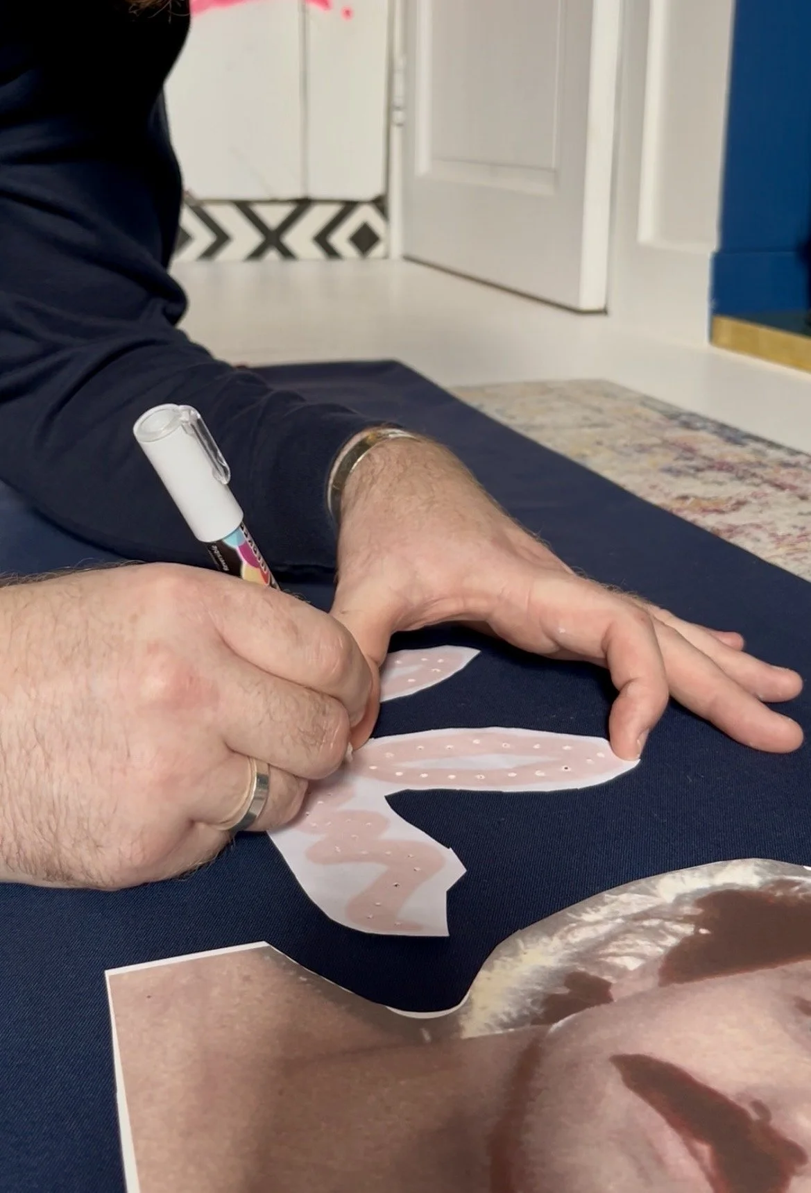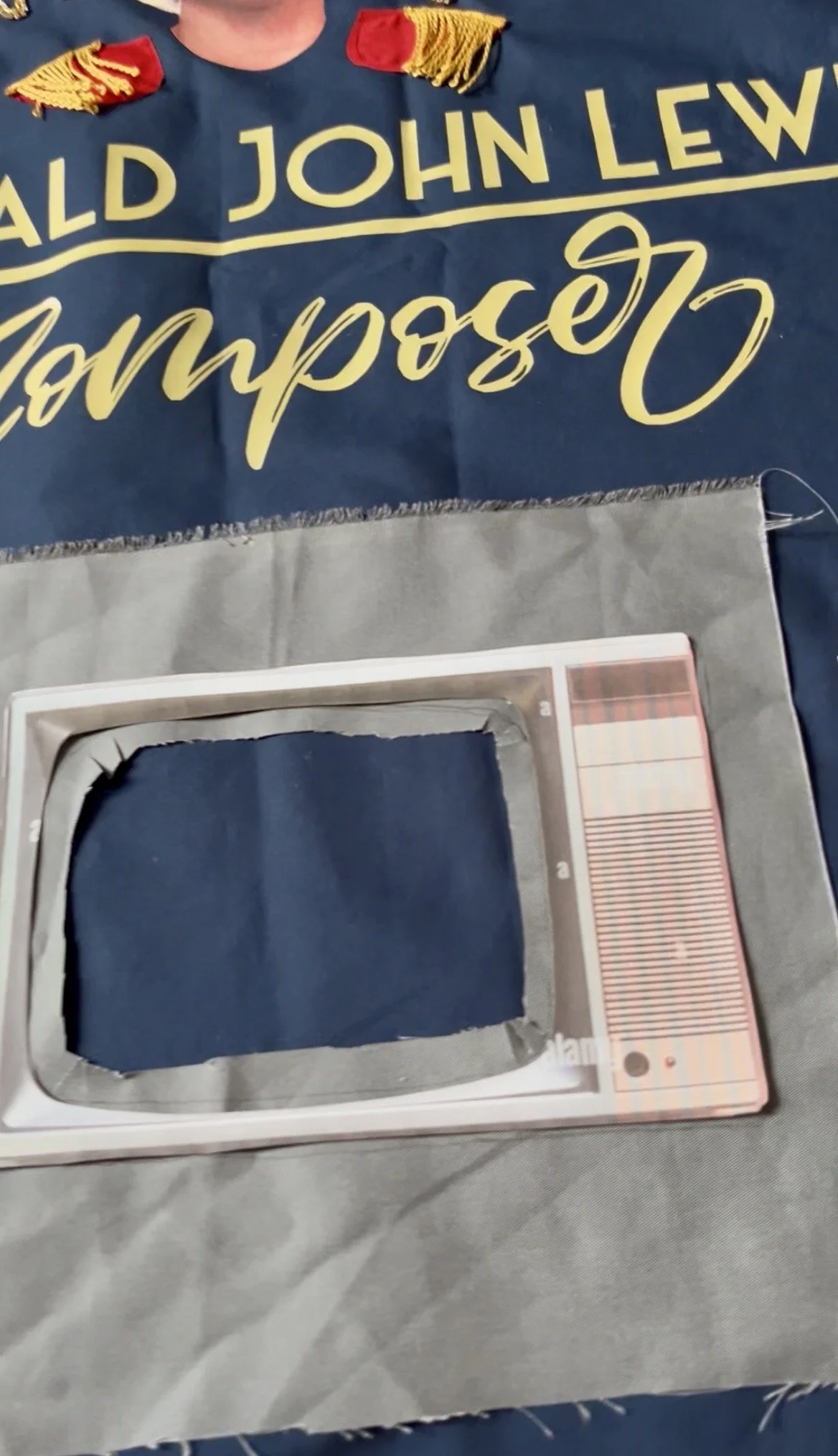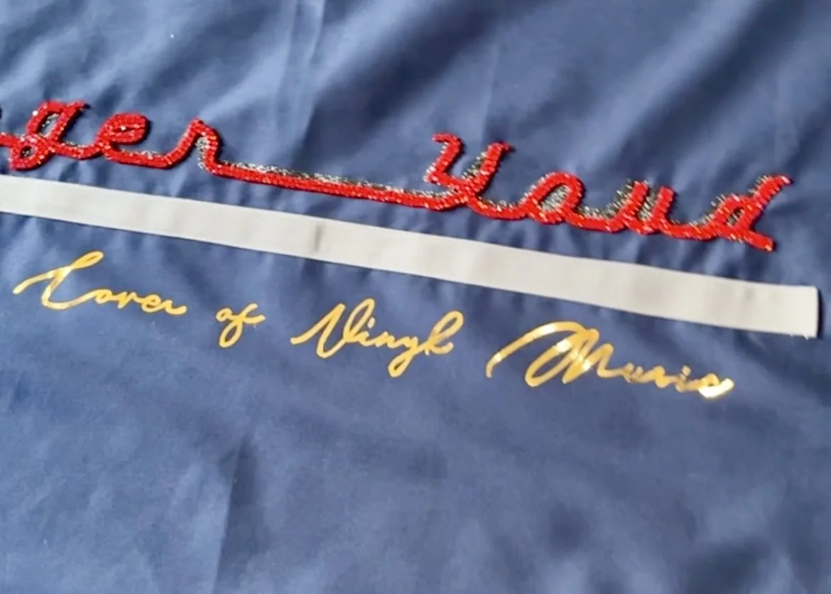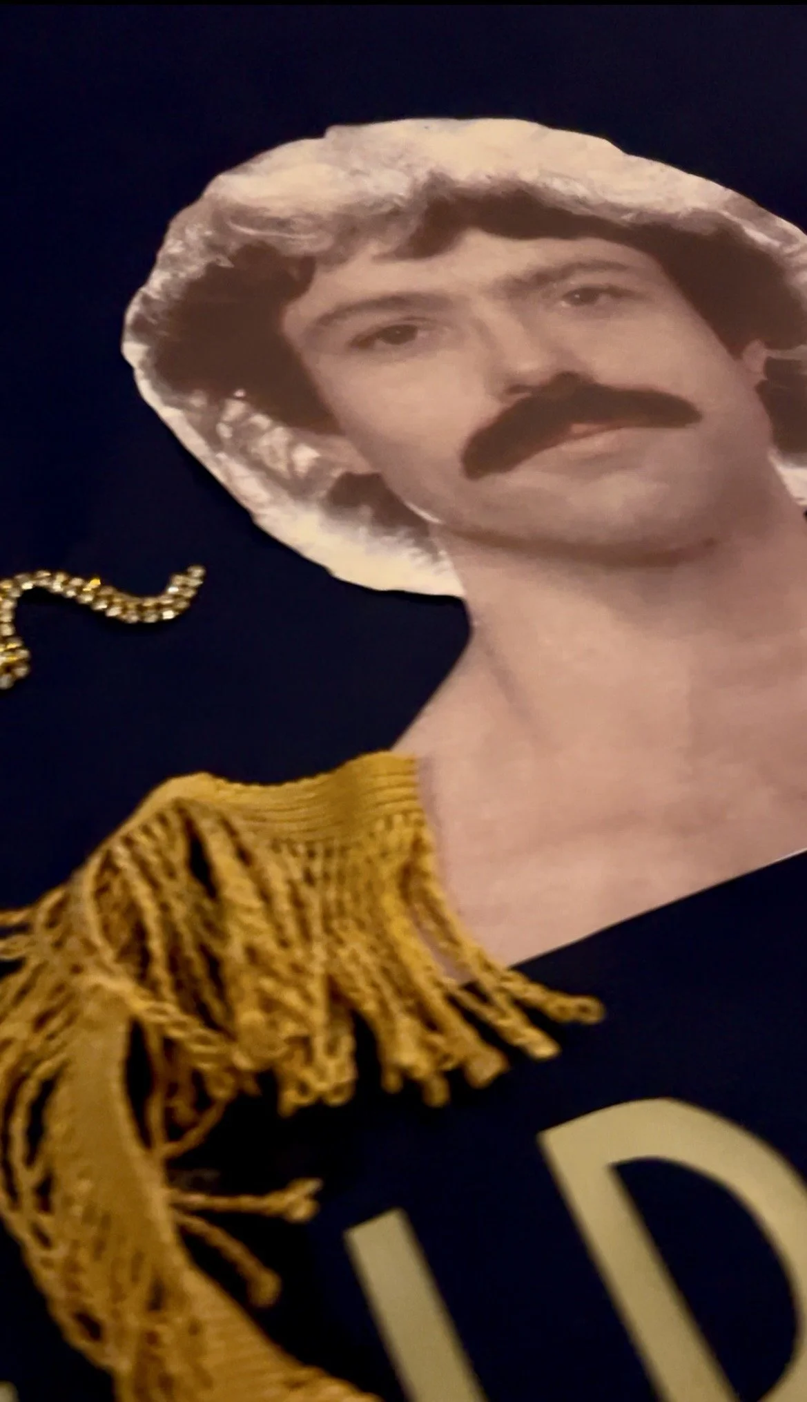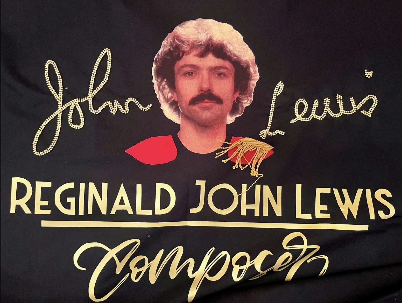 The maple leaf was edged with two rows of ruby-red diamantes, while John’s autograph echoed in two rows of gold diamantes, giving the quilt life, movement and sparkle; centred above a headshot photograph of John from the back of one of his albums with his friend and fellow composer Brian Hodgson and their duo Wavemaker. The photograph, originally topless and cut off at the shoulders, was subtly dressed with small red epaulettes to create the illusion of John wearing a navy T‑shirt—a touch borrowed from his appearance at the organ on Top of the Pops in Robin Scott’s Pop Muzik—and, in place of the gold studs, I substituted gold tassels to avoid damaging the quilt when folded for storage.