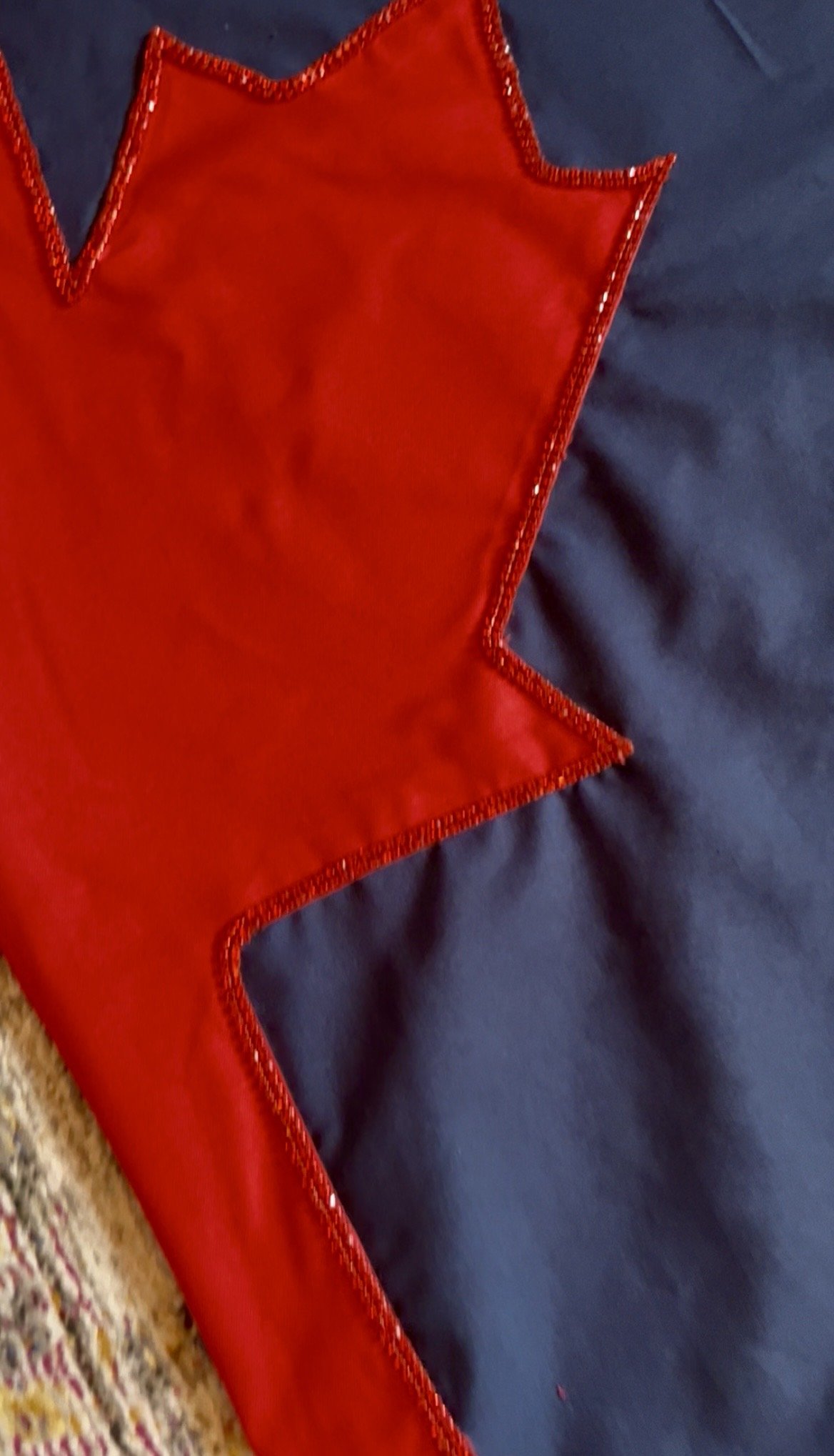 The quilt’s navy cotton background frames a Canadian maple leaf split down the middle: the left half bearing the year of his birth in Canada, the right half coloured with the Union Jack and marked with the year of his death, a deliberate symbol of a life born across the Atlantic but lived, and ended, in the United Kingdom.