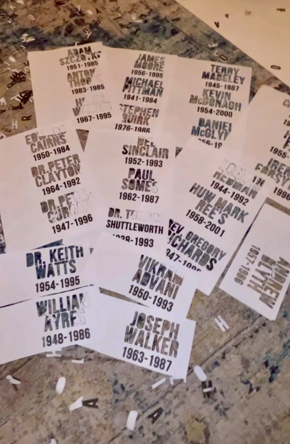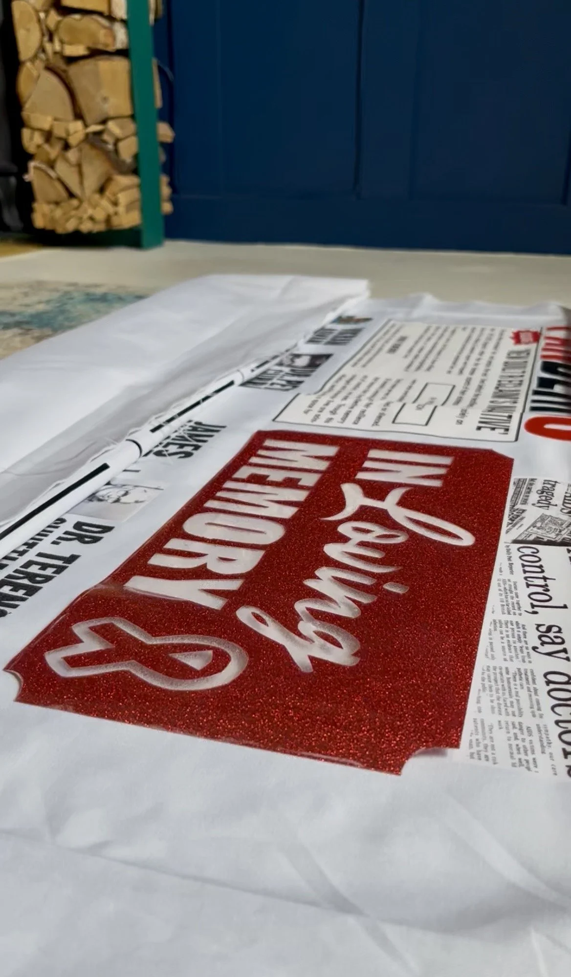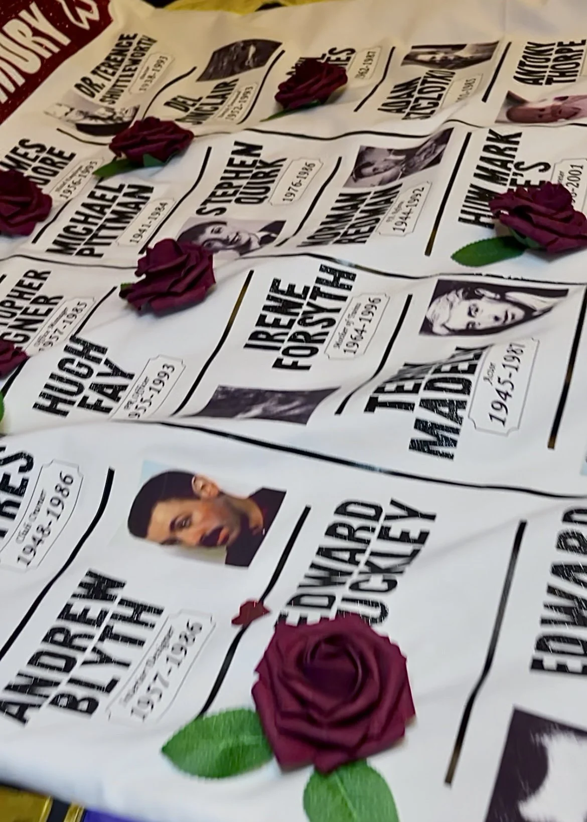 The names had all been hand-cut, which at first worried me — would a slightly imperfect curve make the whole thing look sloppy? But I could also picture the names if they’d been machine-cut, and realised the painstaking, fiddly handwork actually suited the quilt: it spoke of time and care invested in each person. Over hours I began to recall each of them having featured on my podcast, conjuring lives beyond the stories we told on air; the list became a quiet roll-call of people with histories and foibles we might never fully know. The layout hinted at the obituaries section of a newspaper, although this time on the front page and not toward the back. And where I couldn’t place a photograph I affixed a foam claret rose as a kind of stand-in for the modest clip art often found there in the 1980s and 90s. Their names were cut from black glitter vinyl — newspaper-print dark at a distance, but catching the light with a subtle twinkle — a small, moving sparkle to honour a life lived and equally a protest, but also a celebration of their life.