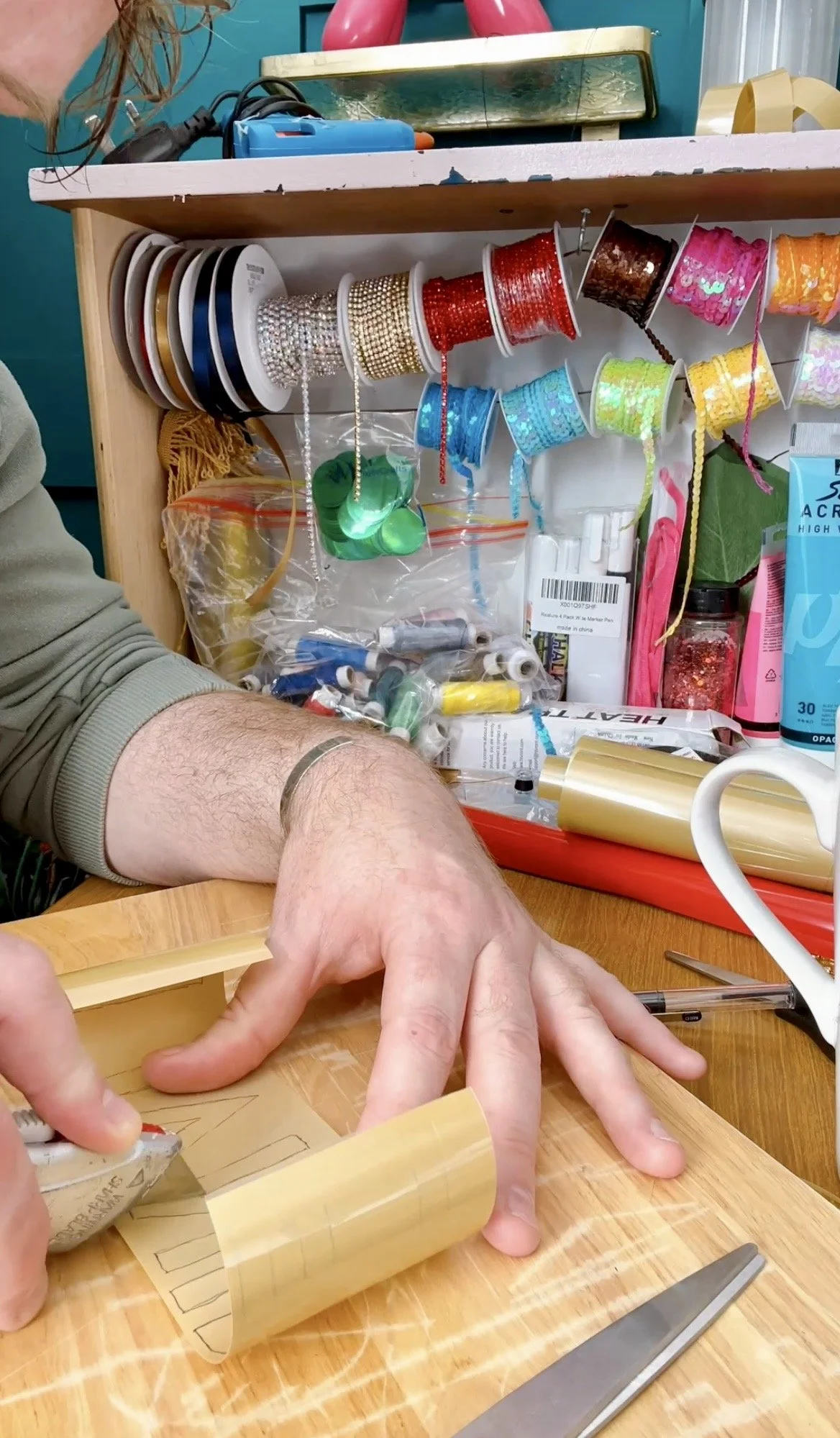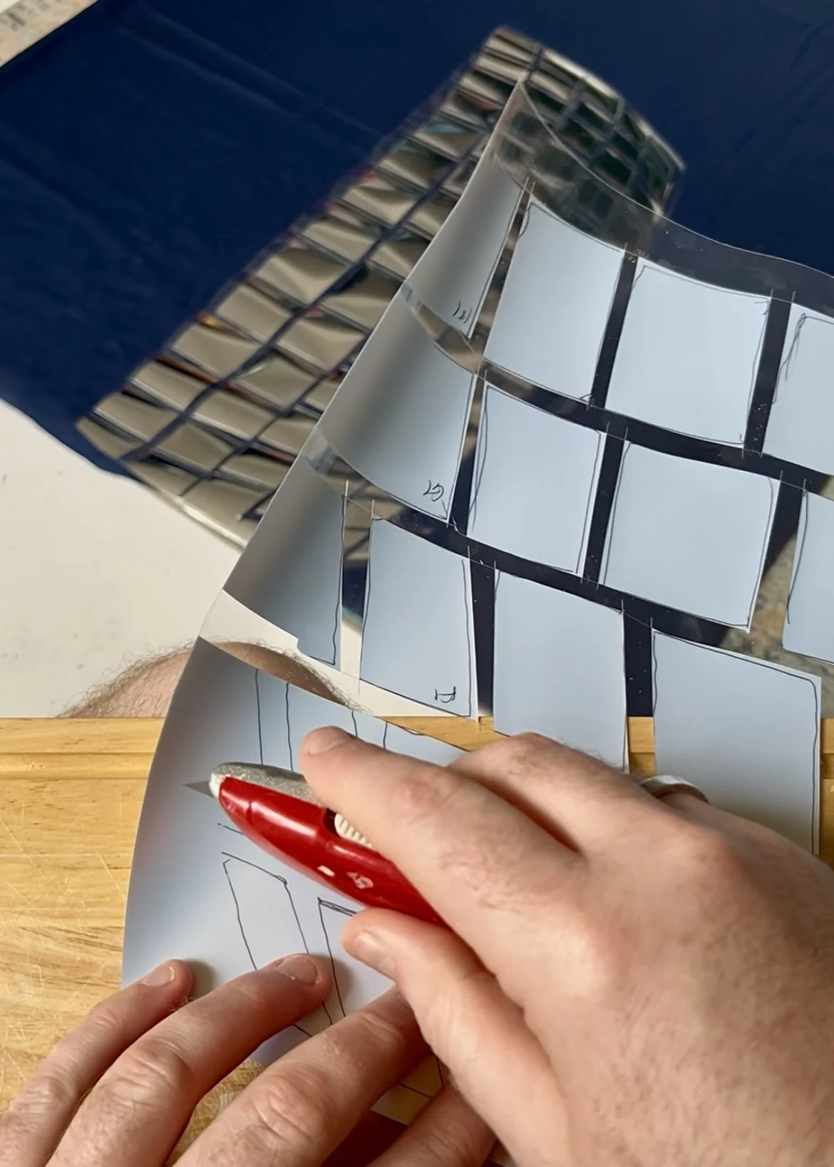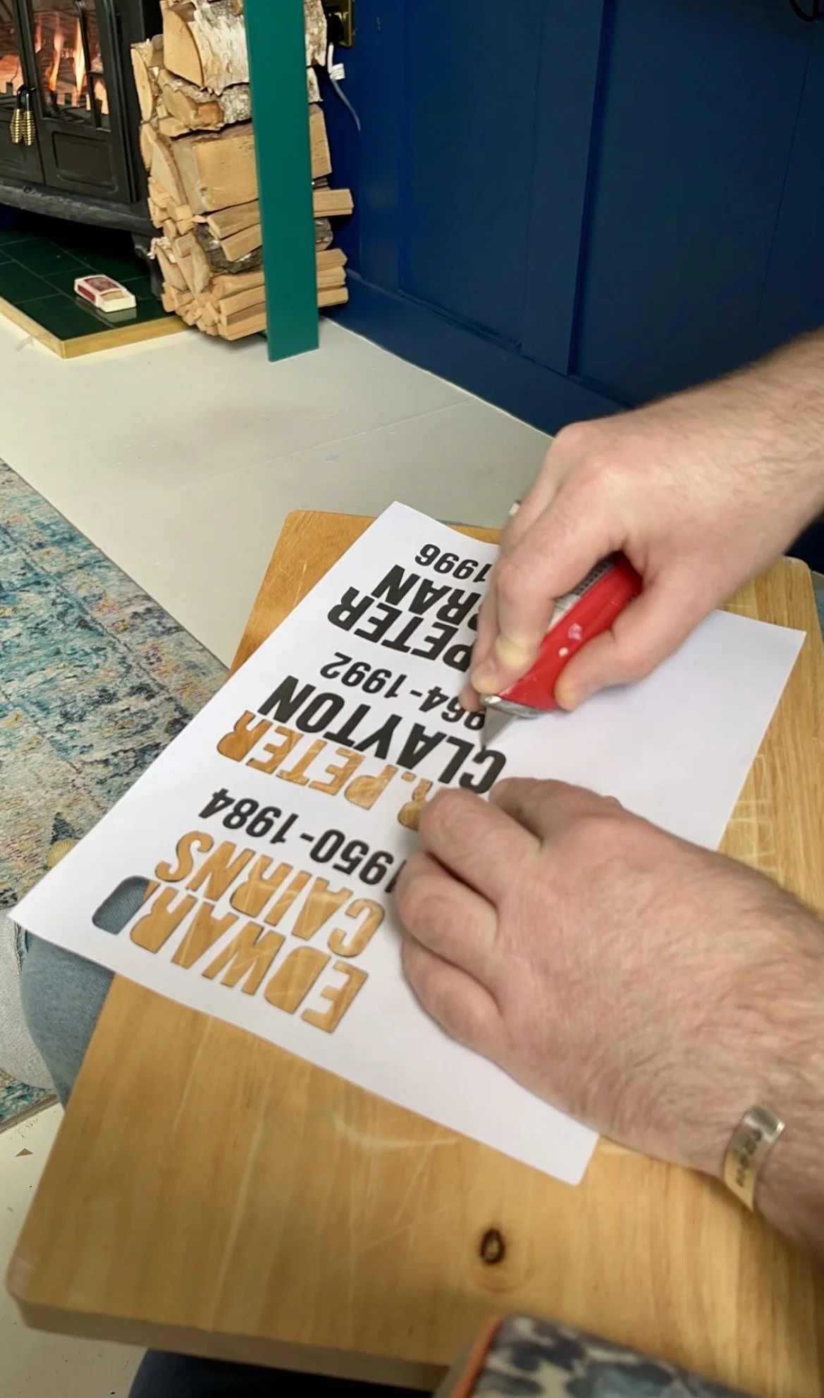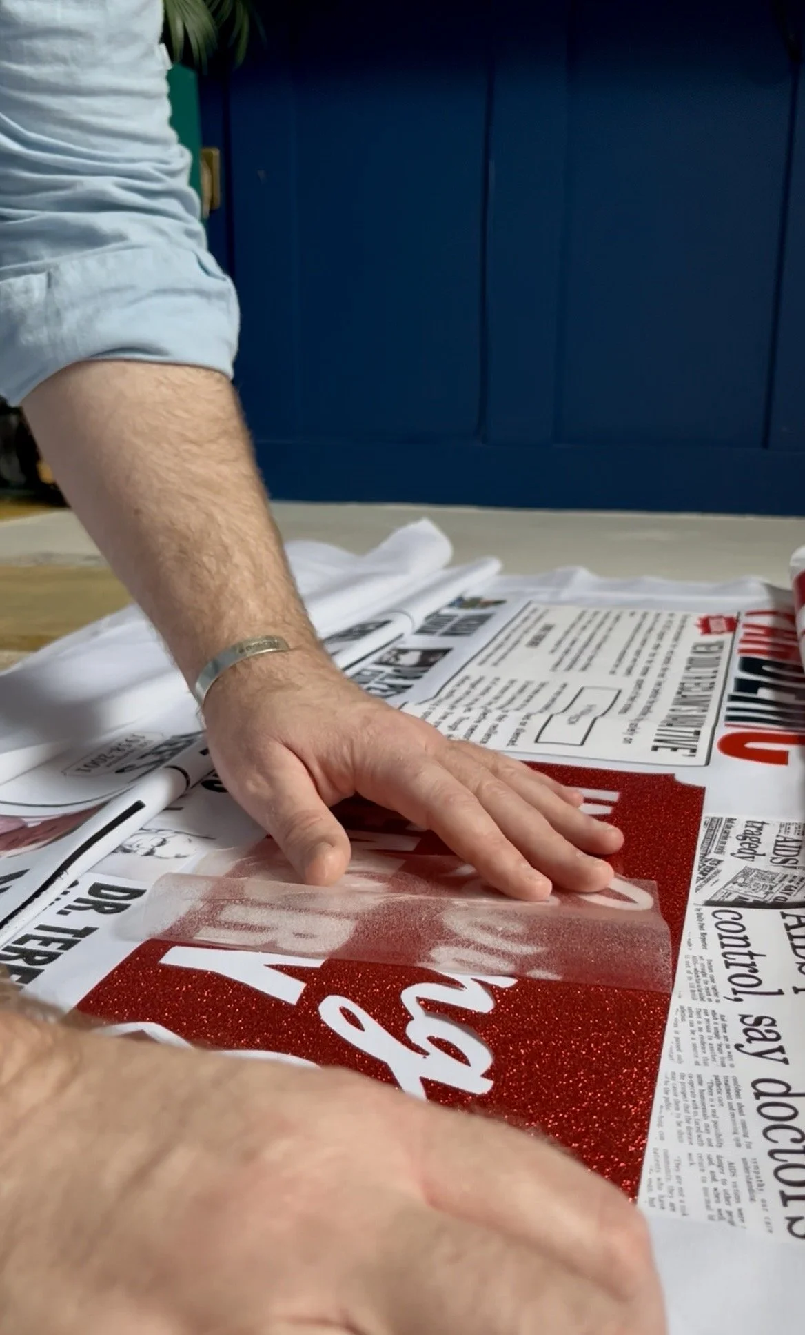 The names had all been hand-cut, which at first worried me — would a slightly imperfect curve make the whole thing look sloppy? But I could also picture the names if they’d been machine-cut, and realised the painstaking, fiddly handwork actually suited the quilt: it spoke of time and care invested in each person. Over hours I began to recall each of them having featured on my podcast, conjuring lives beyond the stories we told on air; the list became a quiet roll-call of people with histories and foibles we might never fully know. The layout hinted at the obituaries section of a newspaper, although this time on the front page and not toward the back. And where I couldn’t place a photograph I affixed a foam claret rose as a kind of stand-in for the modest clip art often found there in the 1980s and 90s. Their names were cut from black glitter vinyl — newspaper-print dark at a distance, but catching the light with a subtle twinkle — a small, moving sparkle to honour a life lived and equally a protest, but also a celebration of their life.