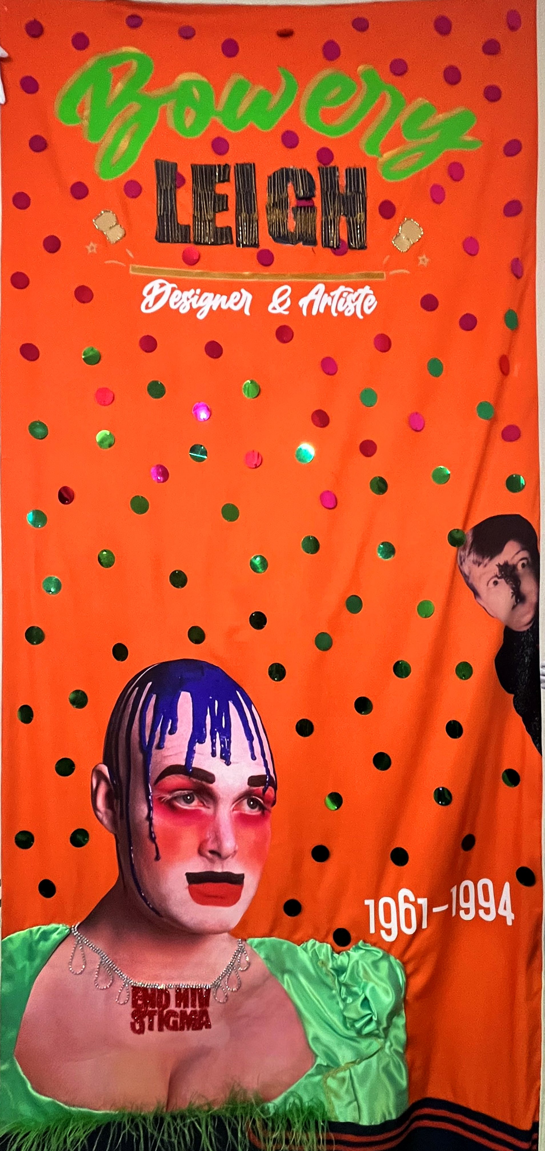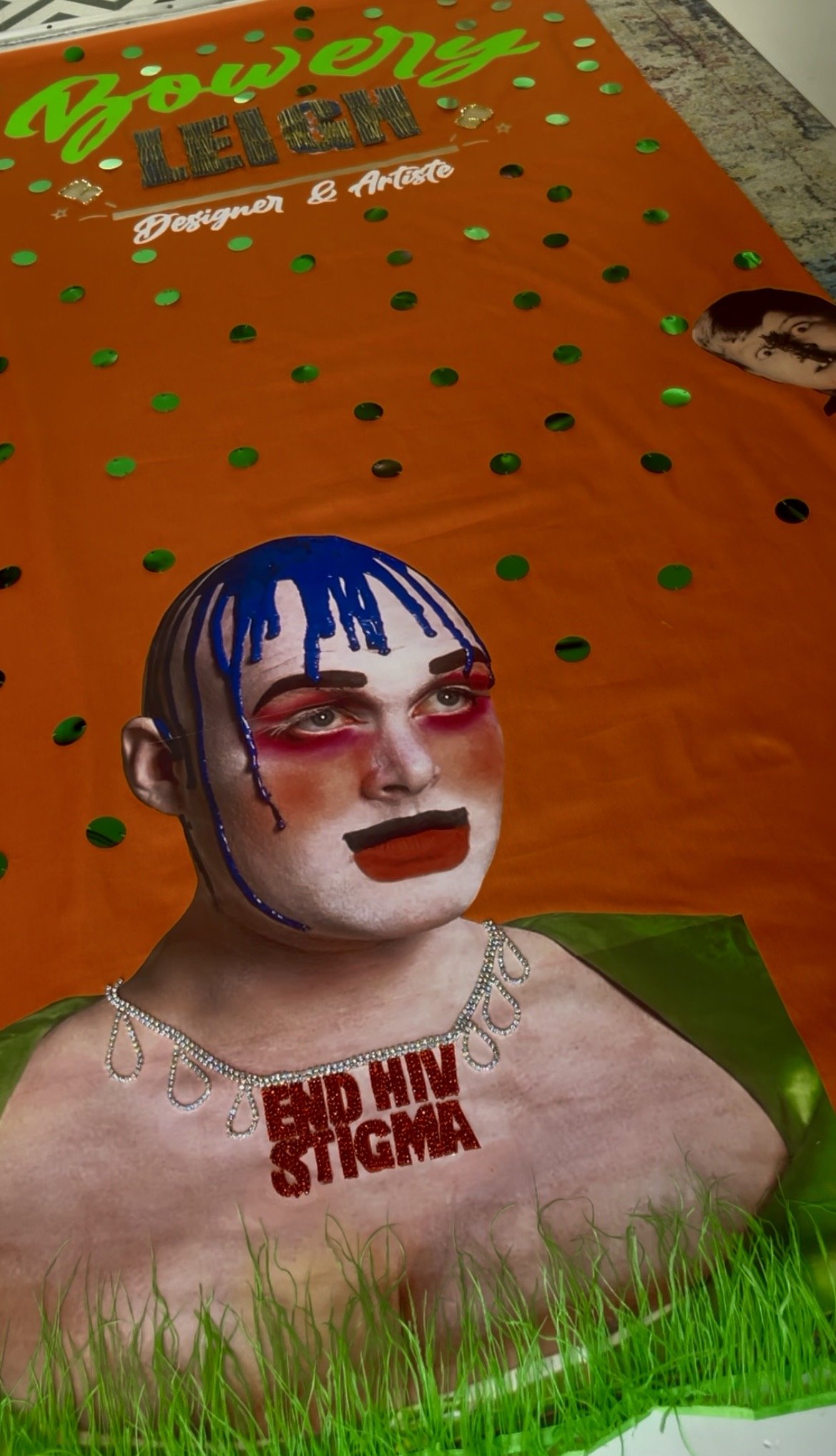 My idea was to keep things simple — not that Bowery could be mistaken for anything else — but to let his image do the talking, since he himself often reads like a piece of art. I chose an orange background to echo the colour of one of his best-known costumes and then inverted his usual foil spots into green, a deliberate nod to Kaposi sarcoma and the AIDS crisis that marked his life.