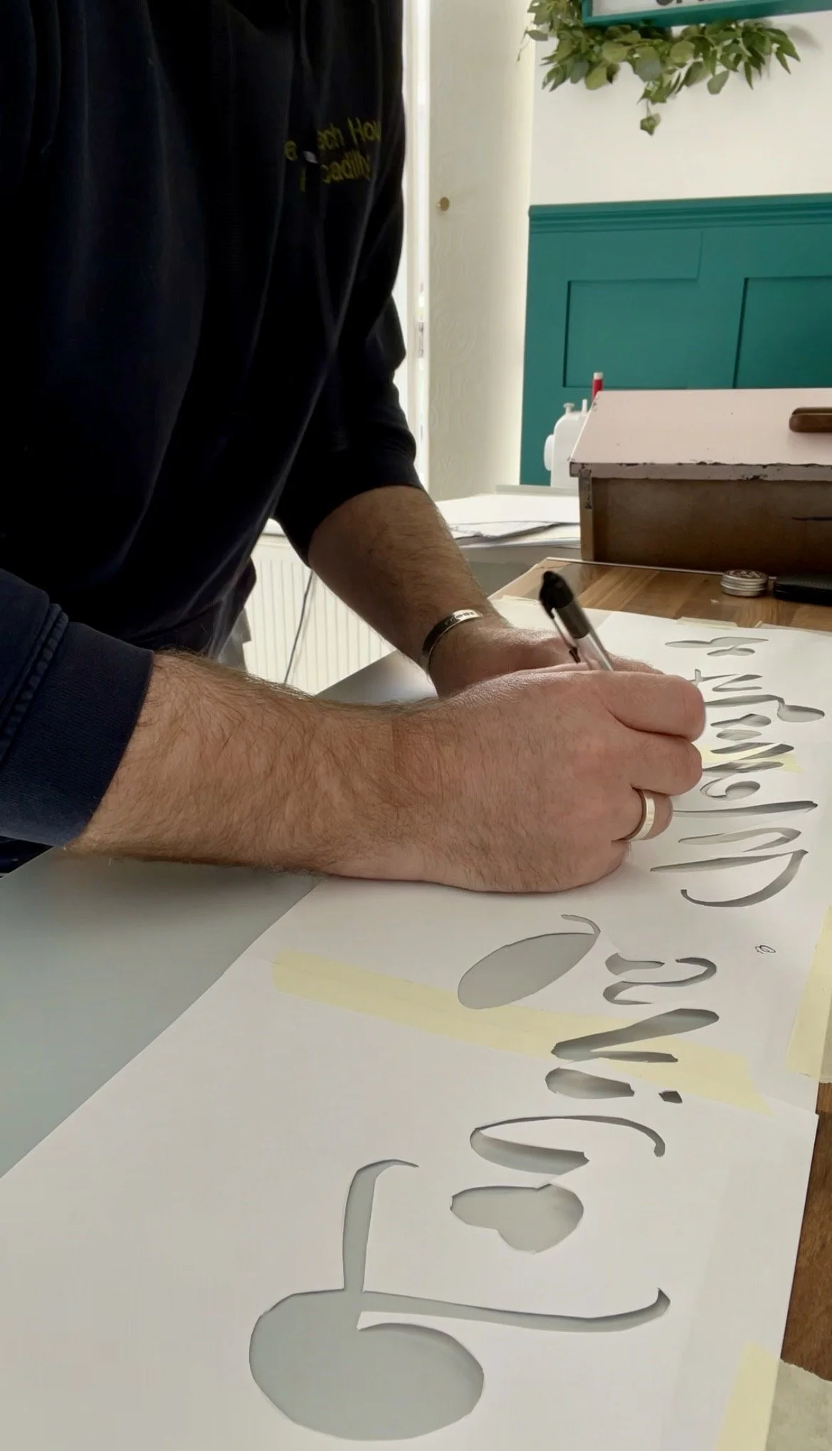 With Shane’s panel I deviated from my original sketch when it dawned on me that the Broderip Ward could be embodied by the fabric curtain that hung from the windows and wrapped the bed bays: a cream cloth stamped with a bottle‑green motif I had to recreate from photographs.