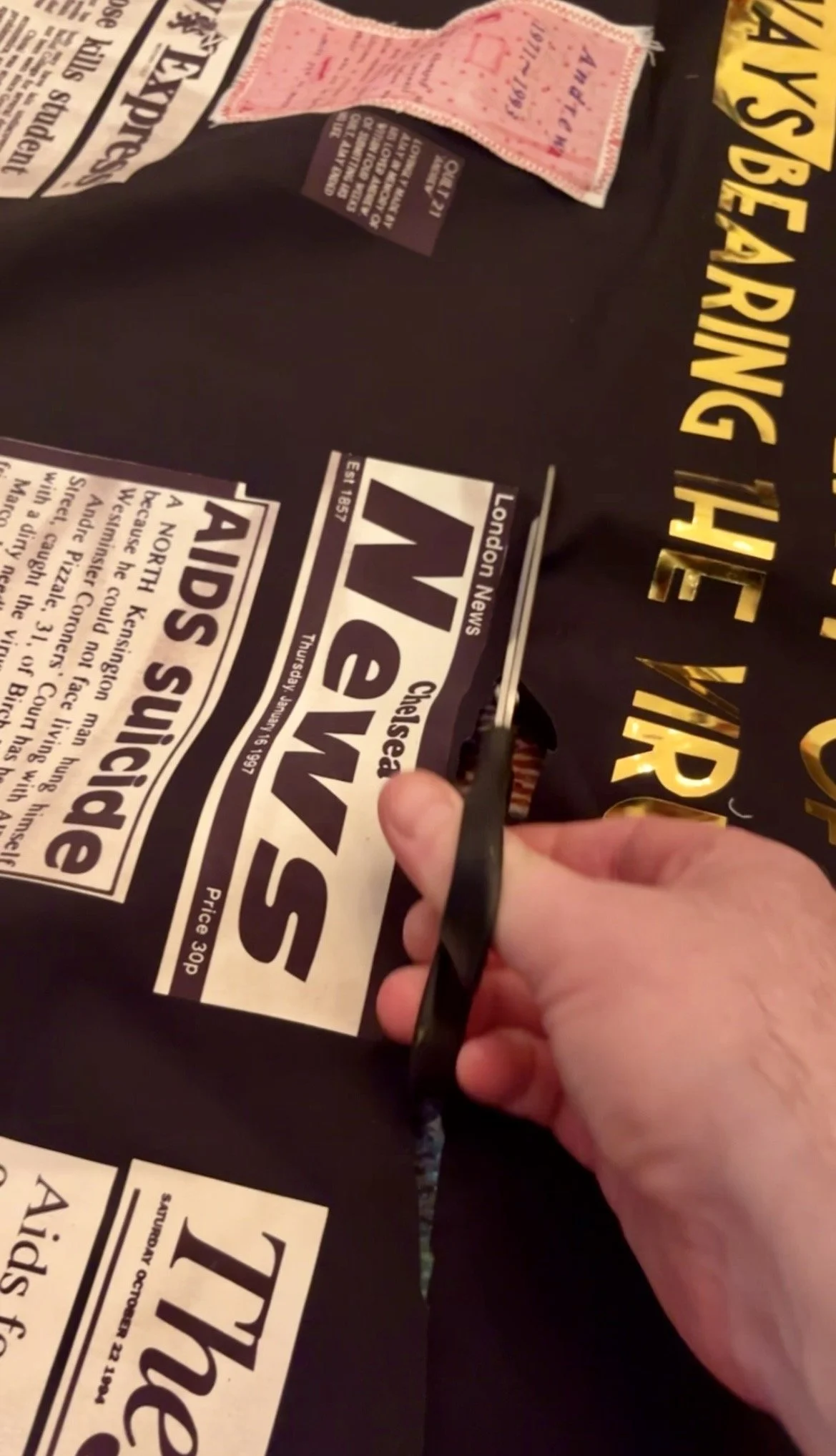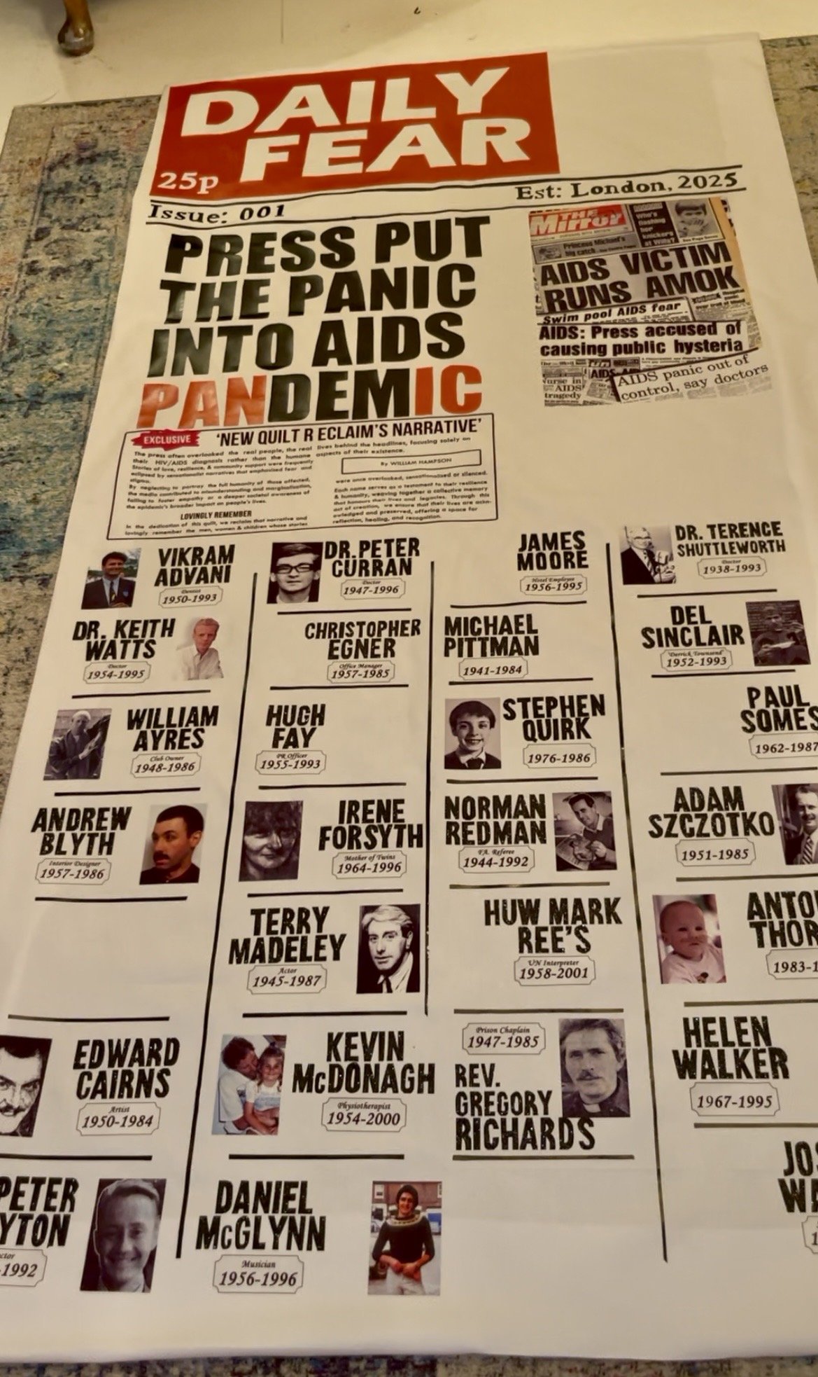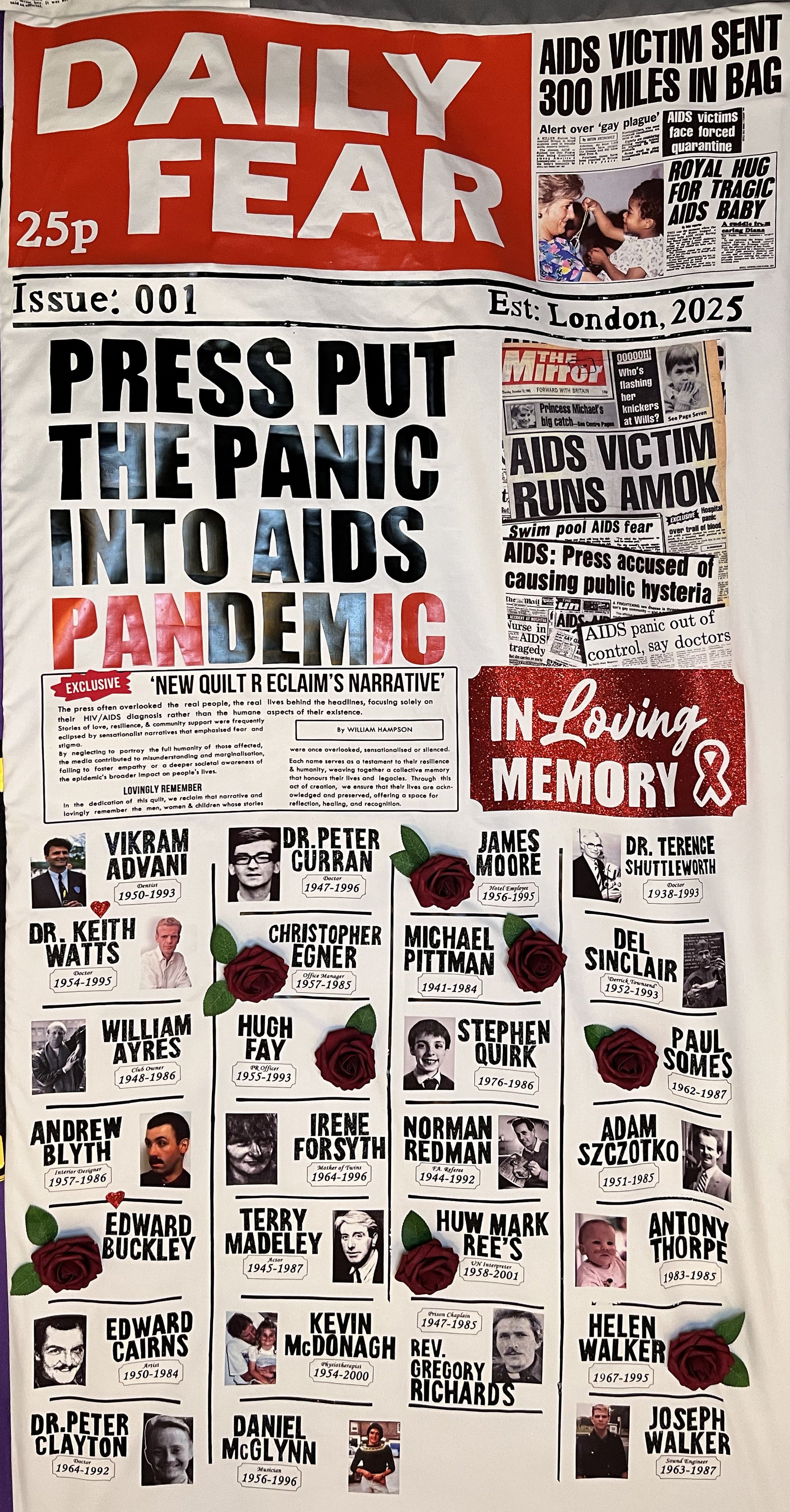 The panel’s purpose was to carry forward the spirit of the AIDS quilt’s origin: a protest. After all these years I wanted to create a protest that gave voice back to the people named underneath, to those who appeared in these newspapers and had their lives reduced to lurid copy — stories often, though not always, wildly oversensationalised — and to insist on their humanity against the glare of cheap panic.