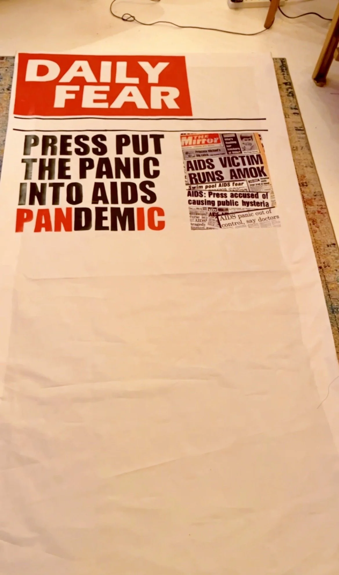 My initial sketch went for a tabloid ‘red top’ look — not just parodying the Mirror but riffing on a whole genre of sensationalist papers — headlined the ‘Daily Prejudice’, soon restyled to the blunt ‘Daily Fear’ above the fictional headline: “THE PRESS PUT THE PANIC INTO PANDEMIC”. It was as far as I could stretch my imagination to make the headline tabloidy, a deliberate nod to the alarmism that shaped the AIDS pandemic.