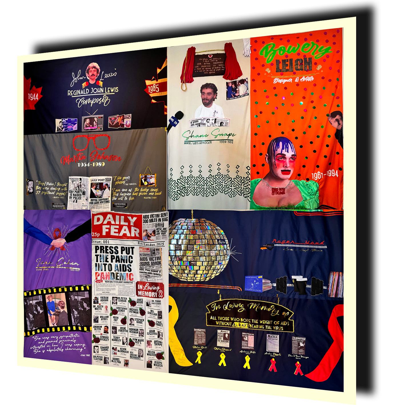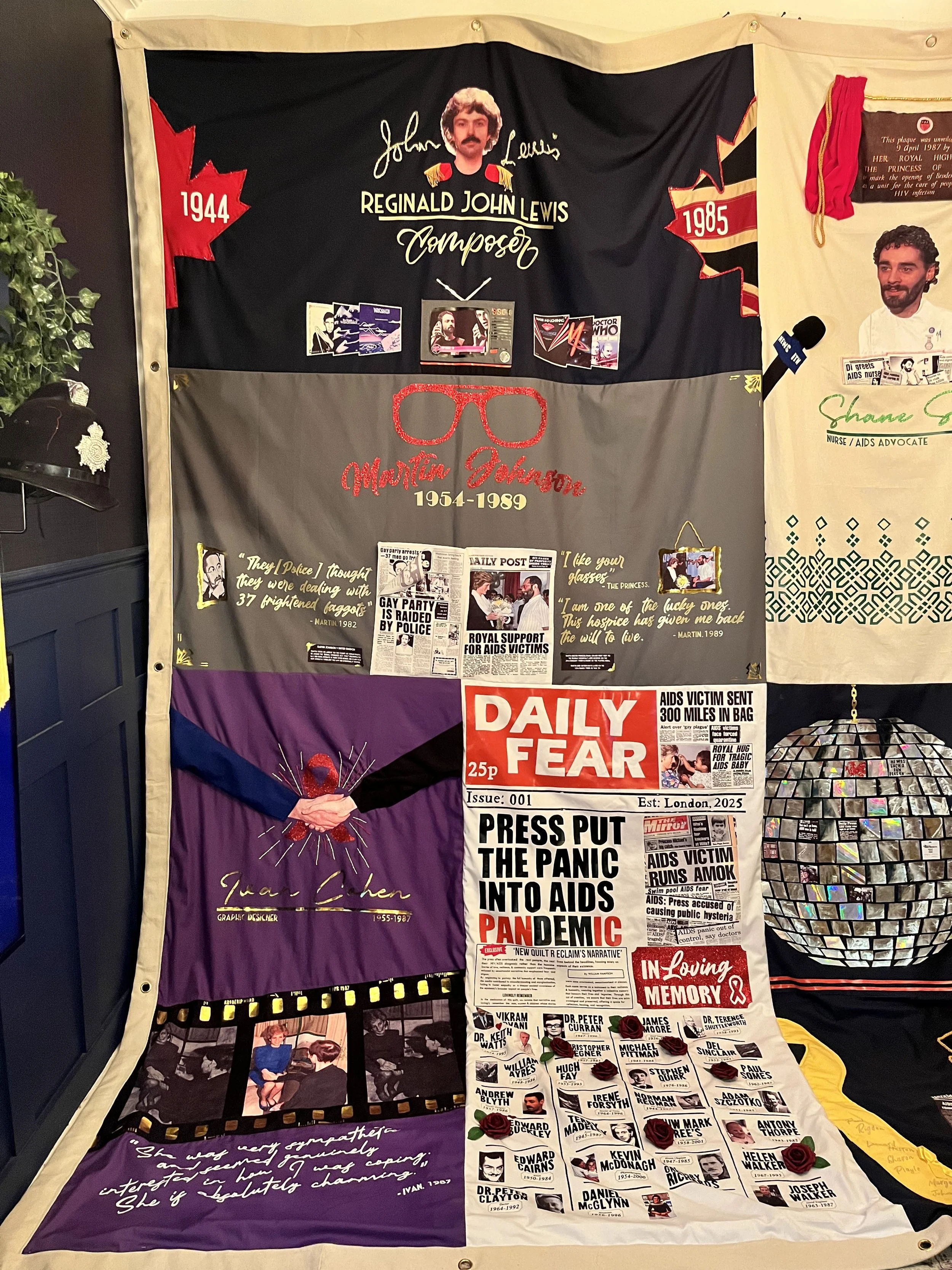 For World AIDS Day 2025 I undertook an eight‑week challenge to create eight new AIDS panels, each a piece of a single 12 ft by 12 ft display‑ready quilt intended to join the UK AIDS Memorial Quilt. The panels commemorated individuals featured in my podcast "AIDS: The Lost Voices" individuals uncovered through research and testimony, translating interviews, archival details and personal stories into stitched memory—imagery, names, dates and symbols chosen to reflect lives, activism and the quieter moments lost to the epidemic.