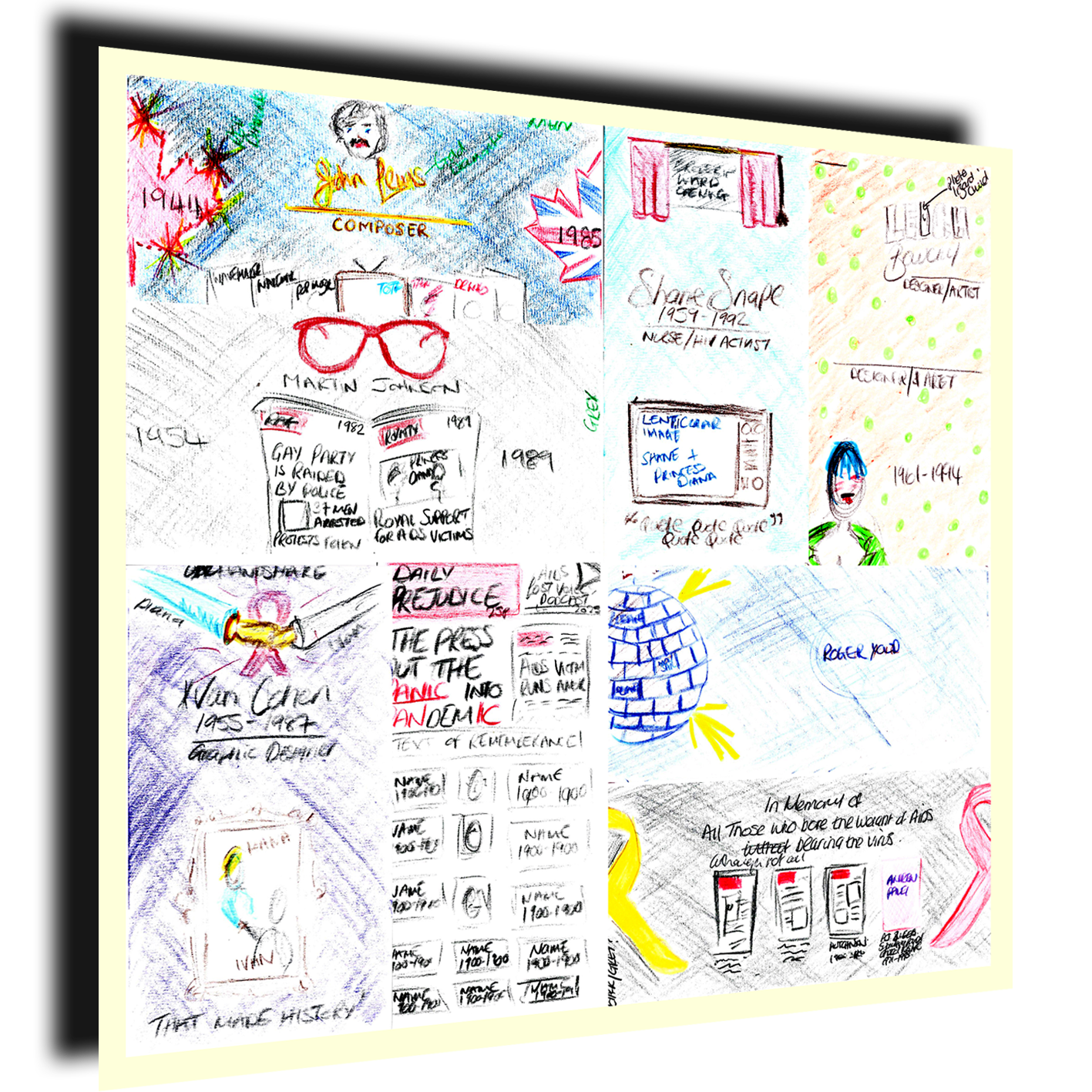Martin’s panel centred on the oversized red glasses in red glitter vinyl that caught the late Princess’s eye—“I like your glasses,” she remarked—a playful nod to his quirky, openly gay personality and his happy‑go‑lucky demeanour. Martin told the waiting press afterwards, holding his glasses aloft, “these were a hit.” I placed, at the centre of the panel, a newspaper conceived as if read through his own lenses, the front pages carrying headlines of the 1982 police raid and the 1989 meeting with Diana. Flanking that central image are two gold‑framed photographs: a portrait of Martin and a picture of him with the Princess, each accompanied by quotes from Martin and Diana that frame these moments both as a protest — his public fight for gay rights — and as a visible declaration by a young man living with an AIDS diagnosis in 1989. The panel offers viewers a concentrated glimpse of who Martin Johnson was, an invitation to be intrigued and to seek out his fuller story.